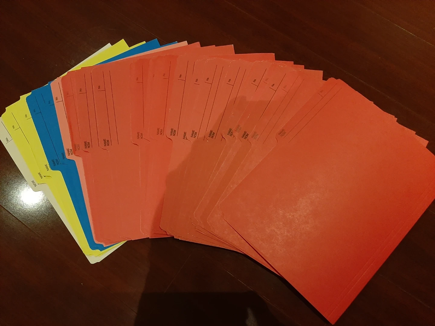 31 coloured file folders. Great condition. Various colours including red, pink, yellow, and blue. Great for organizing documents. Pick up Scarborough (Sheppard/Nielson)