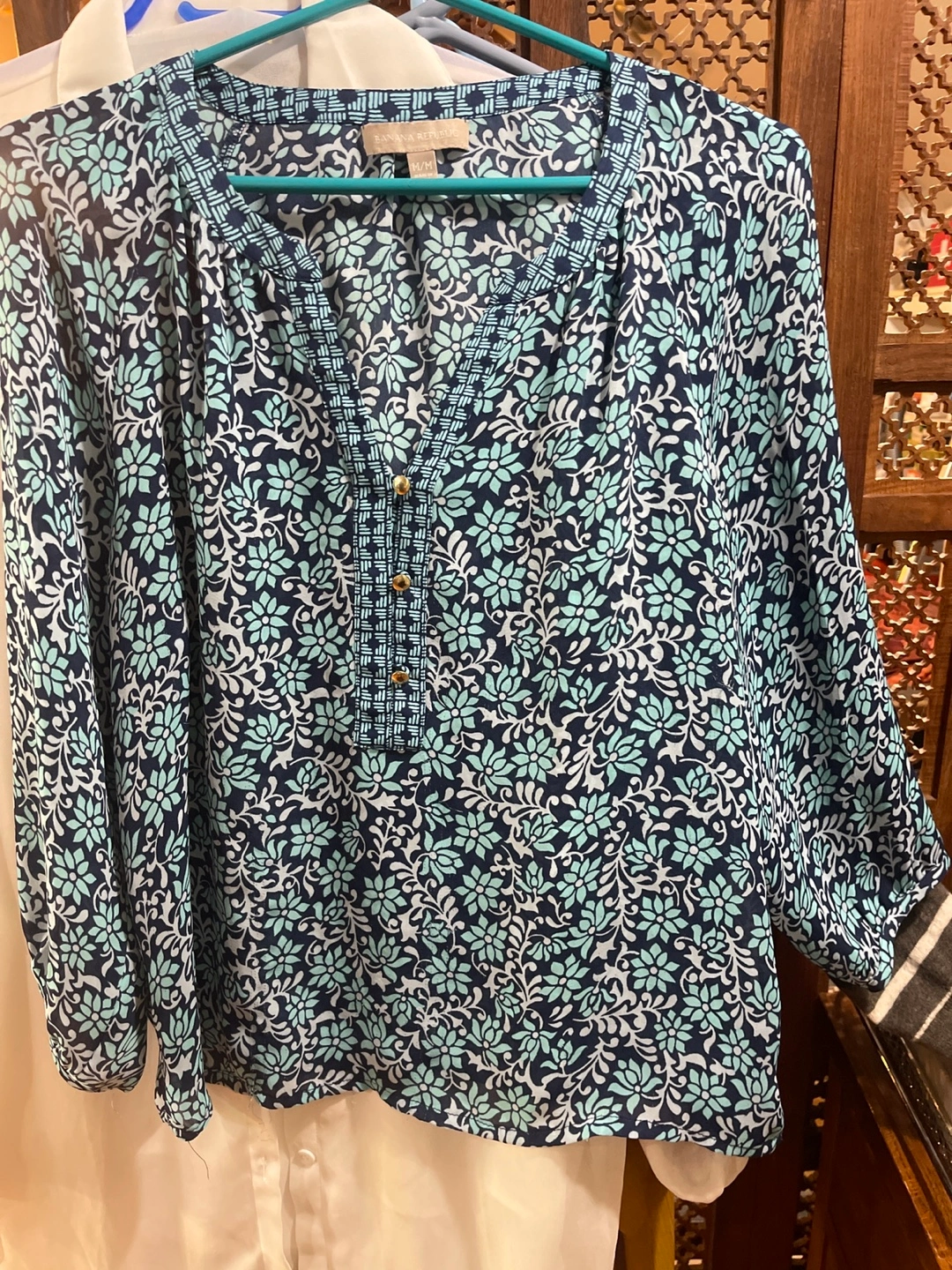Beautiful floral blouse. Navy and teal colours. Long sleeves. Size medium. Button closure. Porch pick up keele and Bloor