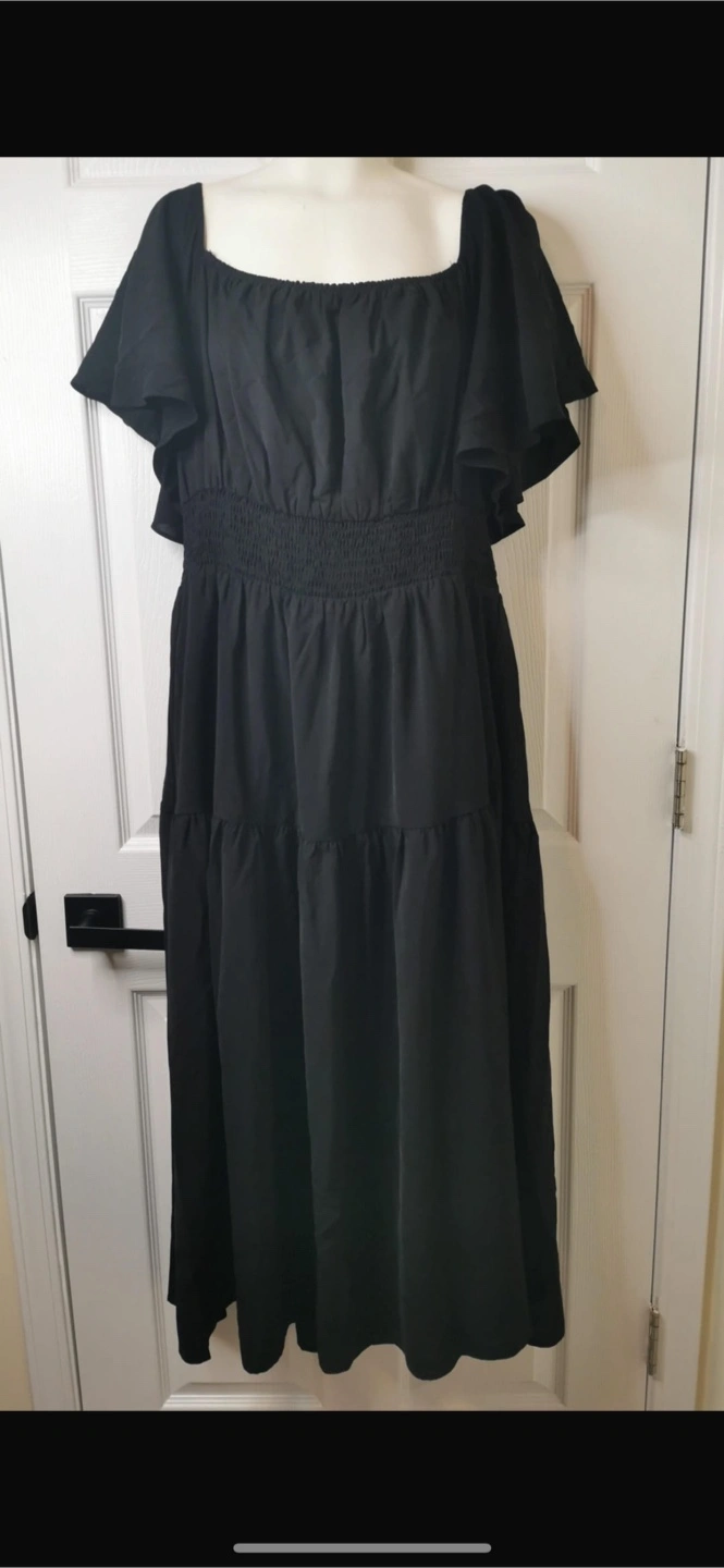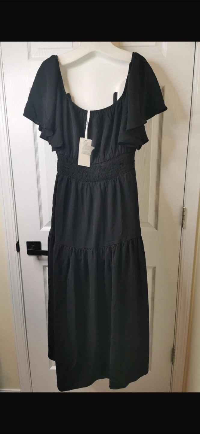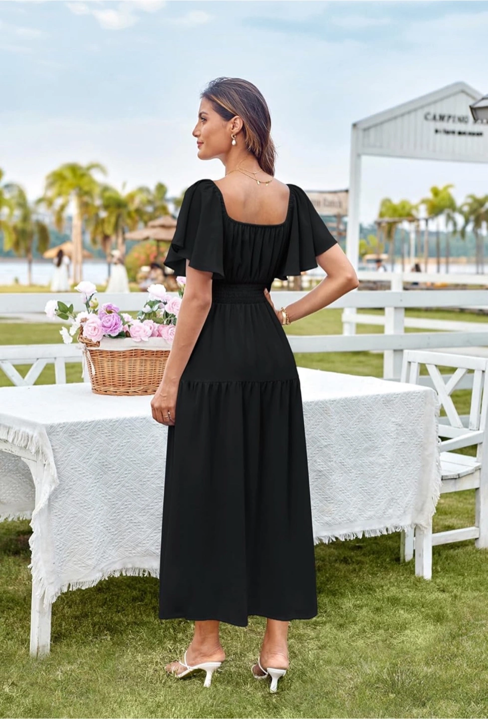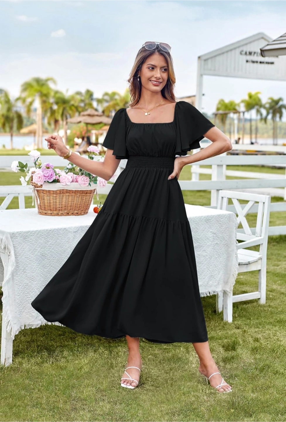 New with tags! Retails for $59 Elegant black midi dress. Features flutter sleeves and a tiered skirt. Elastic waist. Perfect for various occasions. [ELEGANT DESIGN]: This A-line dress features a square neckline, short flounce sleeves, and a tiered skirt for a flattering and feminine silhouette. The smocked waist adds definition and comfort to your figure. [VERSATILE STYLE]: Perfect for various occasions, this midi-length dress can be dressed up or down. Wear it to summer weddings, garden parties, beach outings, or casual weekend brunches. [COMFORTABLE FIT]: Made from a soft blend of 98% polyester and 2% viscose, this dress offers breathability and ease of movement. The pull-on closure ensures hassle-free dressing.