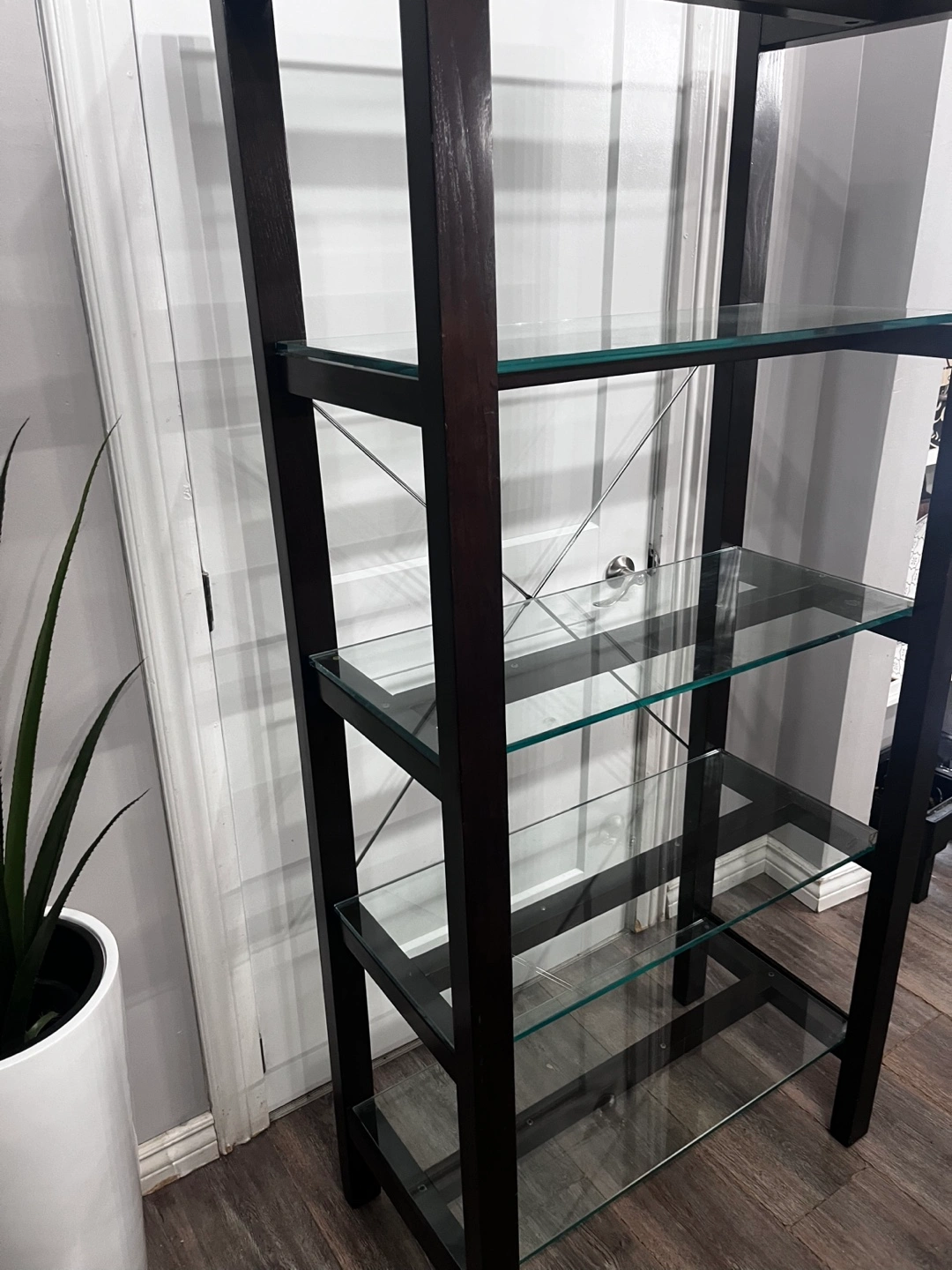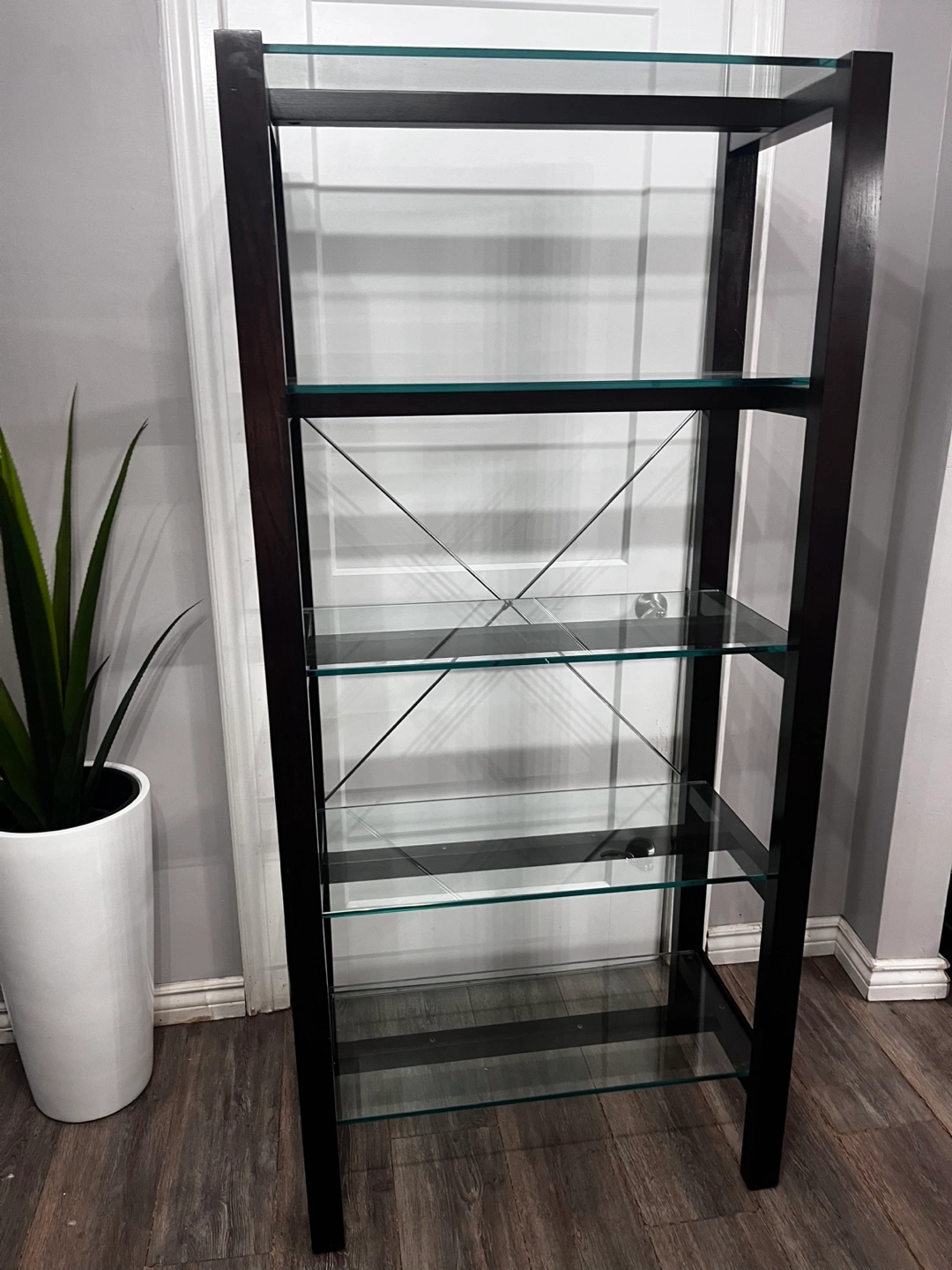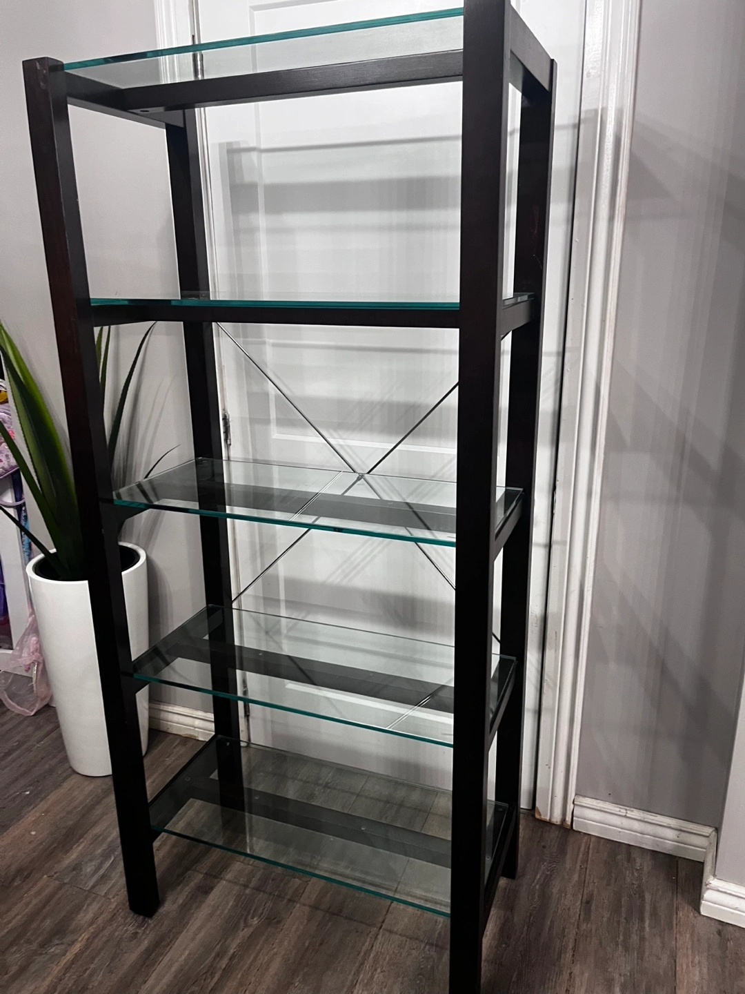 Price is firm Five-shelf shelving unit. Dark brown wood frame. Tempered Glass shelves. Metal supports. Great for displaying items or storing books. Measures at 30” W x 16” D x 65.25” H. Pick up only. Closest intersection is Jane St and Eglinton Ave