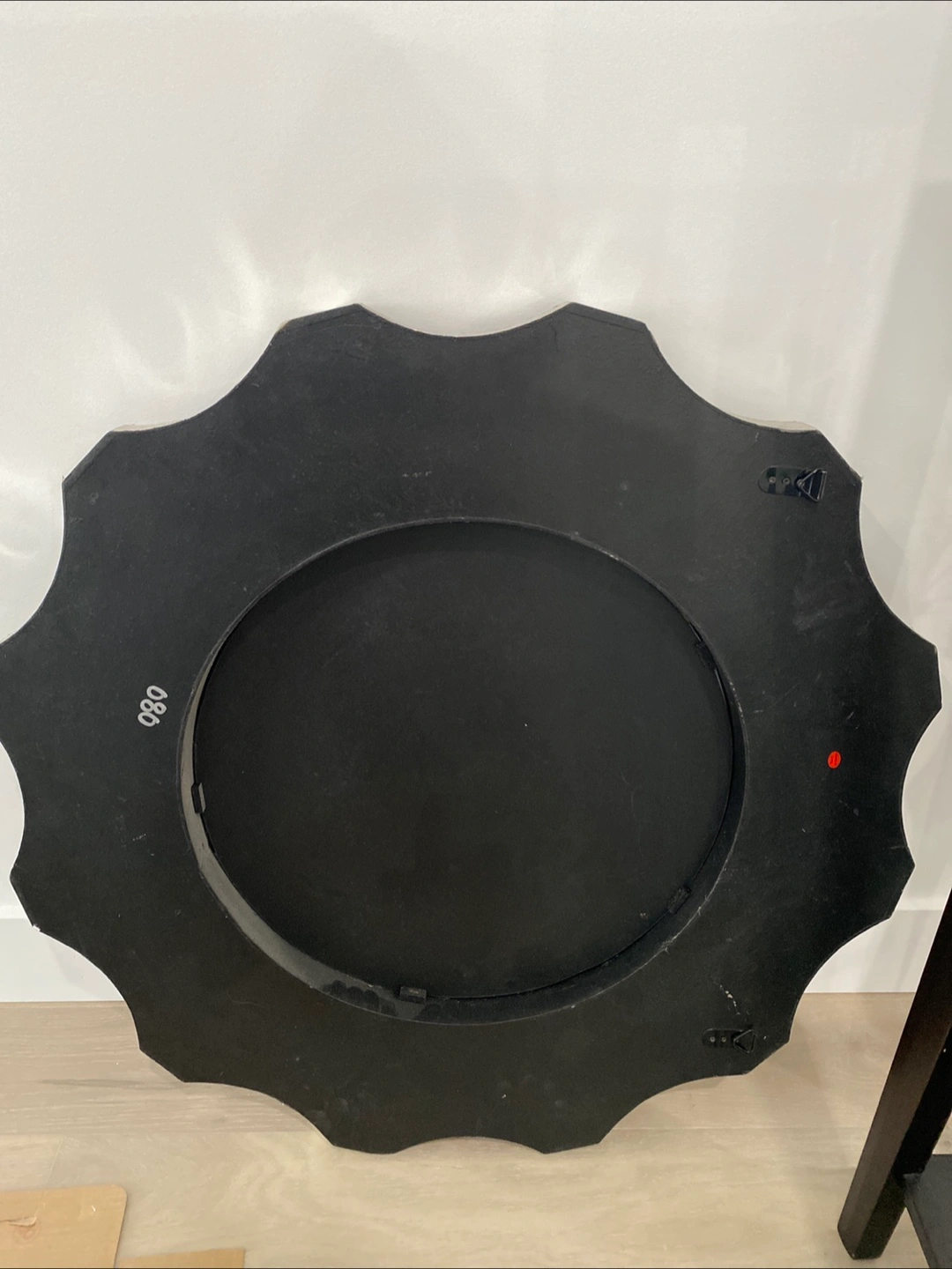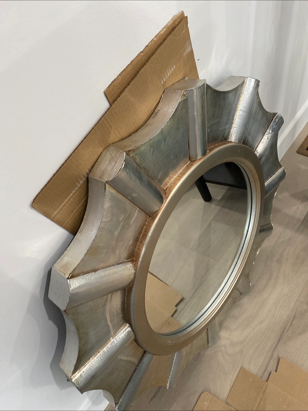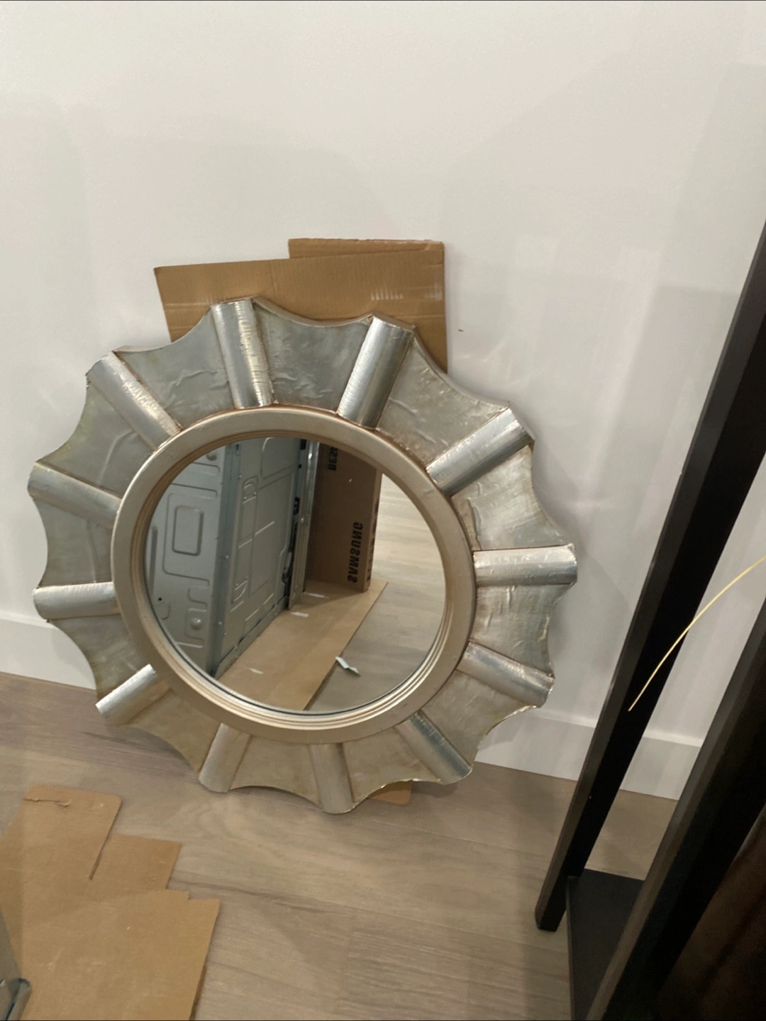 Beautiful silver sunburst mirror. Round mirror with a unique, decorative frame. Perfect for adding a touch of glamour to any room.