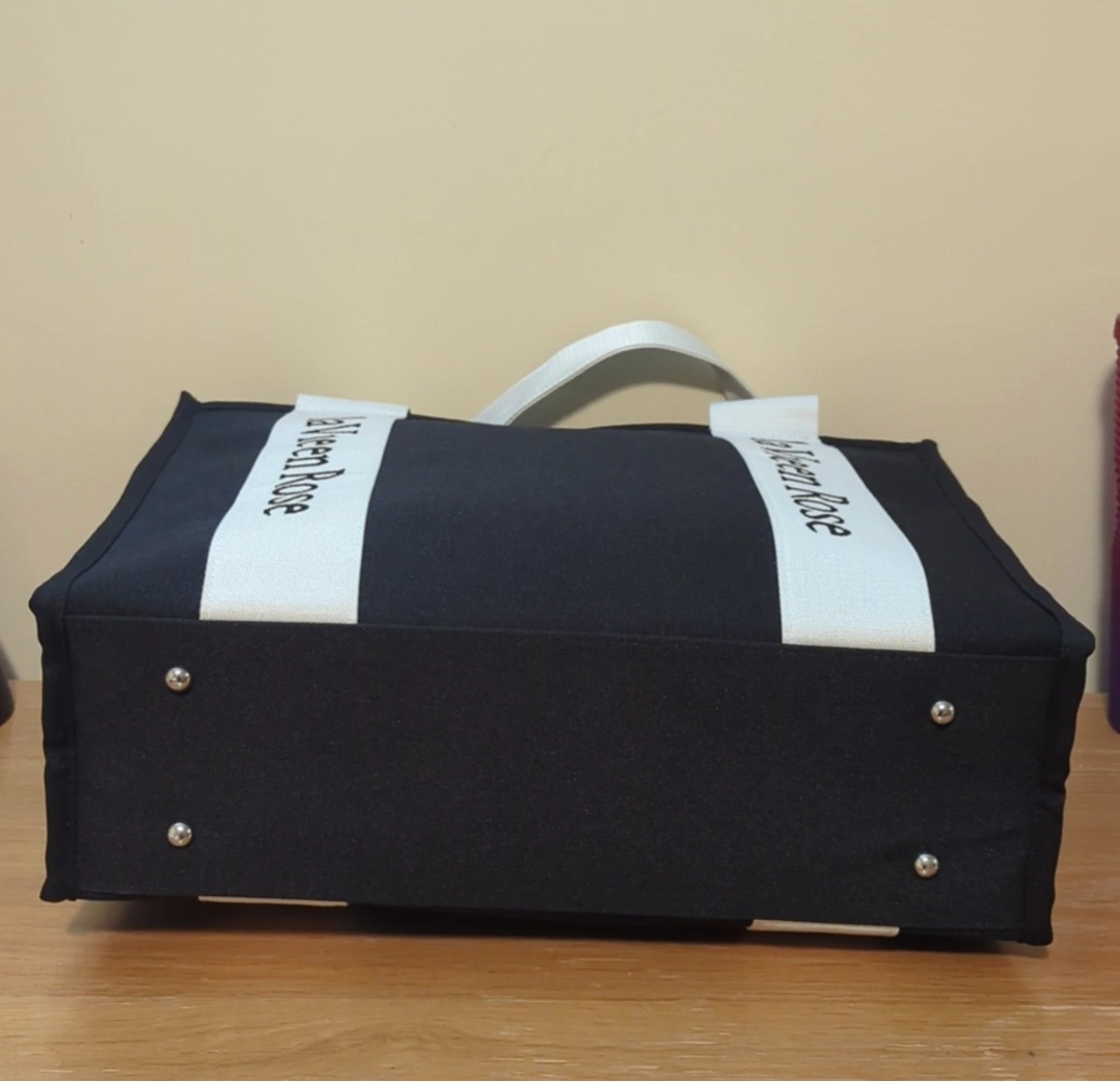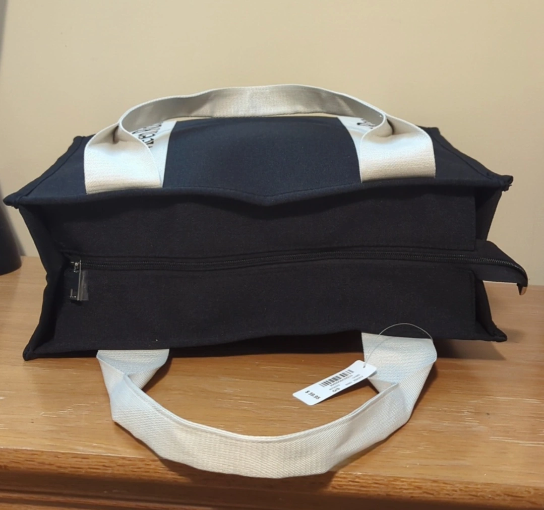 Black tote bag with white side panels. Features the brand name on the sides. Zip closure. Two sturdy handles. Brand new with tag.