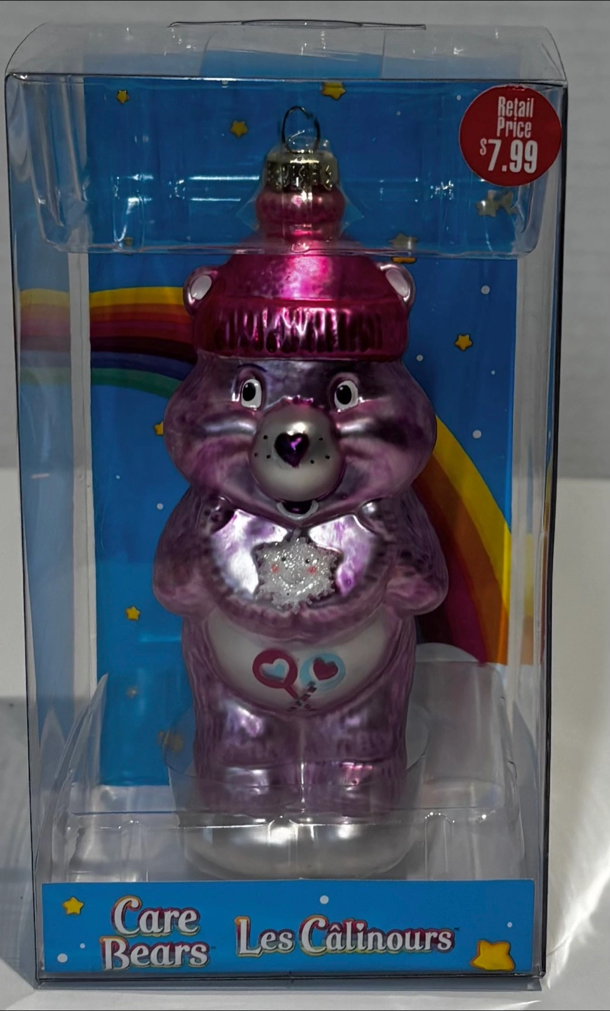 Glass ornament. Features Share Bear wearing a pink winter hat. Packaged in a clear plastic box. Collectible item. Decorative use only.
