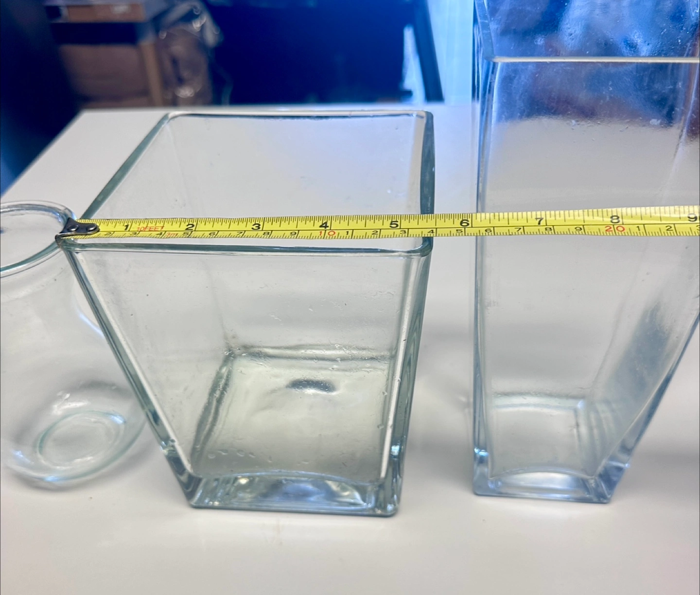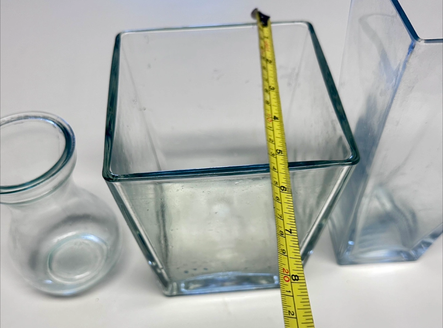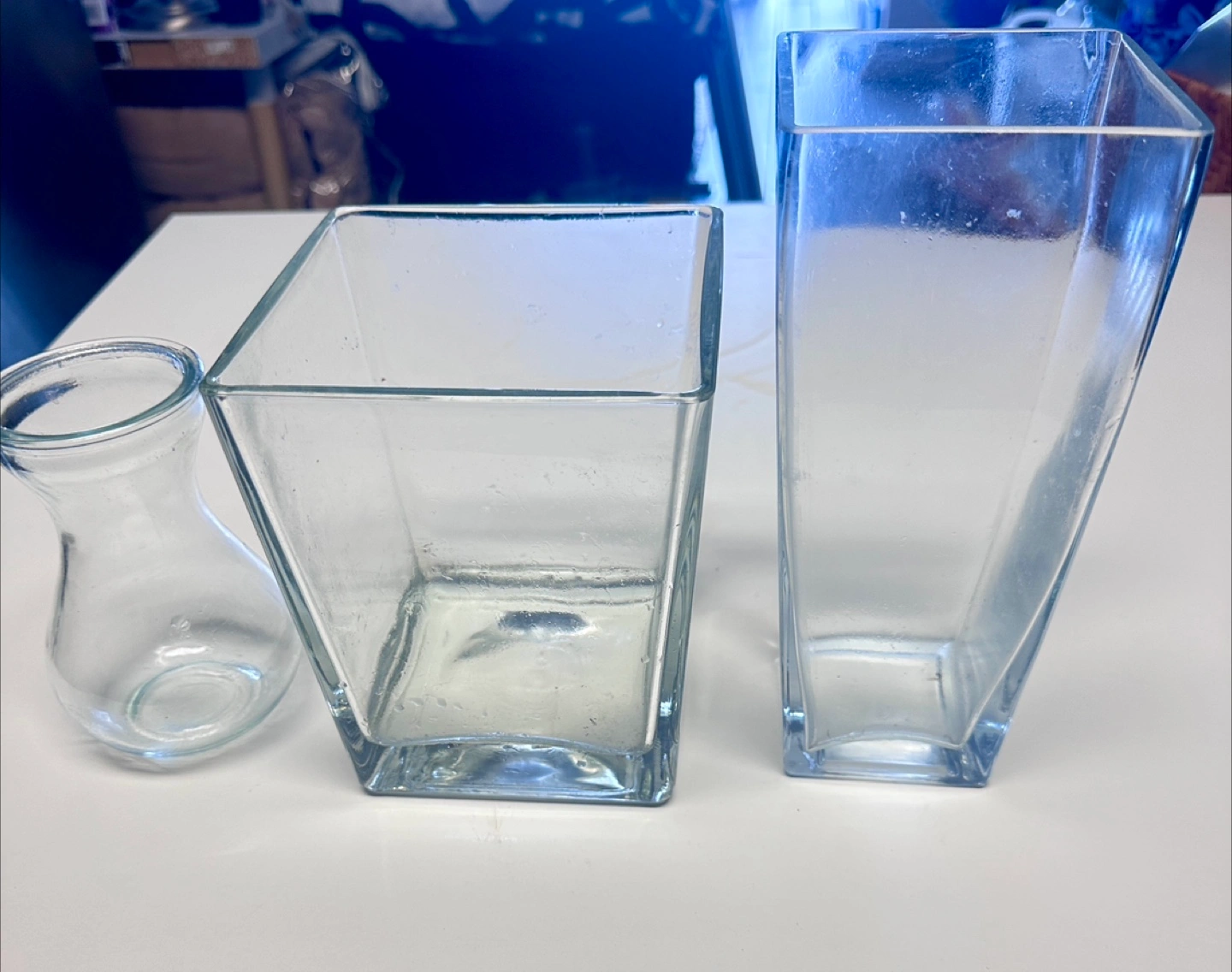 Three clear glass vases, varying sizes and shapes. Square and rectangular designs. Perfect for home décor or floral arrangements. Good condition. Price is for each
