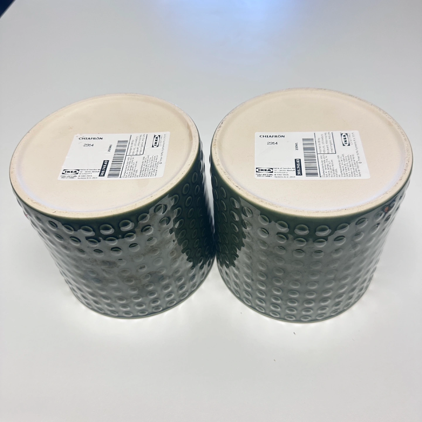 Two dark green ceramic pots. Indoor outdoor Small raised circles decorate the surface. Approximately 8cm diameter and 10cm tall. Excellent New condition. From pet/smoke free home Cash and carry