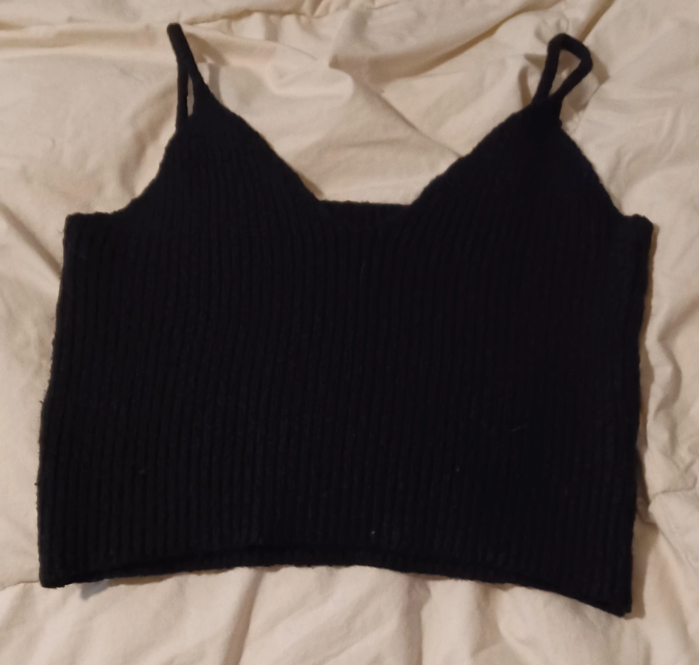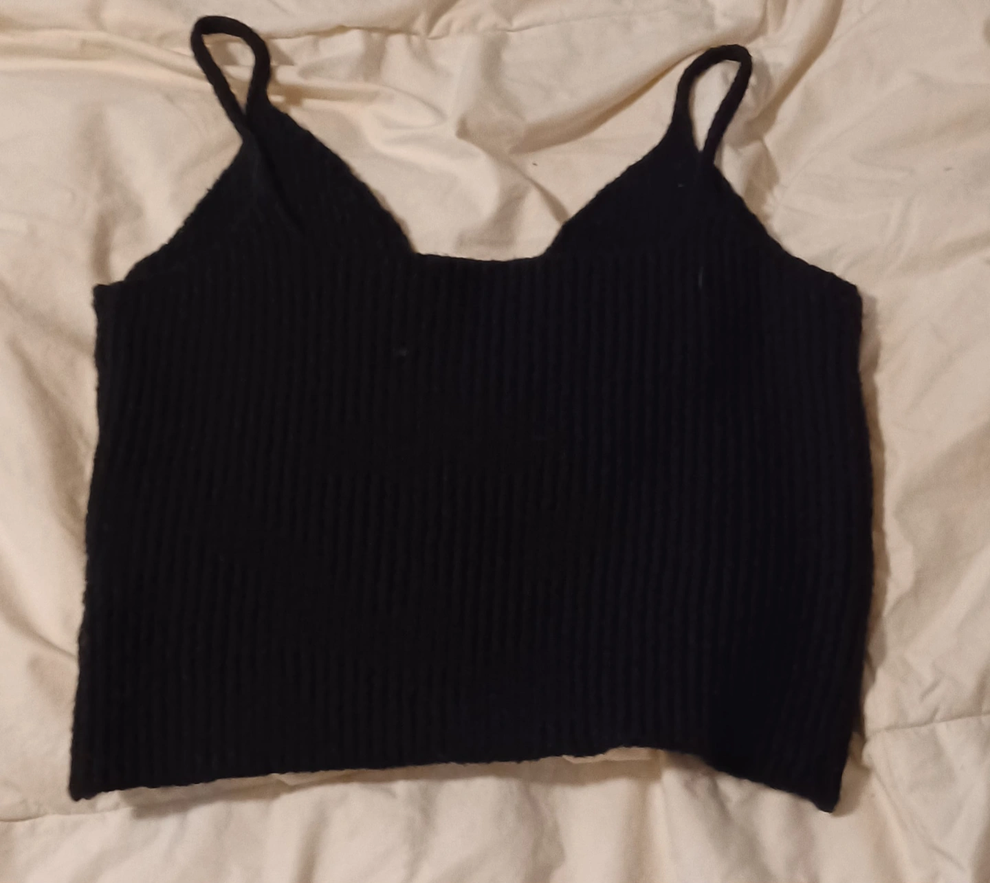 Black ribbed knit crop top. Spaghetti straps. Great for layering or wearing on its own. Soft material. Can be quite warm.