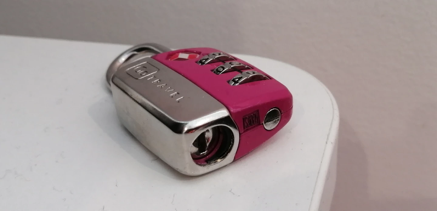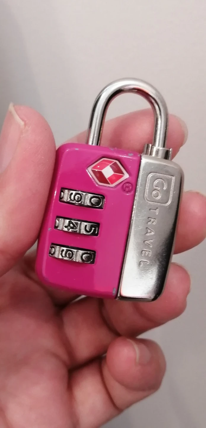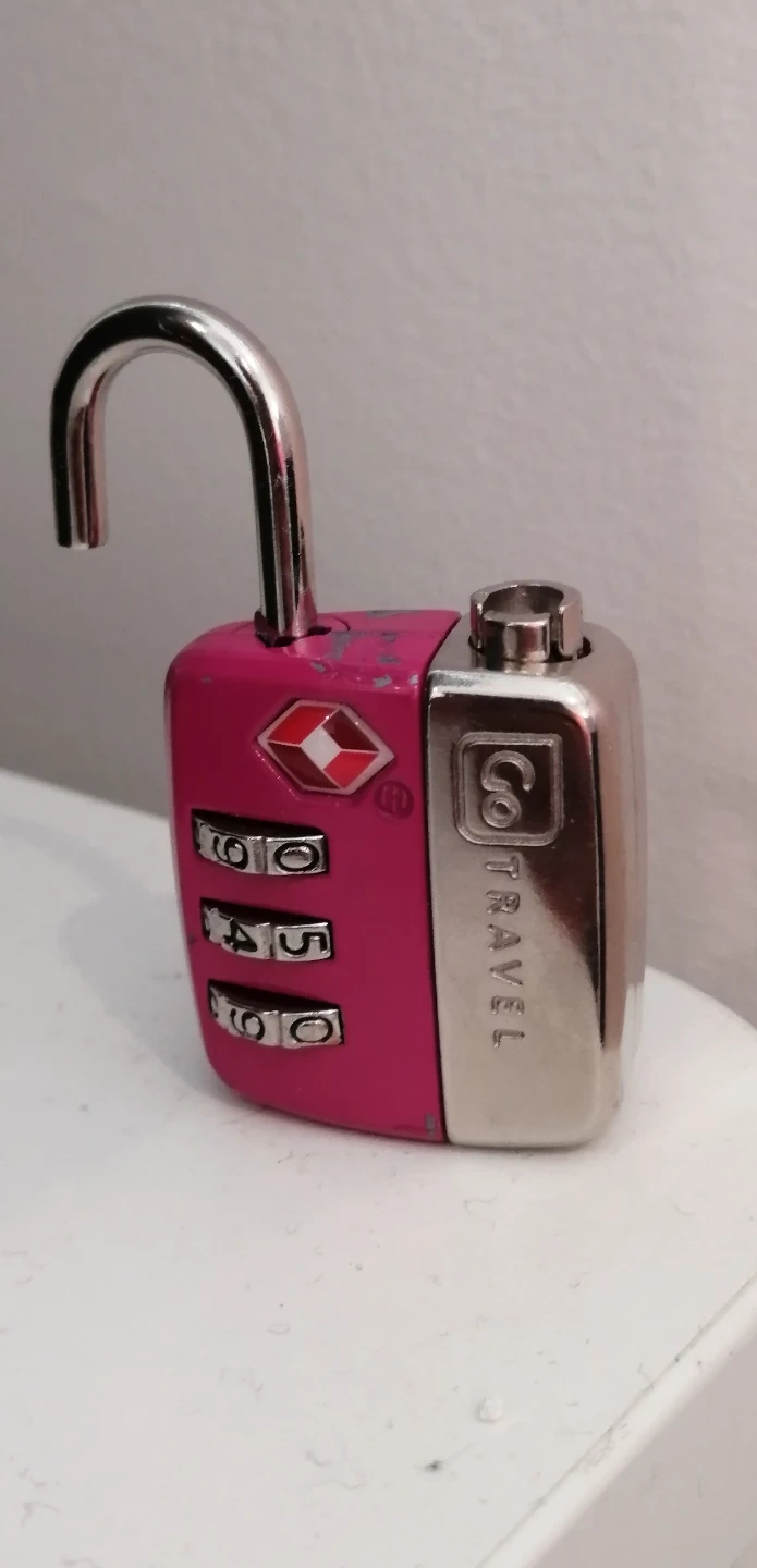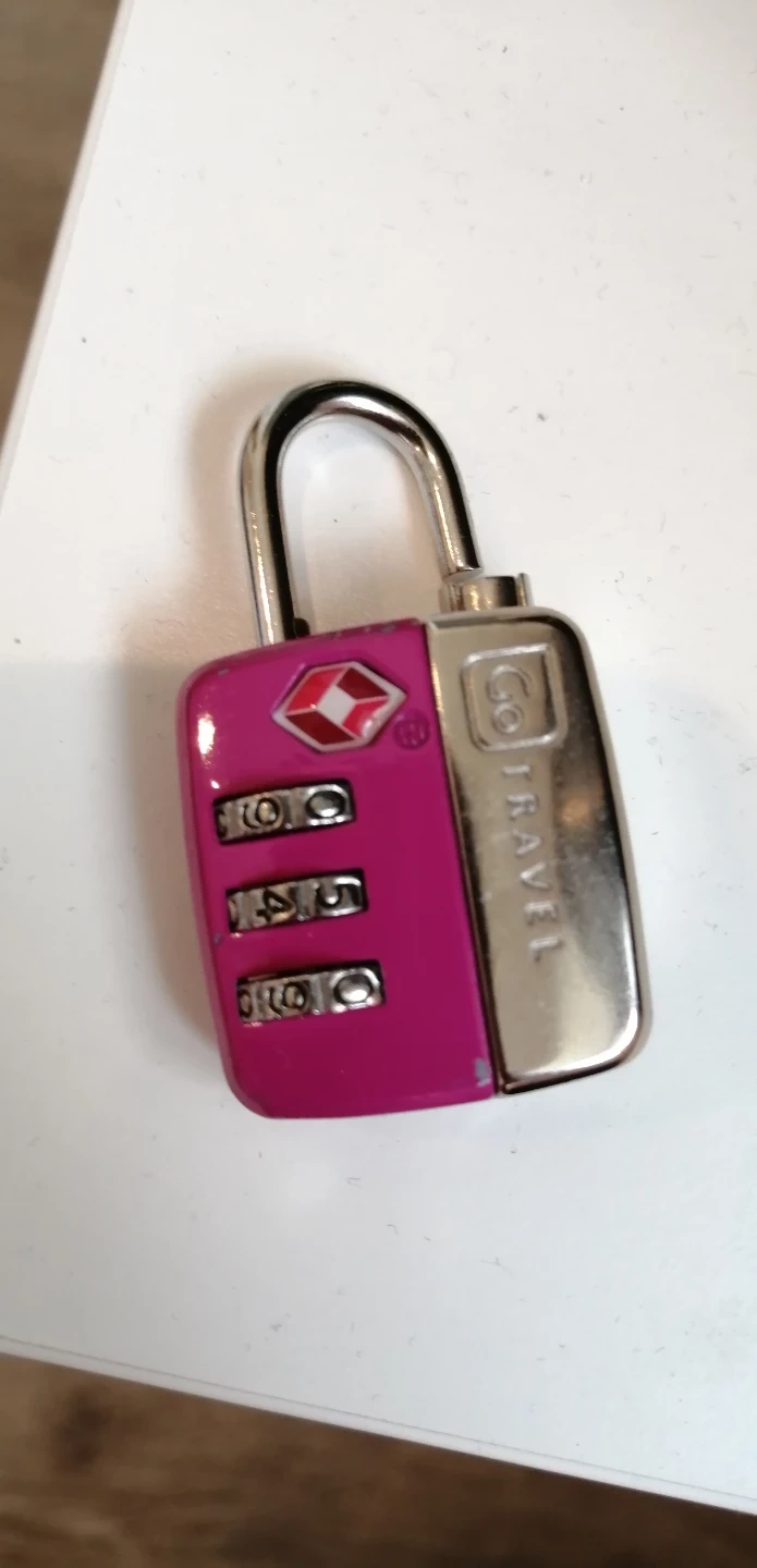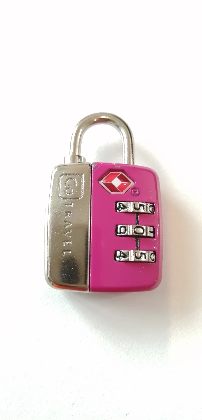 Small pink combination padlock. Metal body. Three-number combination. Good for luggage. From smoke and pet-free home Paid $19 + tax at airport