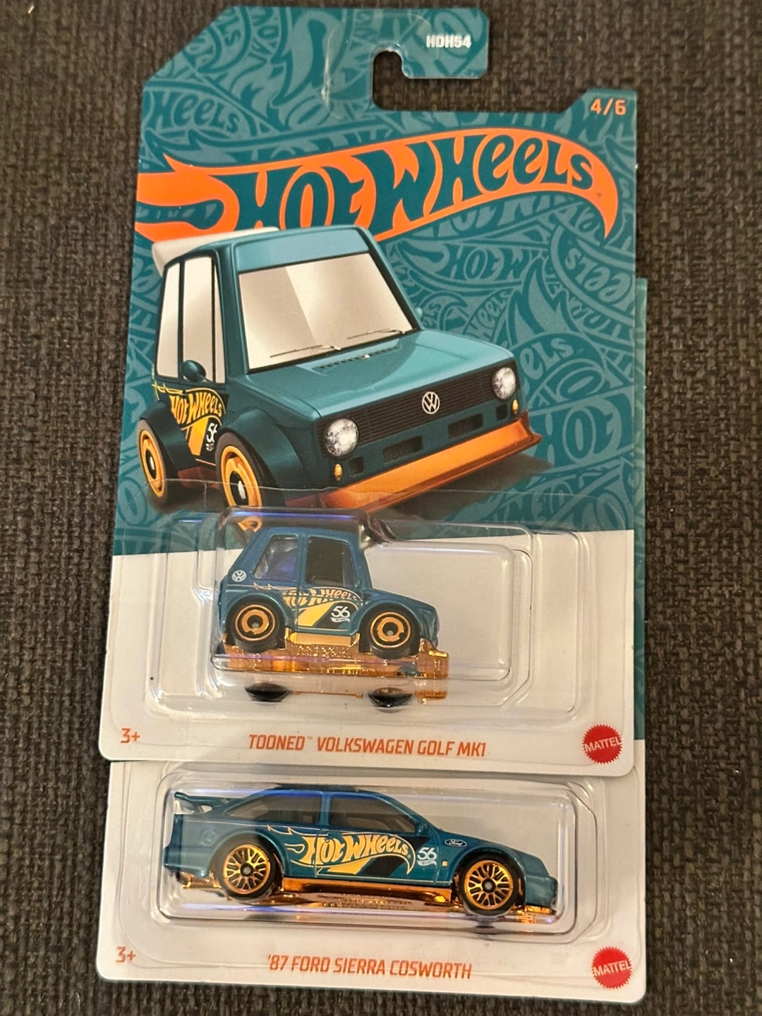 Two Hot Wheels cars. Teal Volkswagen Golf and Ford Sierra Cosworth. Gold accents. Collector's edition. Prices for each car. Price is for each