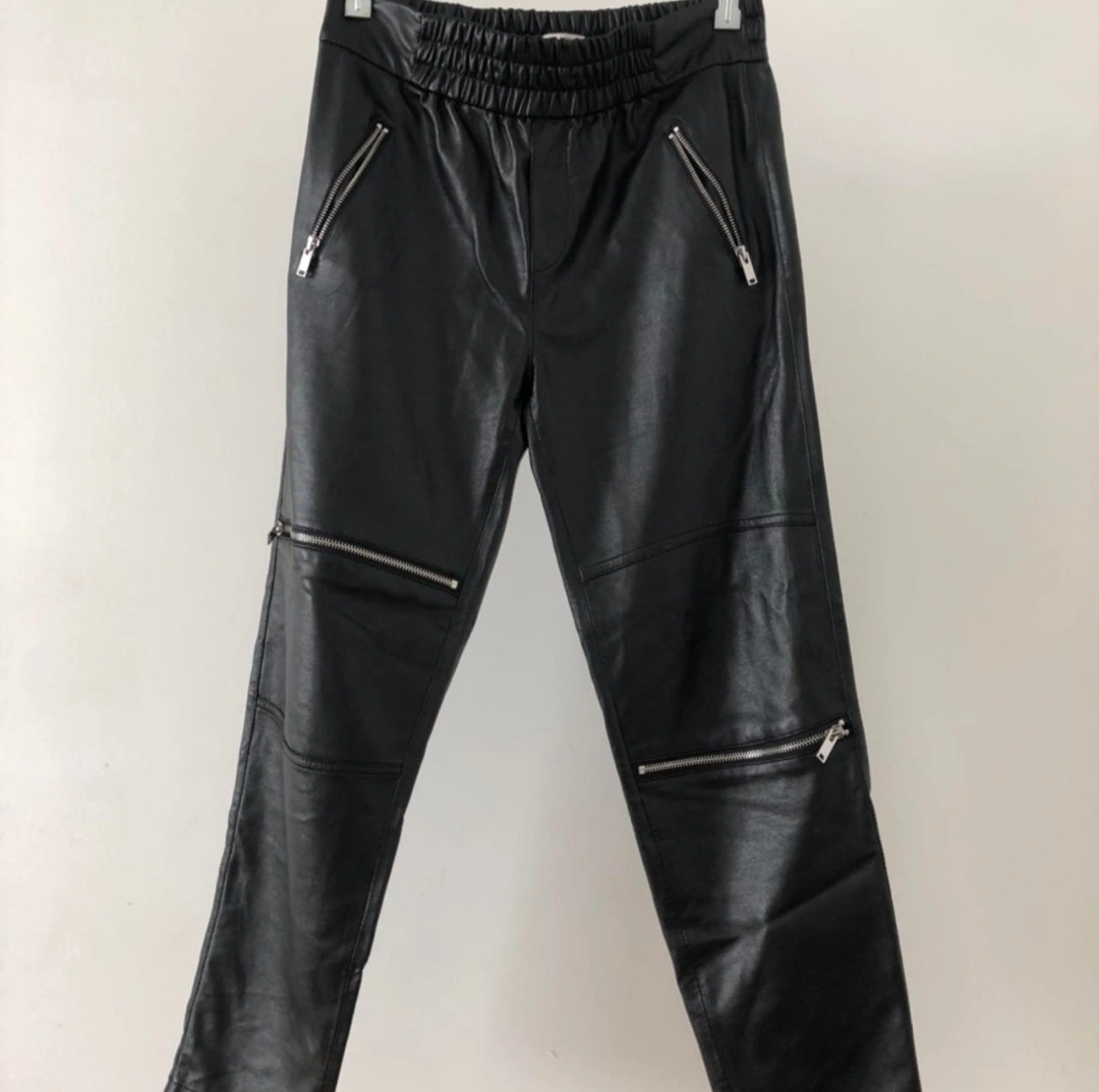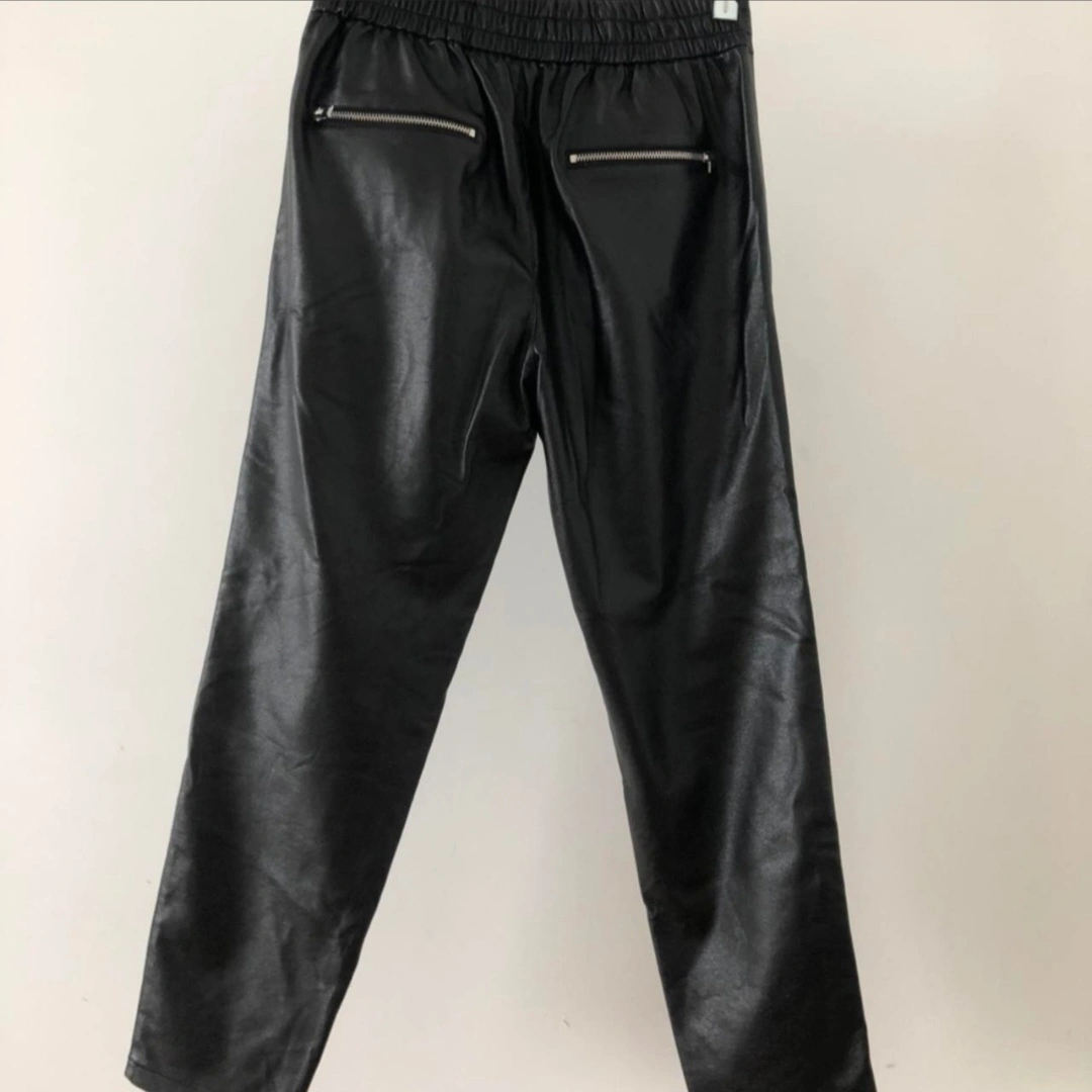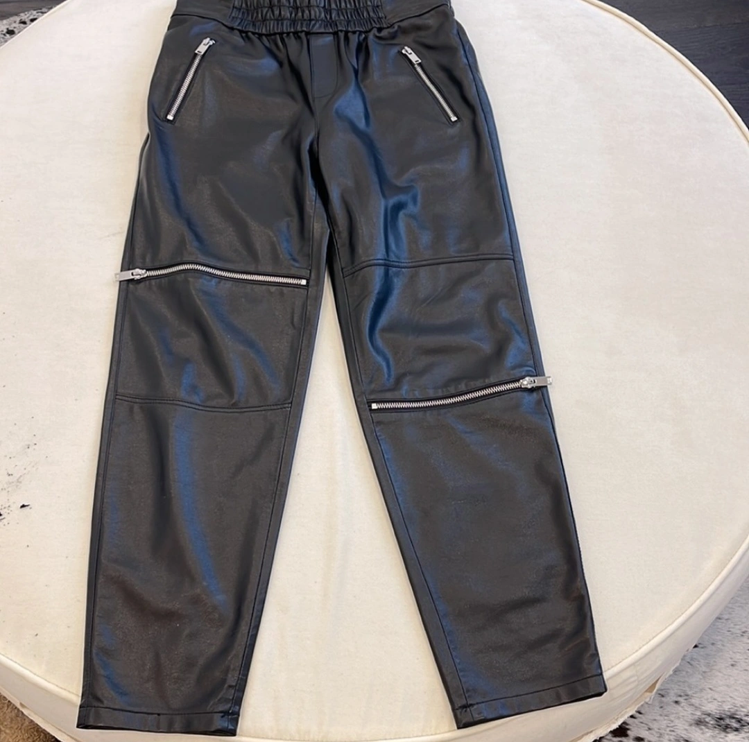 Women's black faux leather pants. Elastic waistband. Multiple zipper accents. Looks stylish and comfortable. like new condition size xsmall - would fit a small has stretch Zara premium denim collection retailed over $120