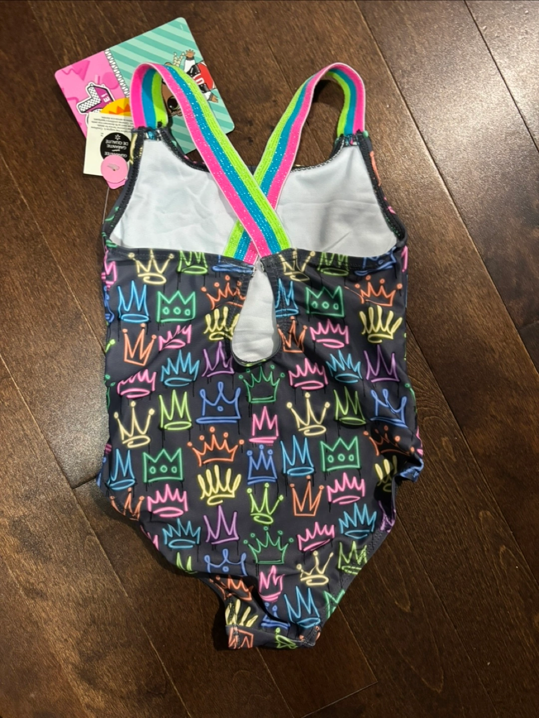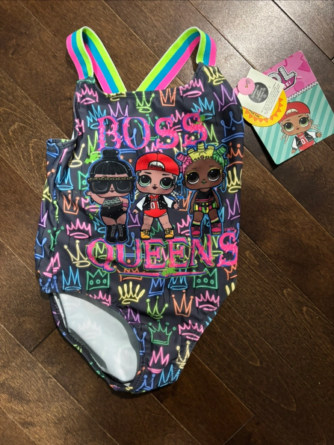 Girls' one-piece swimsuit. Features a colourful print with LOL Surprise characters and crowns. Rainbow straps. Size 4. Brand new with tags.