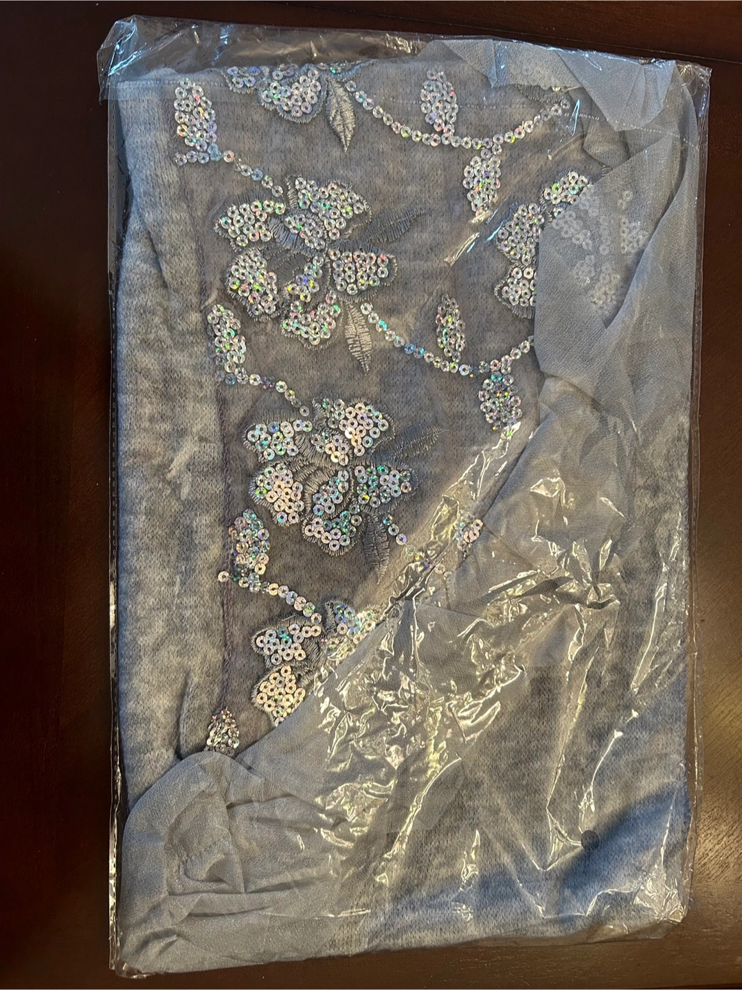 Beautiful grey scarf, embellished with sequined floral details. Soft material, perfect for adding a touch of elegance to any outfit. Perfect for summer. New in package.