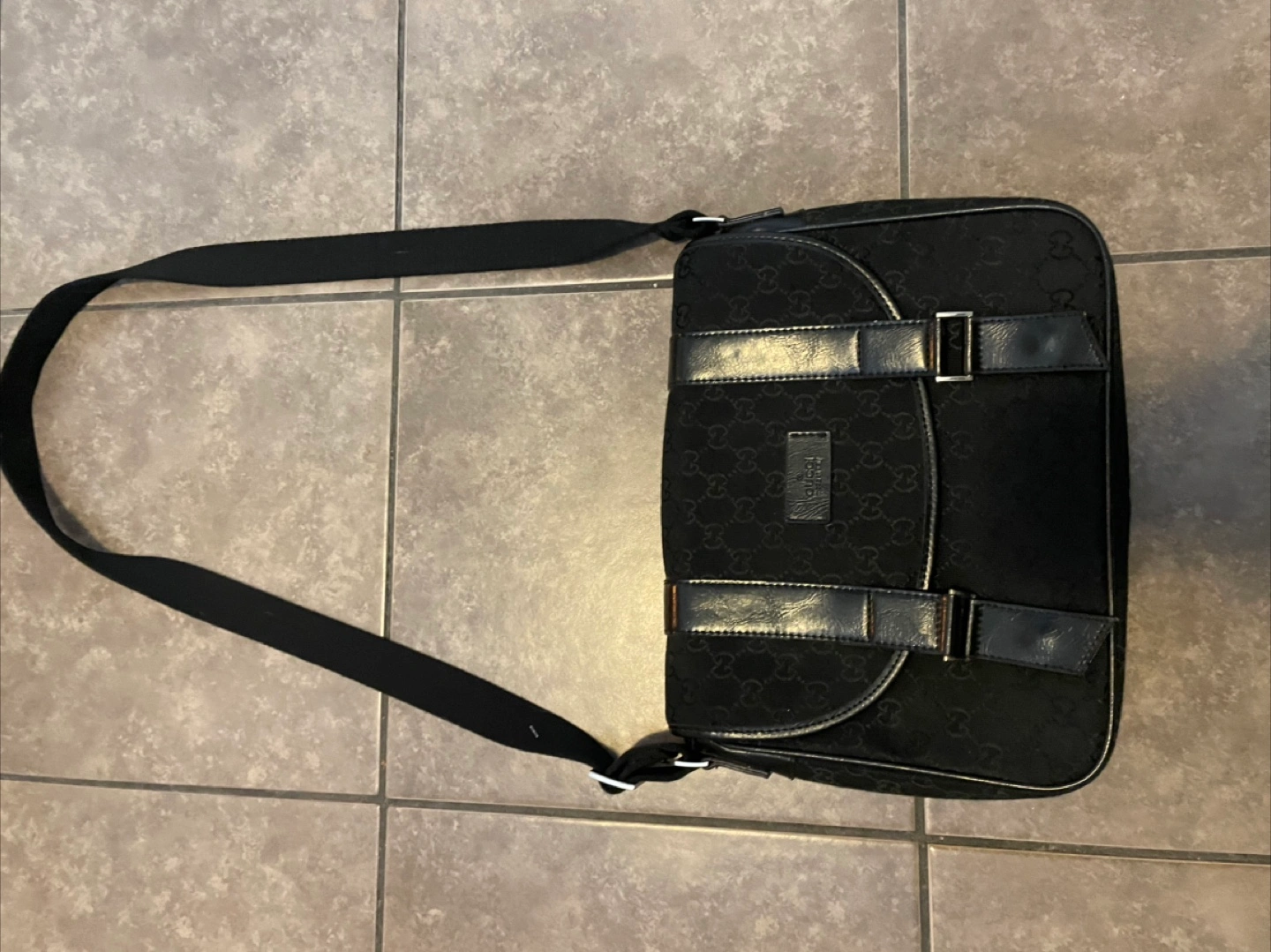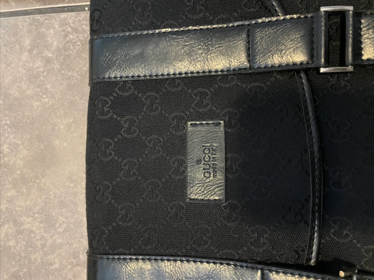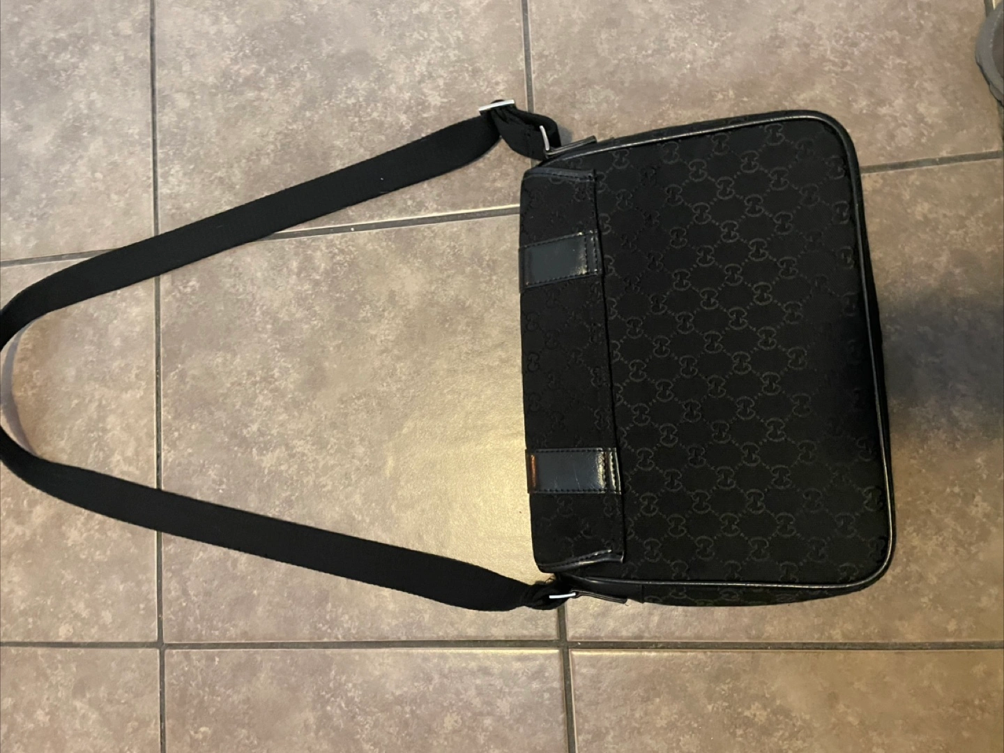 Black Gucci messenger bag. Features a black canvas body with the signature Gucci monogram. Includes an adjustable shoulder strap and leather accents. Small interior compartment.