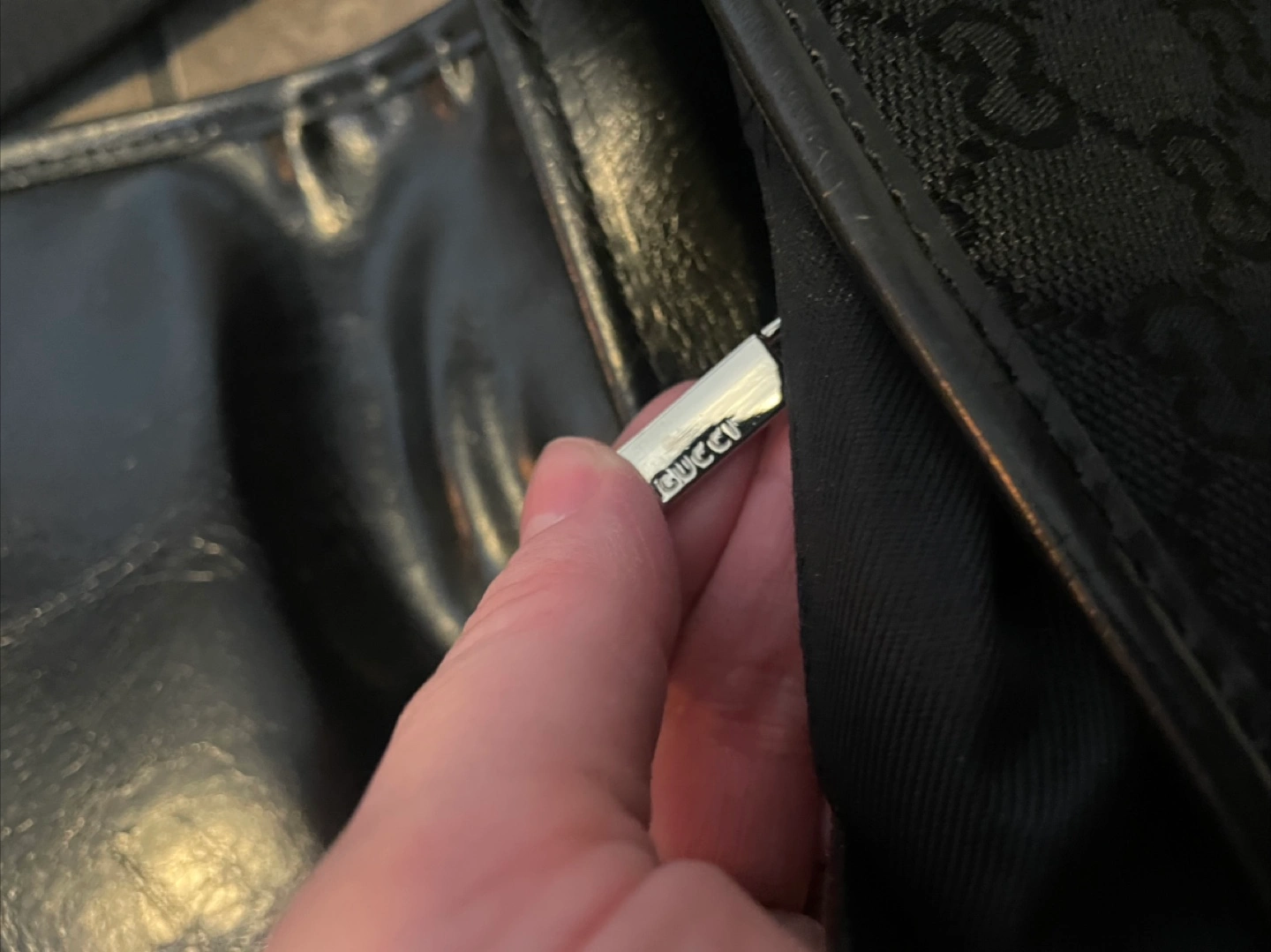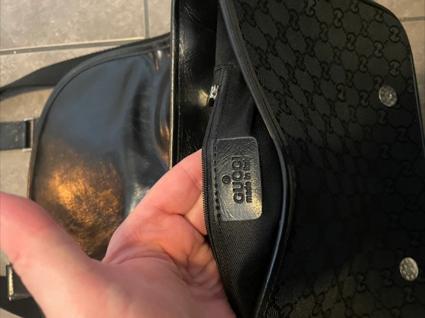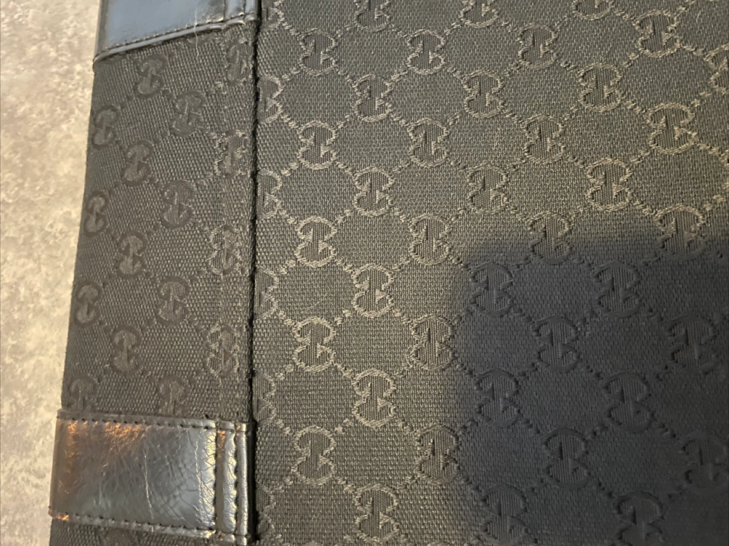 Black Gucci messenger bag. Features a black canvas body with the signature Gucci monogram. Includes an adjustable shoulder strap and leather accents. Small interior compartment.