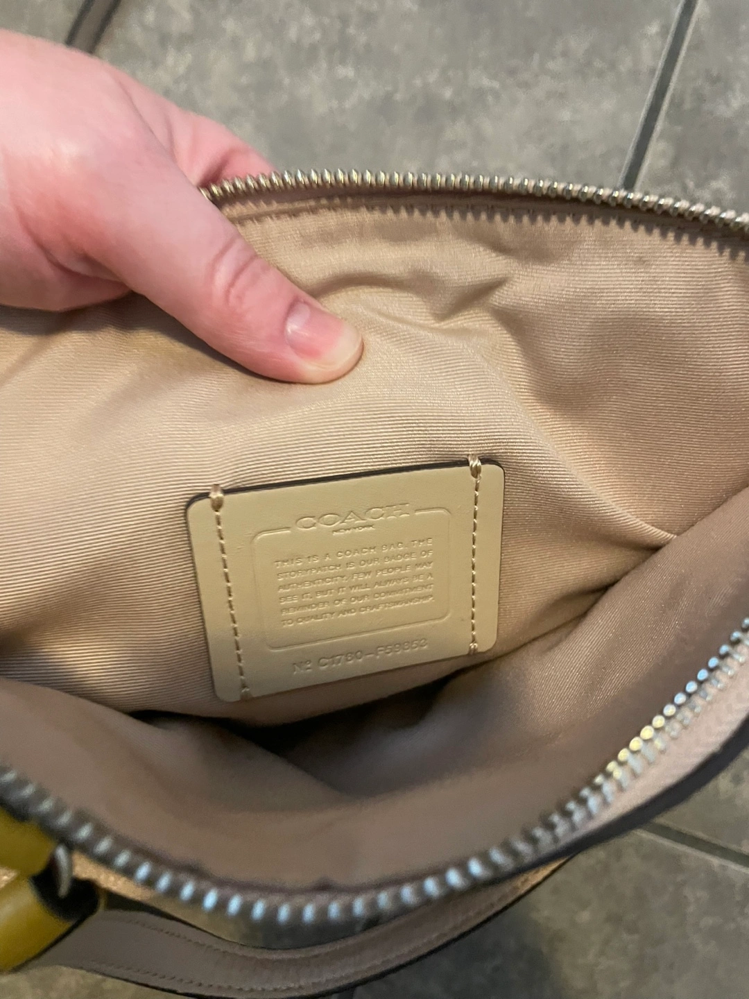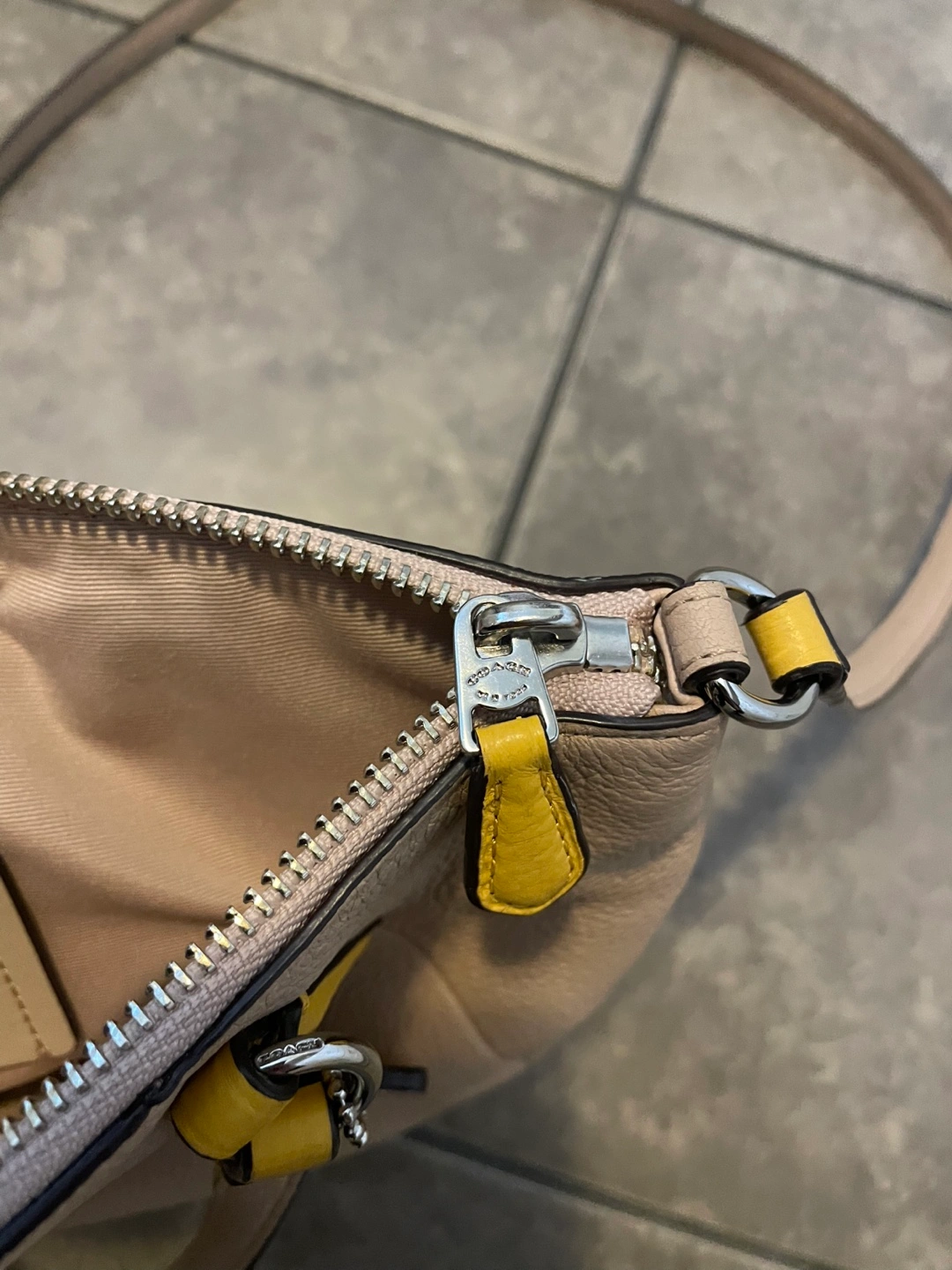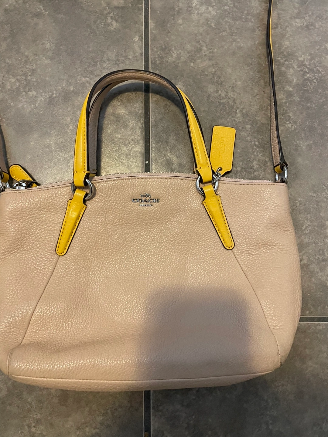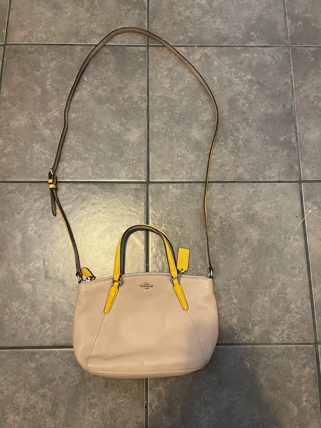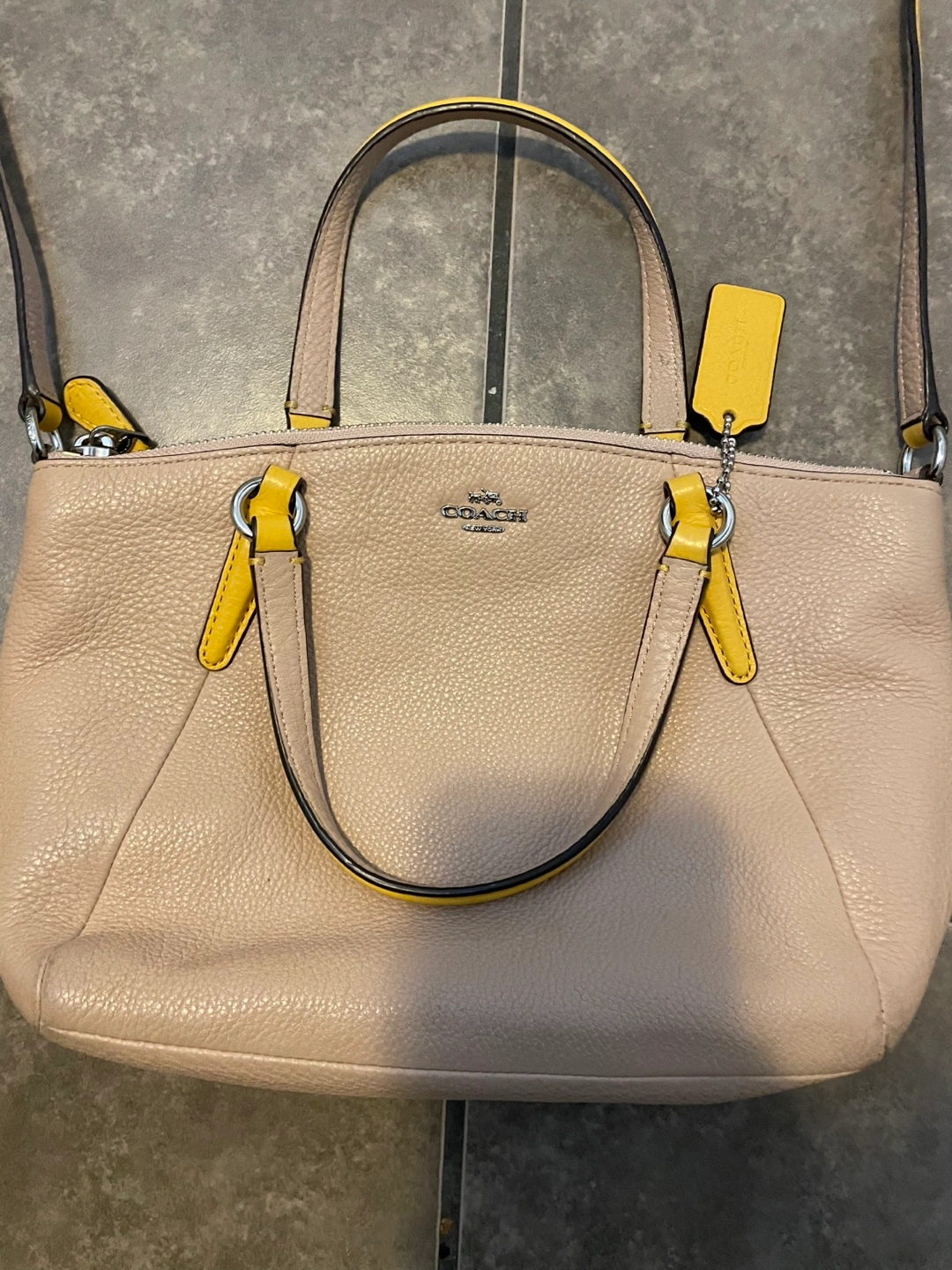Small beige leather handbag. Yellow accents on handles and zipper pulls. Top zip closure. Detachable shoulder strap. Interior features a Coach tag.