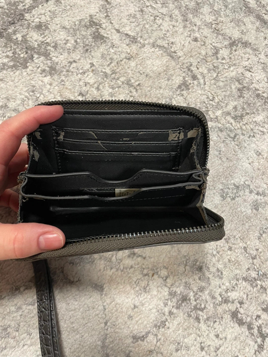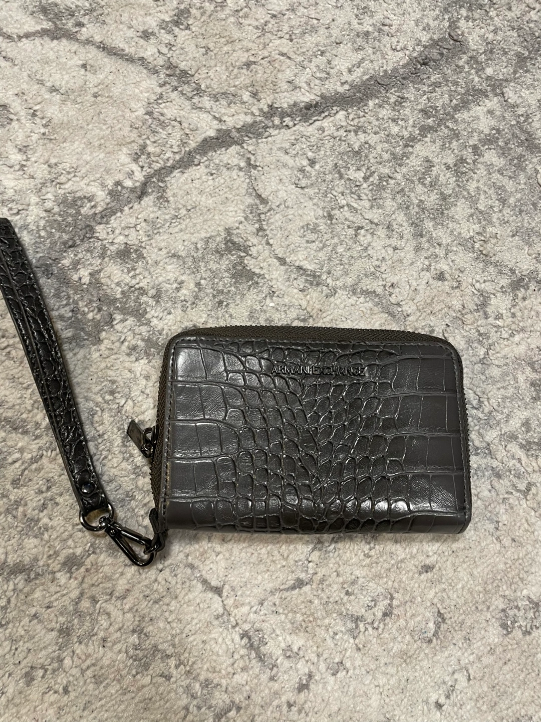 Grey wallet with crocodile-embossed pattern. Features zipper closure, multiple card slots, and a wristlet strap. Compact design, ideal for everyday use.