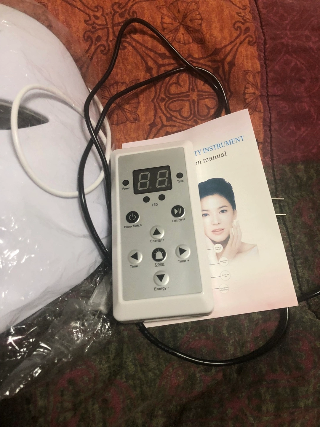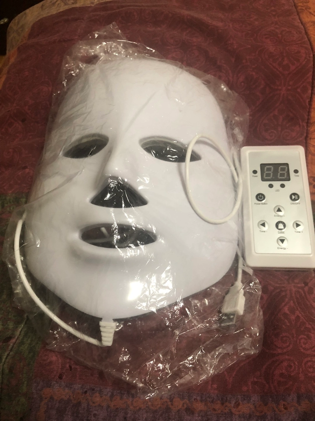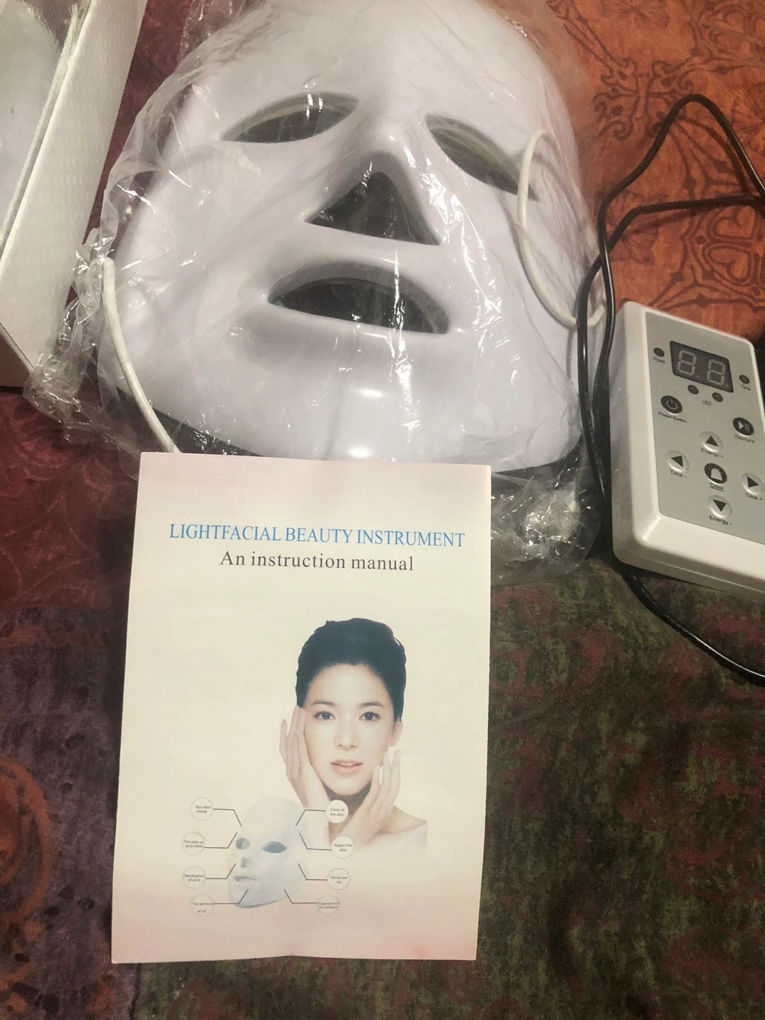 New LED light therapy face mask. Includes remote control and instruction manual. Adjustable headband. Multiple light settings. Perfect for at-home skincare.