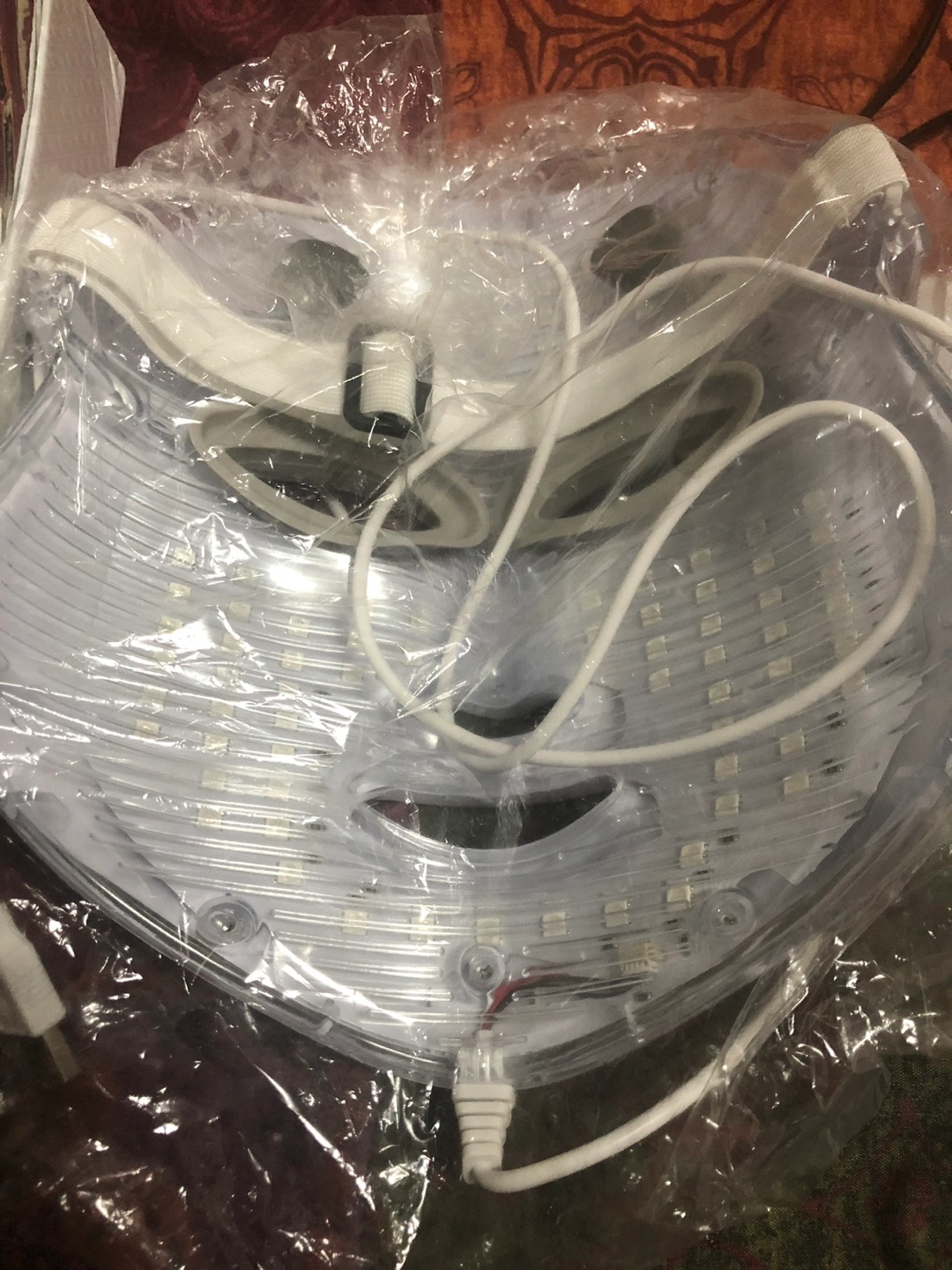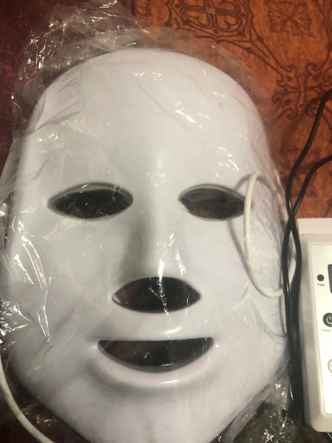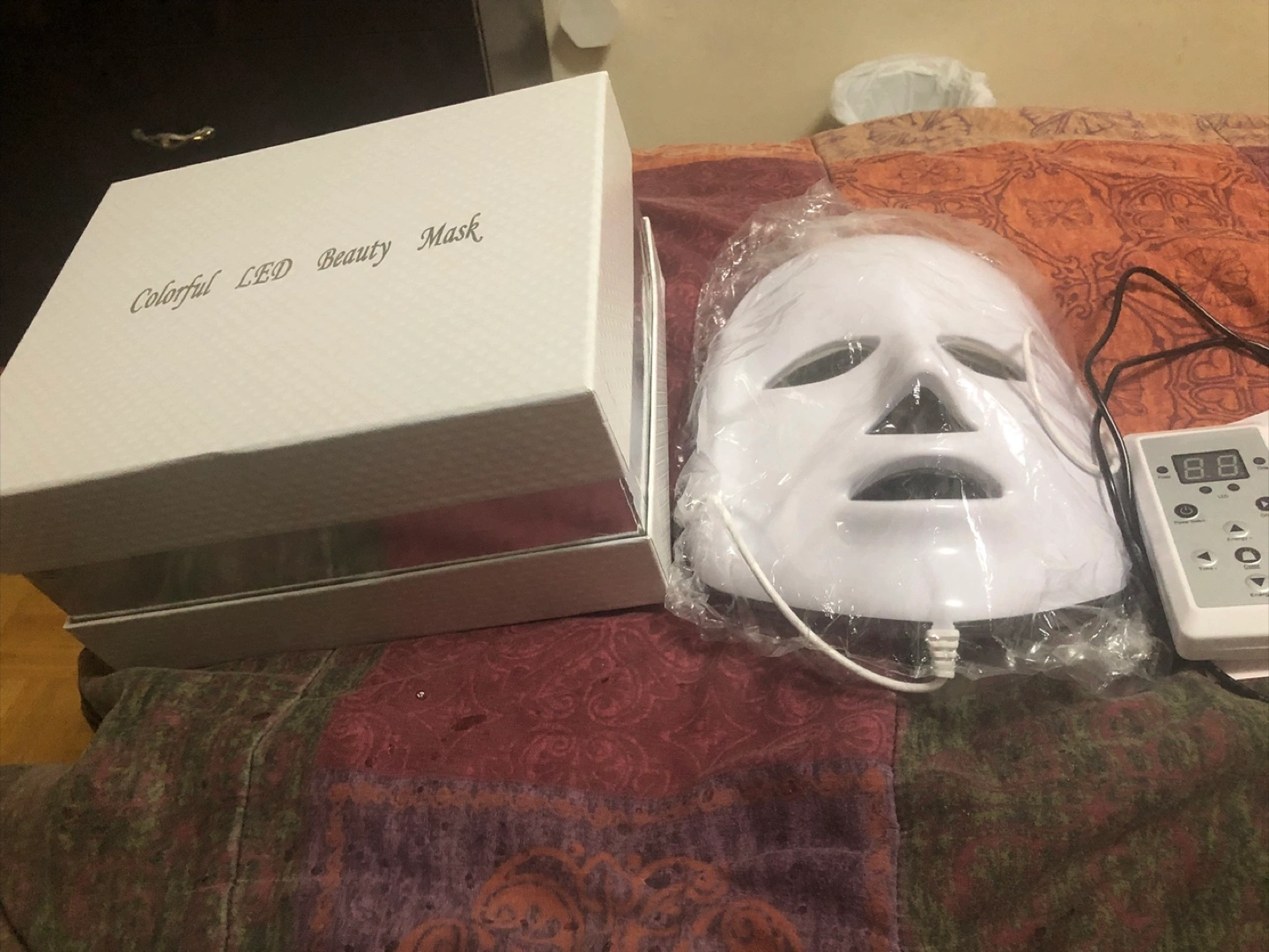 New LED light therapy face mask. Includes remote control and instruction manual. Adjustable headband. Multiple light settings. Perfect for at-home skincare.