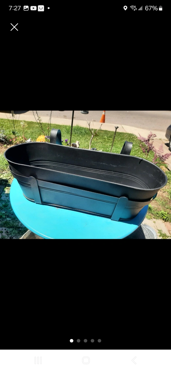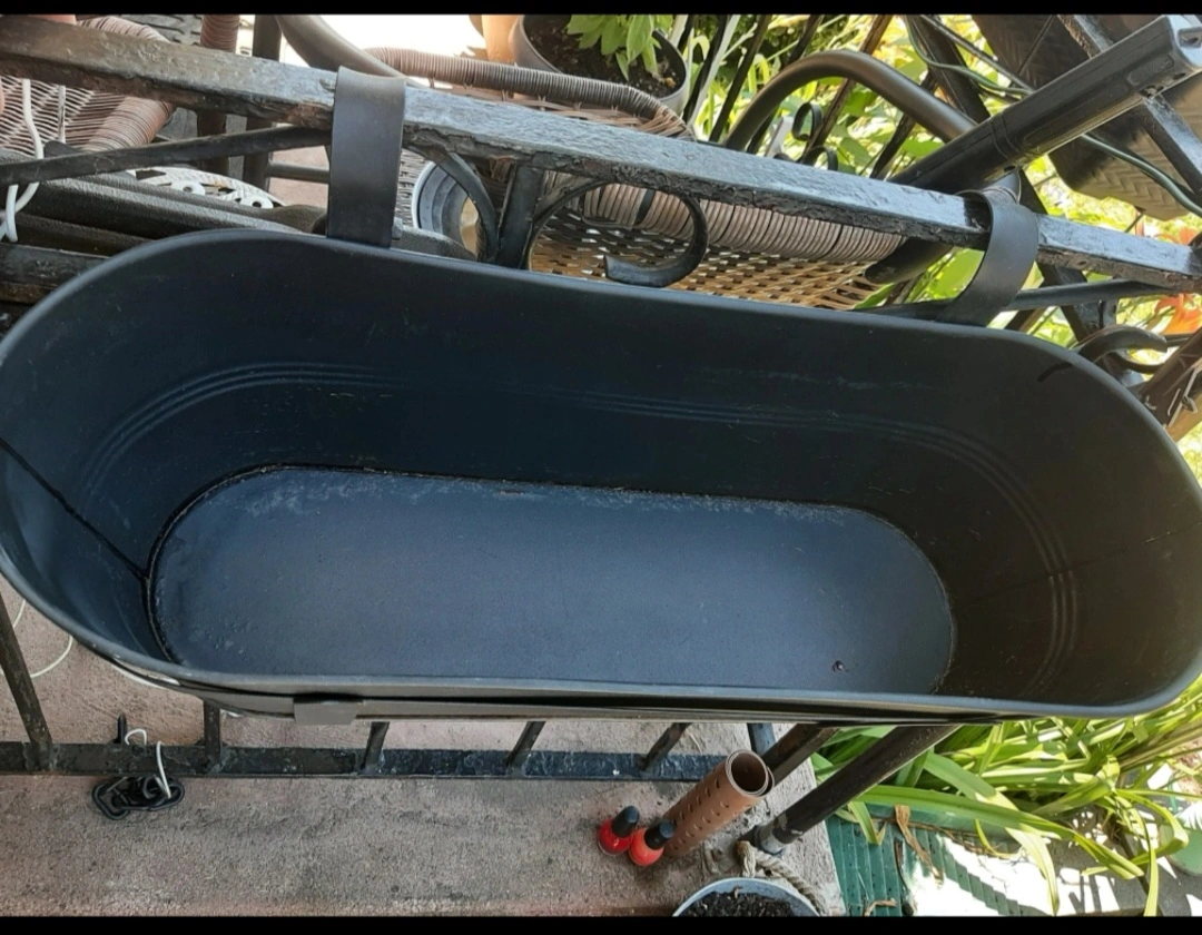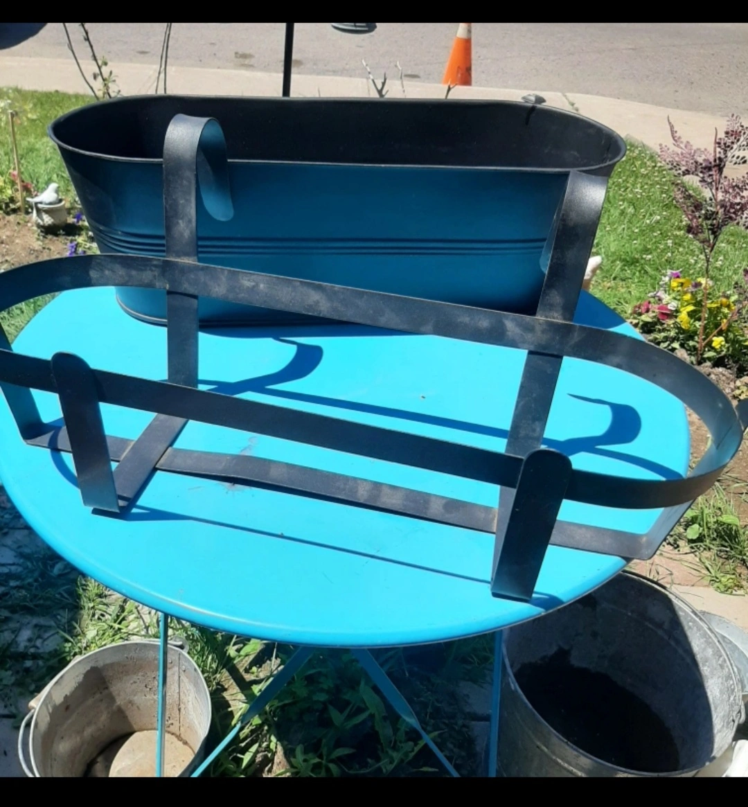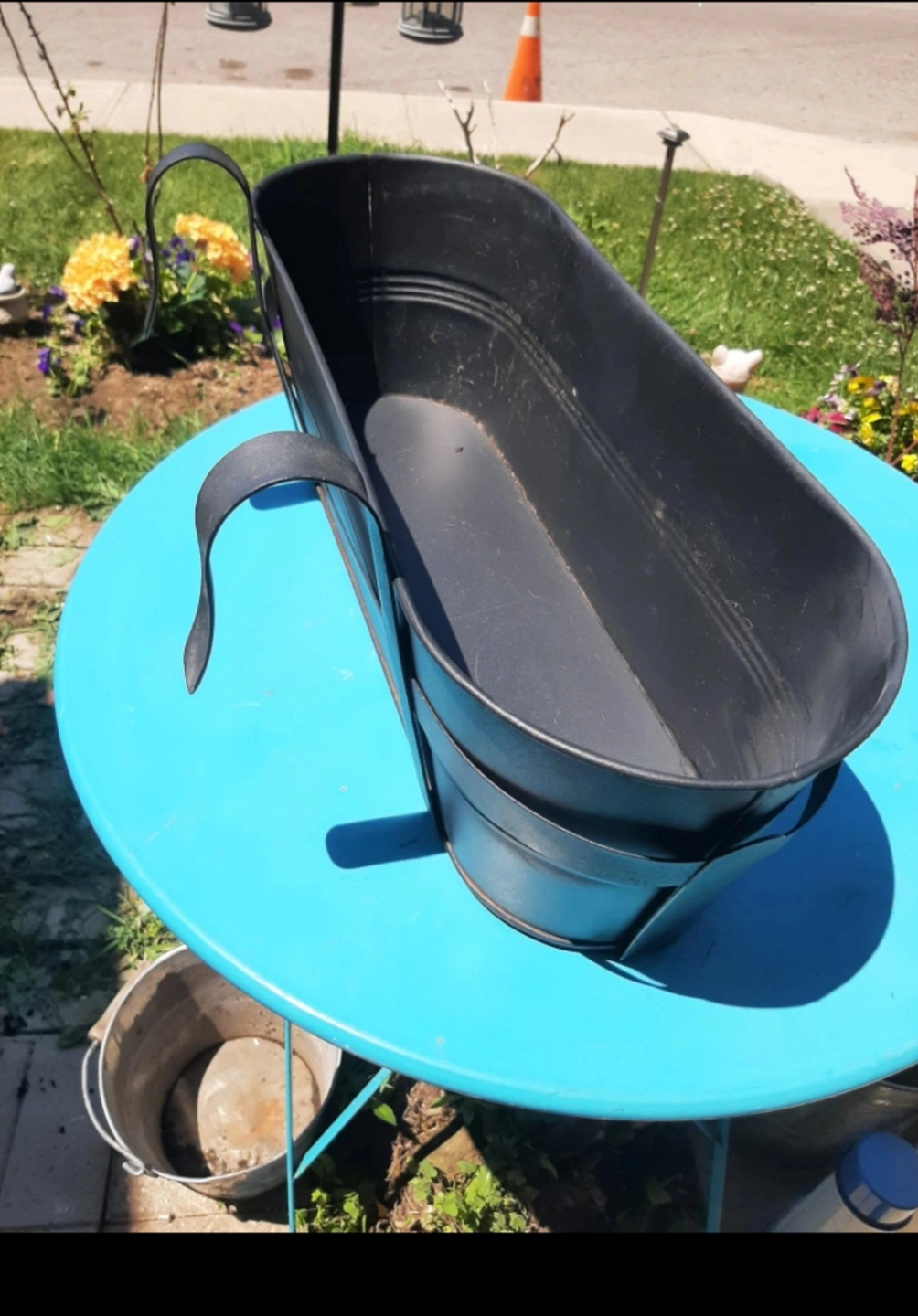 Oval-shaped black metal hanging planter. Features two metal brackets for hanging. Great for herbs, flowers, or other plants. Durable and stylish. price only cash only pickup no delivery. Meet up on 801 O'Connor drive outside TD Canada Trust bank door