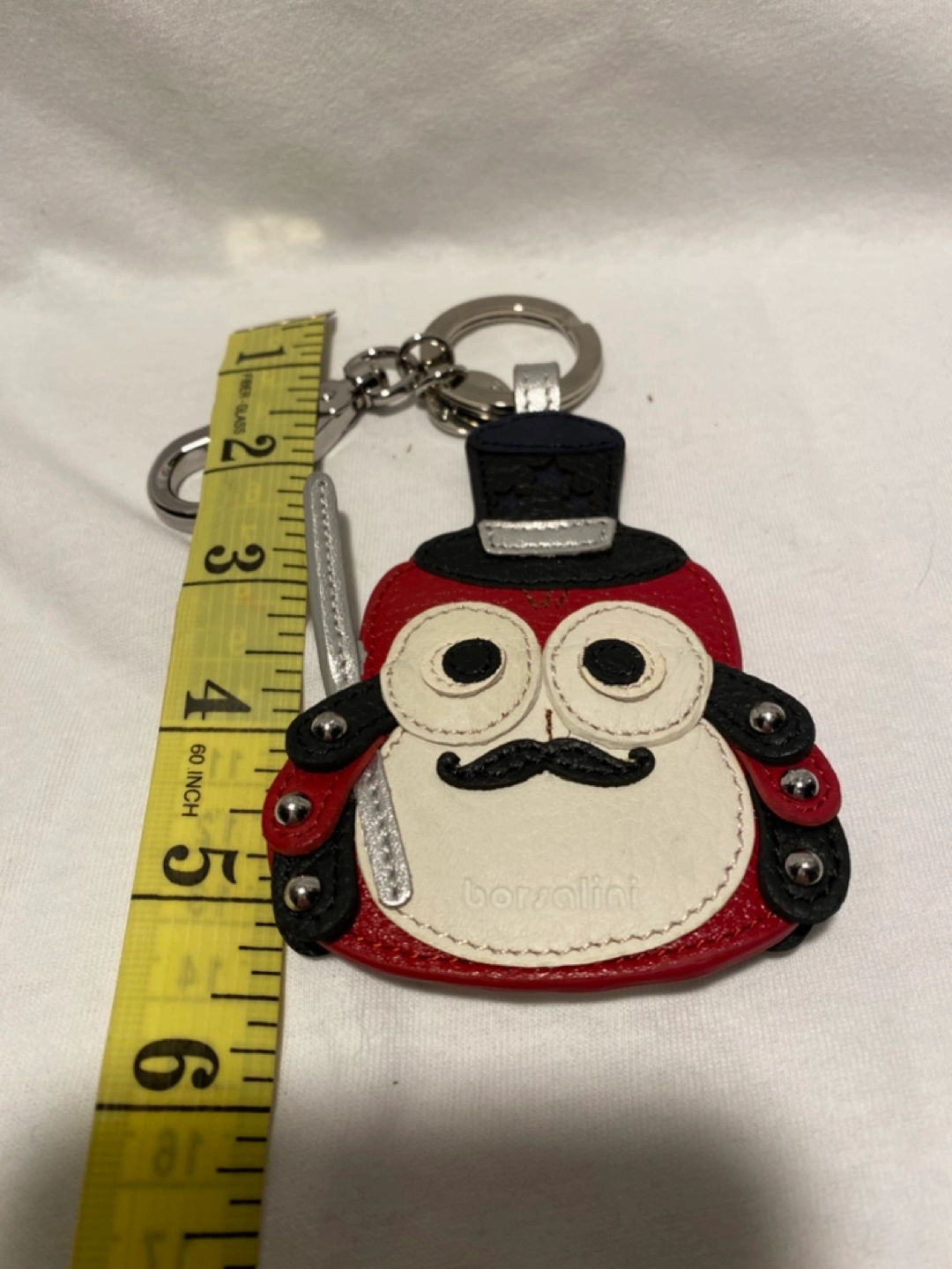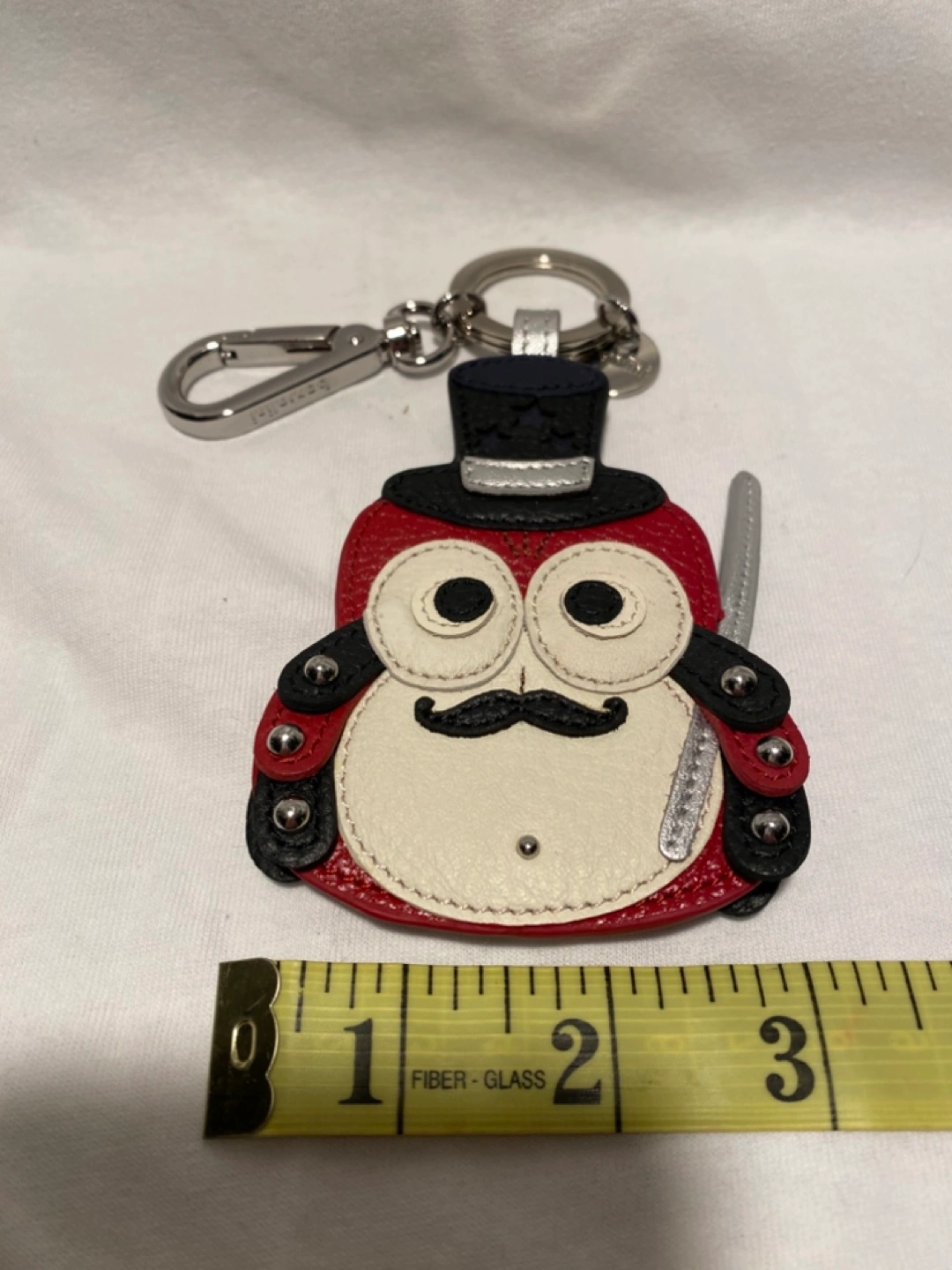 Adorable leather owl keychain. Features a top hat, mustache, and metallic accents. Approximately 2 inches tall. Unique and stylish.