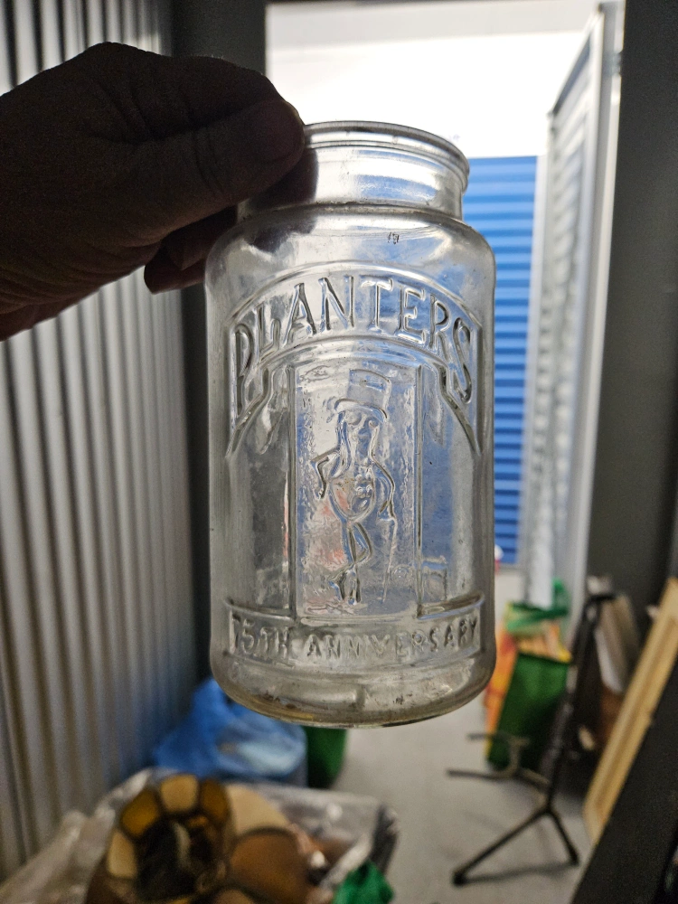 Clear glass jar. Planters logo and 75th Anniversary etched into the glass. Collectible item.