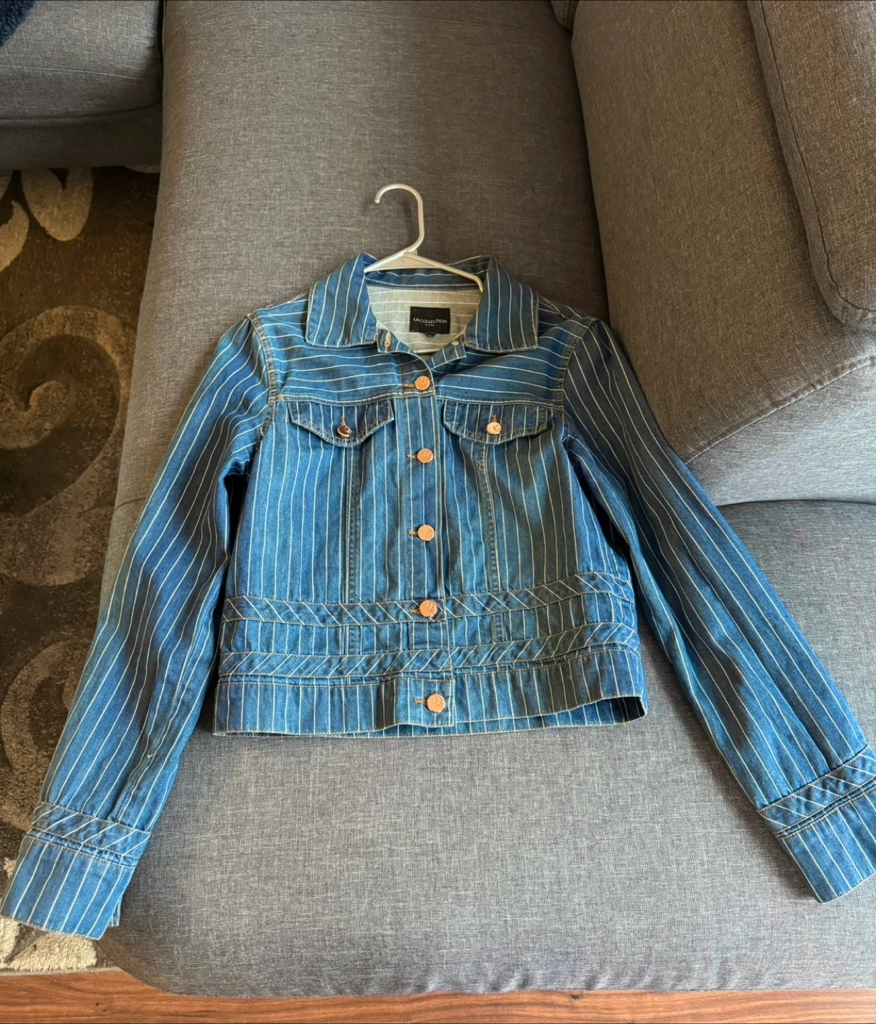 Women's cropped denim jacket. Blue denim with white stripes. Long sleeves, button closure. Gold-coloured buttons.