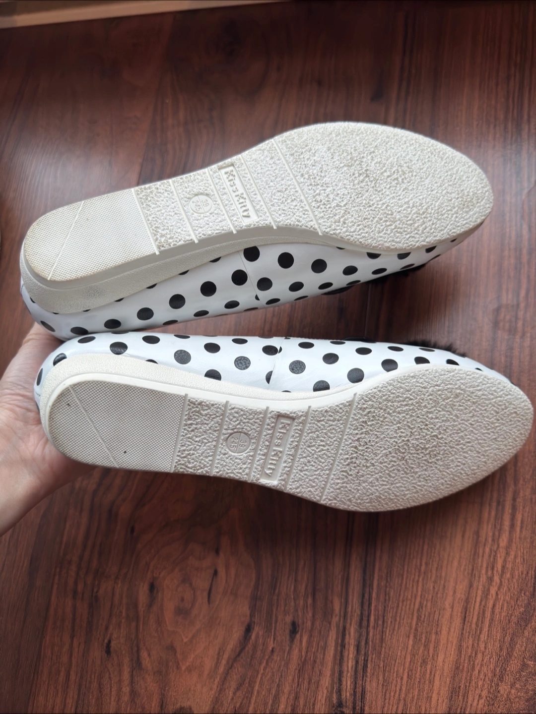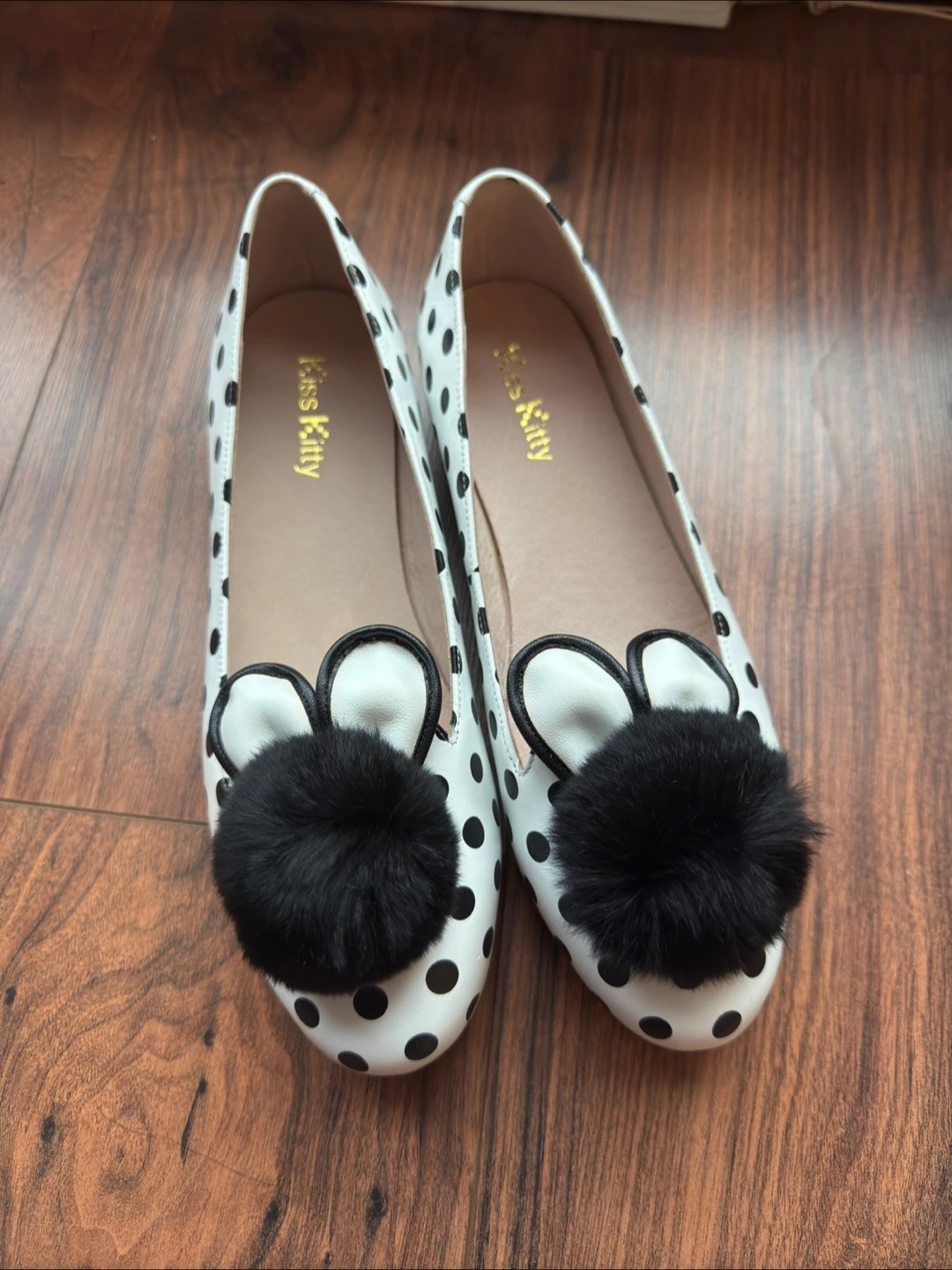 Adorable women's flats. Polka dot pattern. Bunny ear and pom-pom accents. White and black.