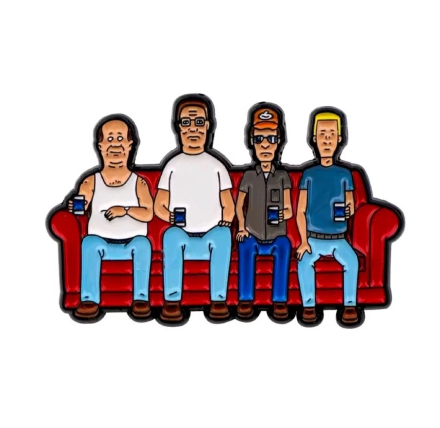 Enamel pin featuring Hank, Dale, Boomhauer, and Bill from King of the Hill. Collectible pin. Great for fans.