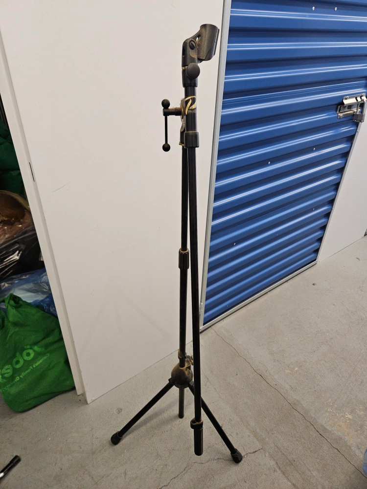 Used microphone stand. Black metal construction. Adjustable height. Three-legged base. Some wear.