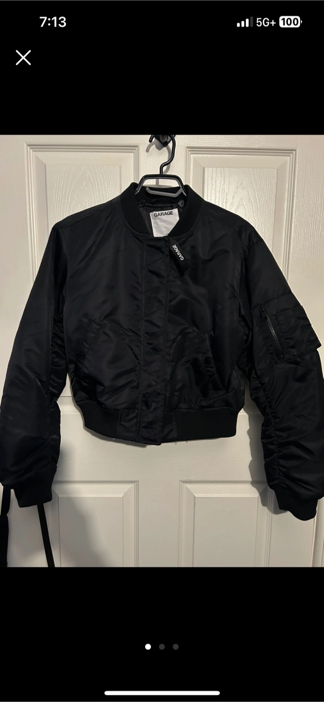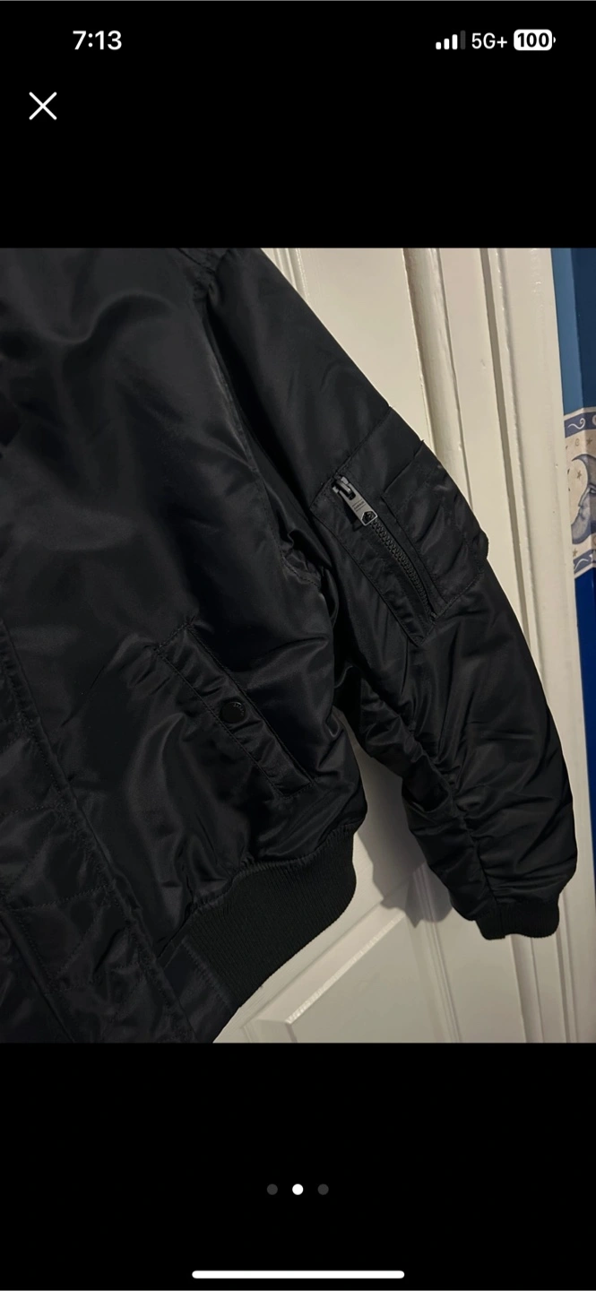 Black bomber jacket. Size small. Features zipper closure and pockets. Good condition.