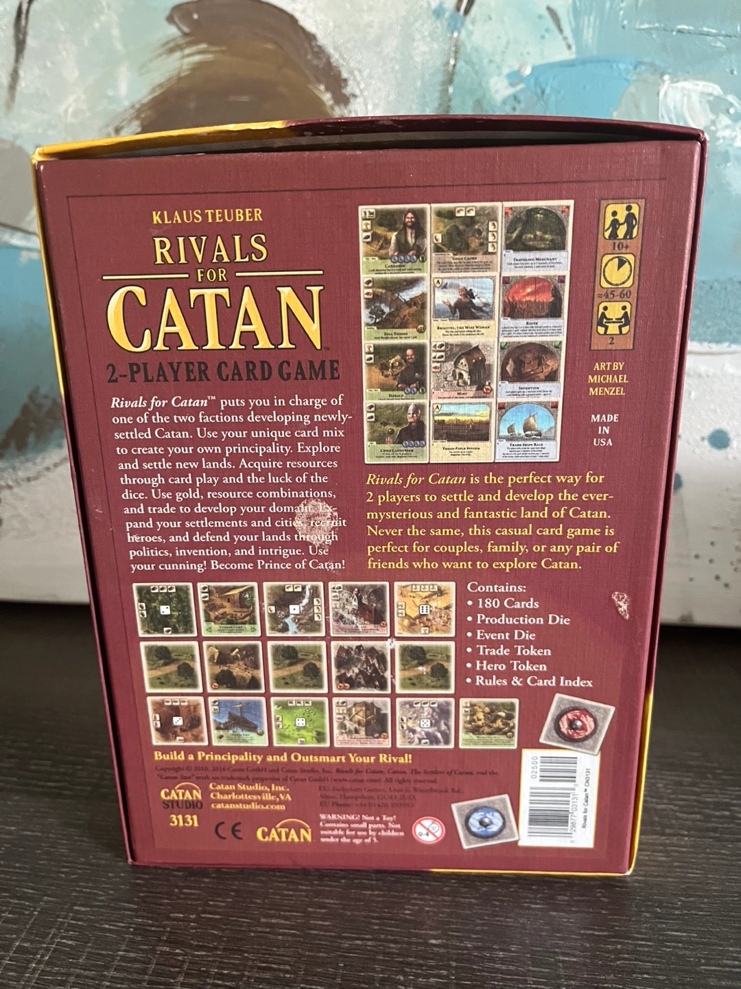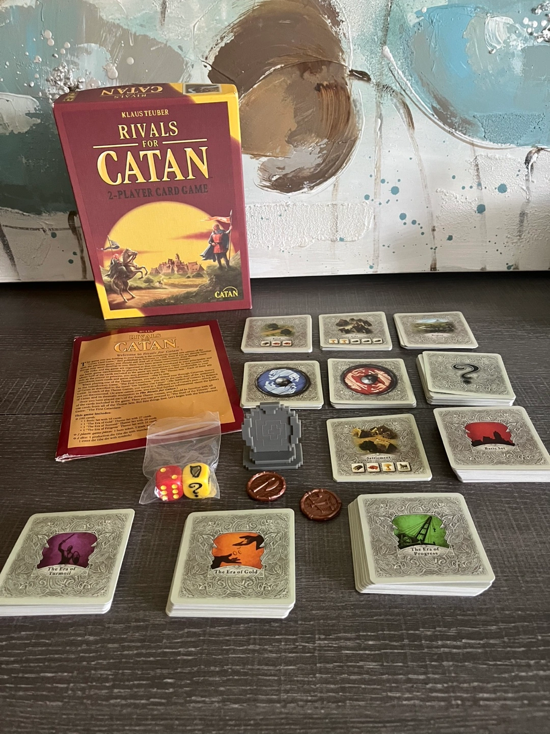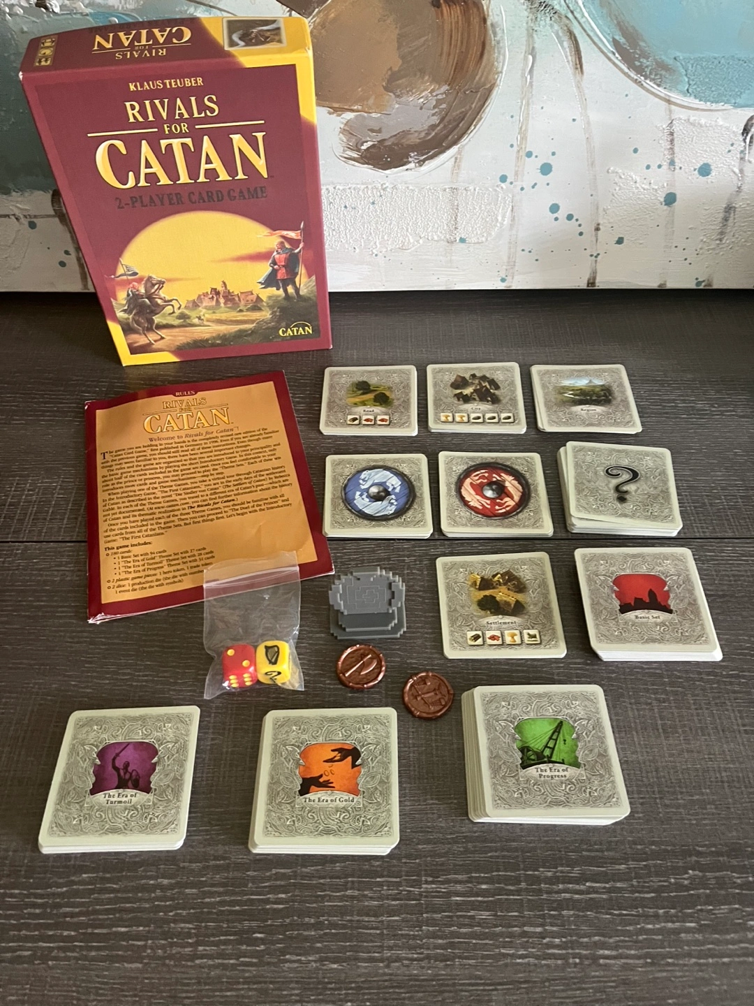 Two-player card game. Includes cards, tokens, dice, and rulebook. Great for casual gameplay. Pick up in Utopia