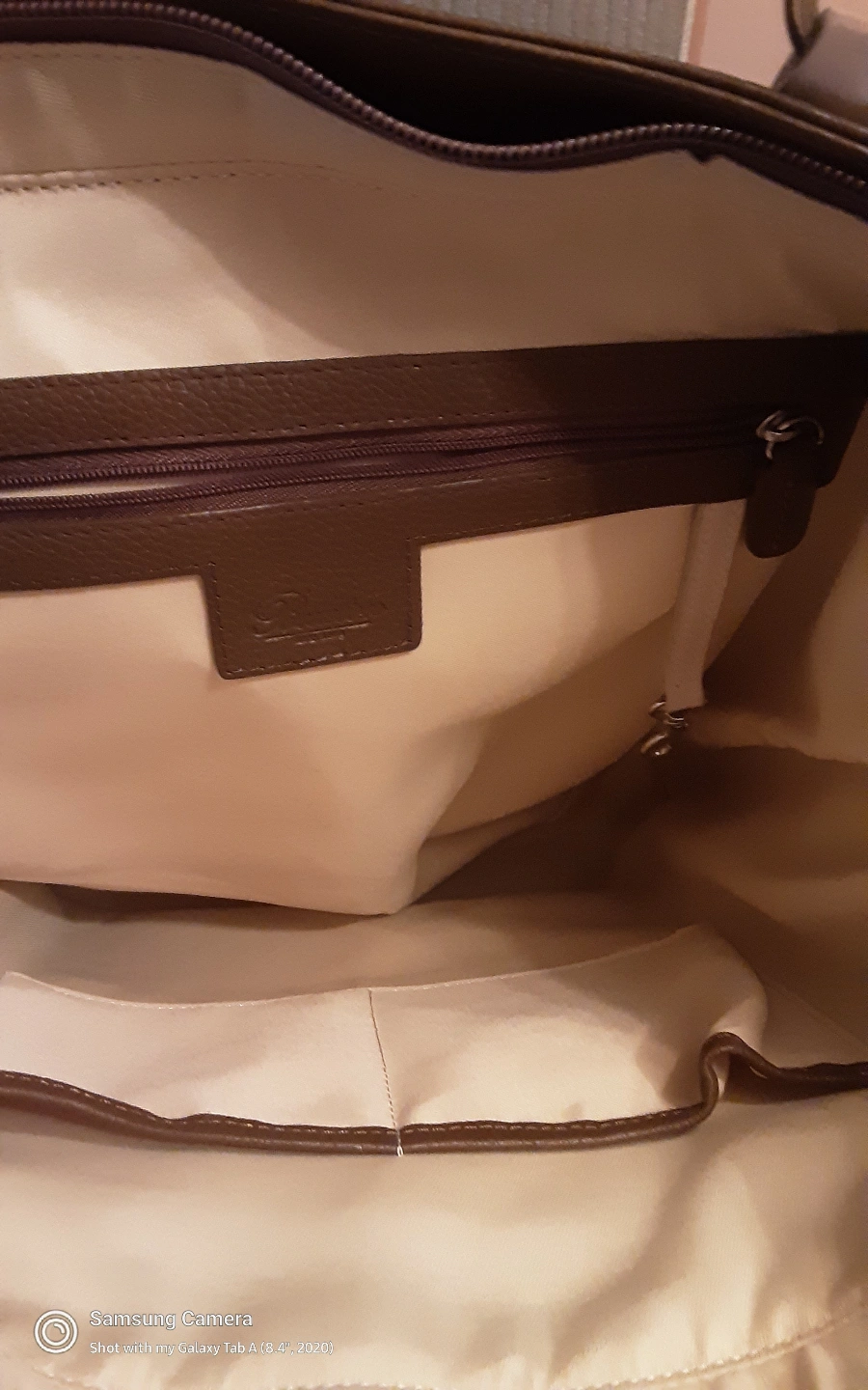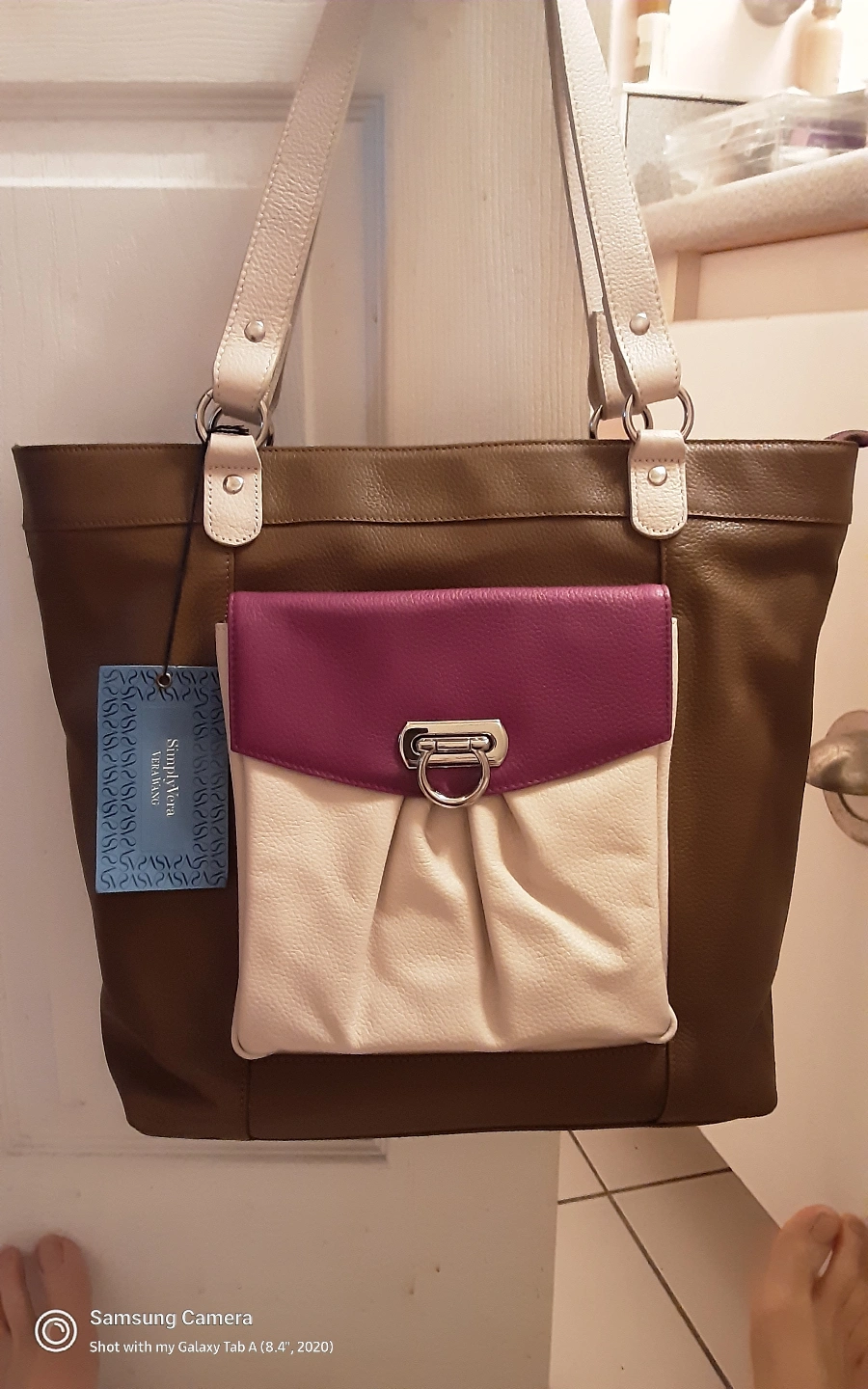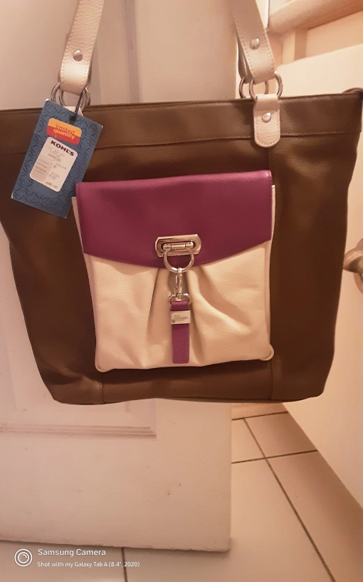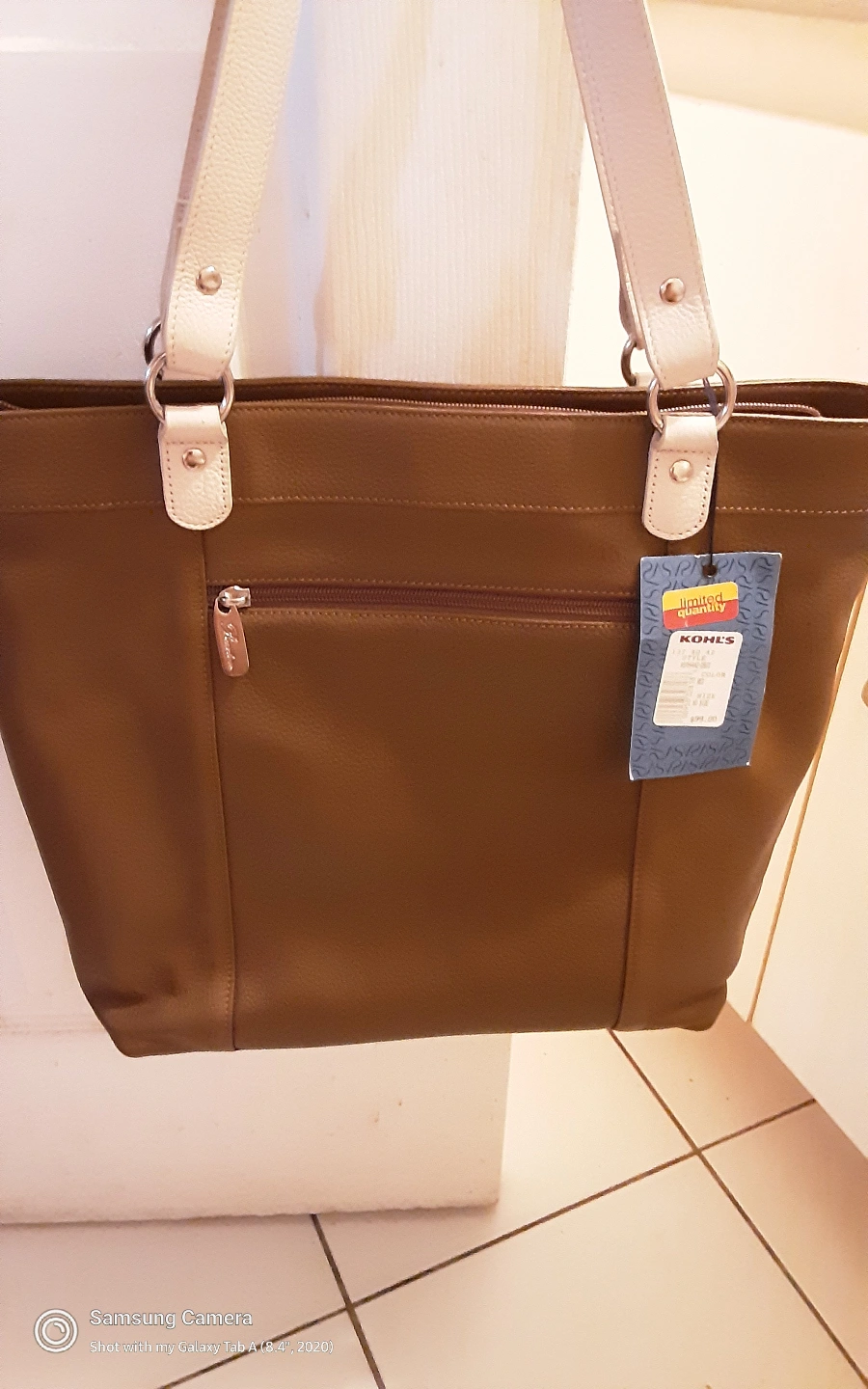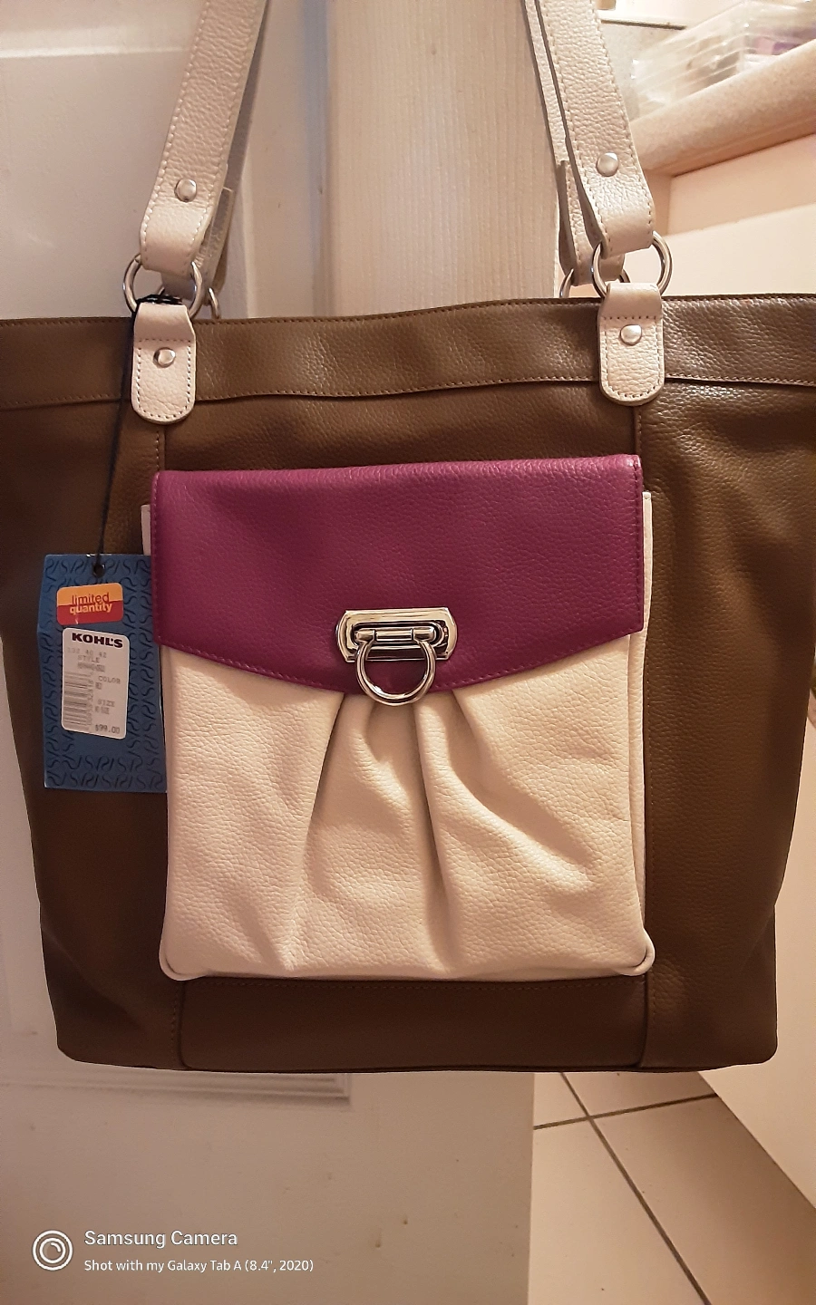 NWT- BUXTON BROWN IVORY & VIOLET GENUINE LEATHER TOTE SHOLDER BAG W/ DUST BAG... FCFS------- NO HOLD.