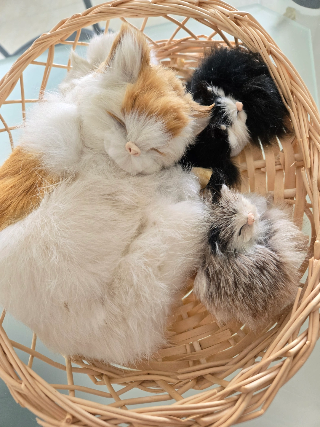 Set of four faux fur kittens. One larger orange and white kitten and three smaller kittens in black, white, and grey. All nestled together in a woven basket. Cute collectible item.