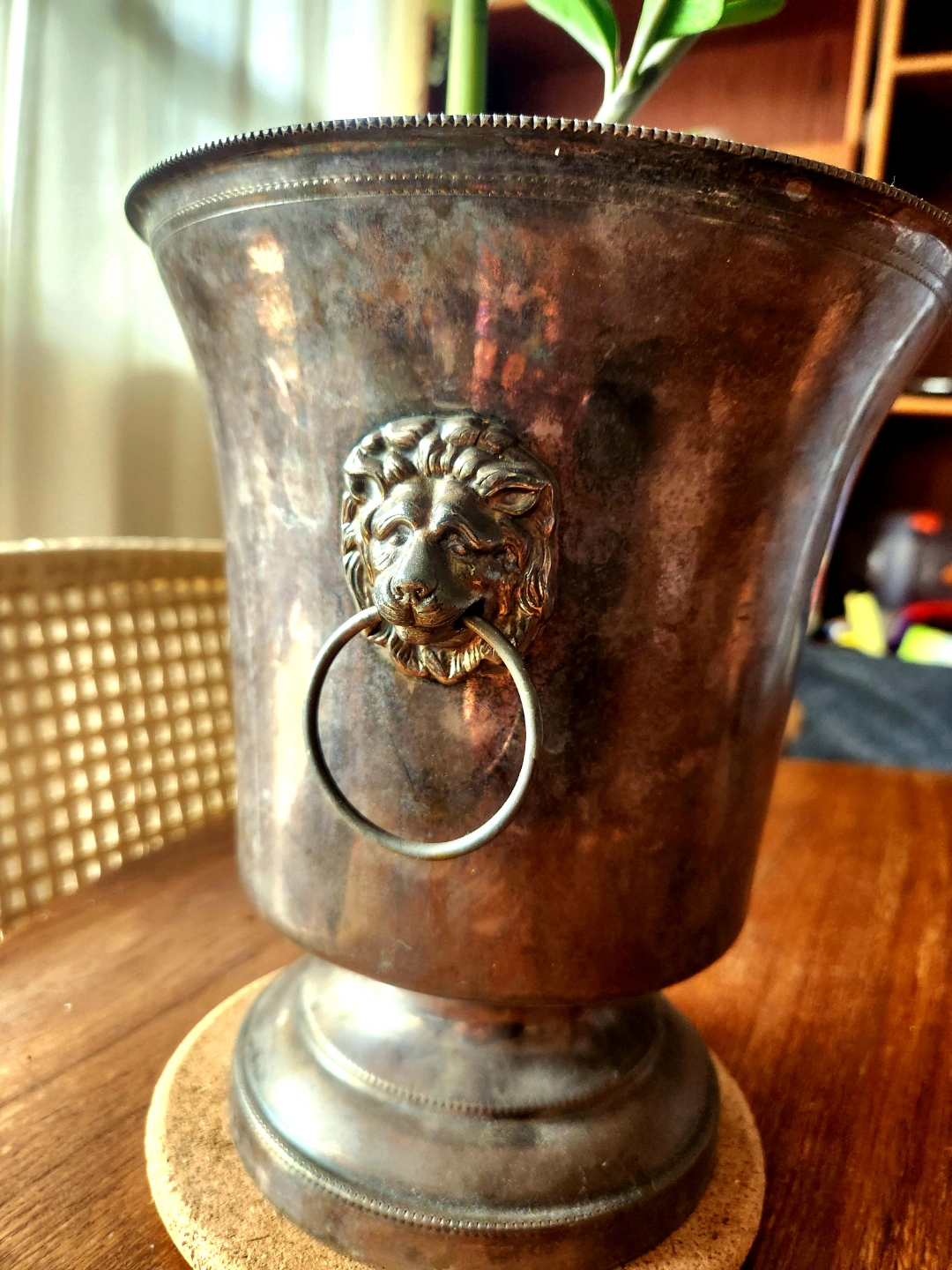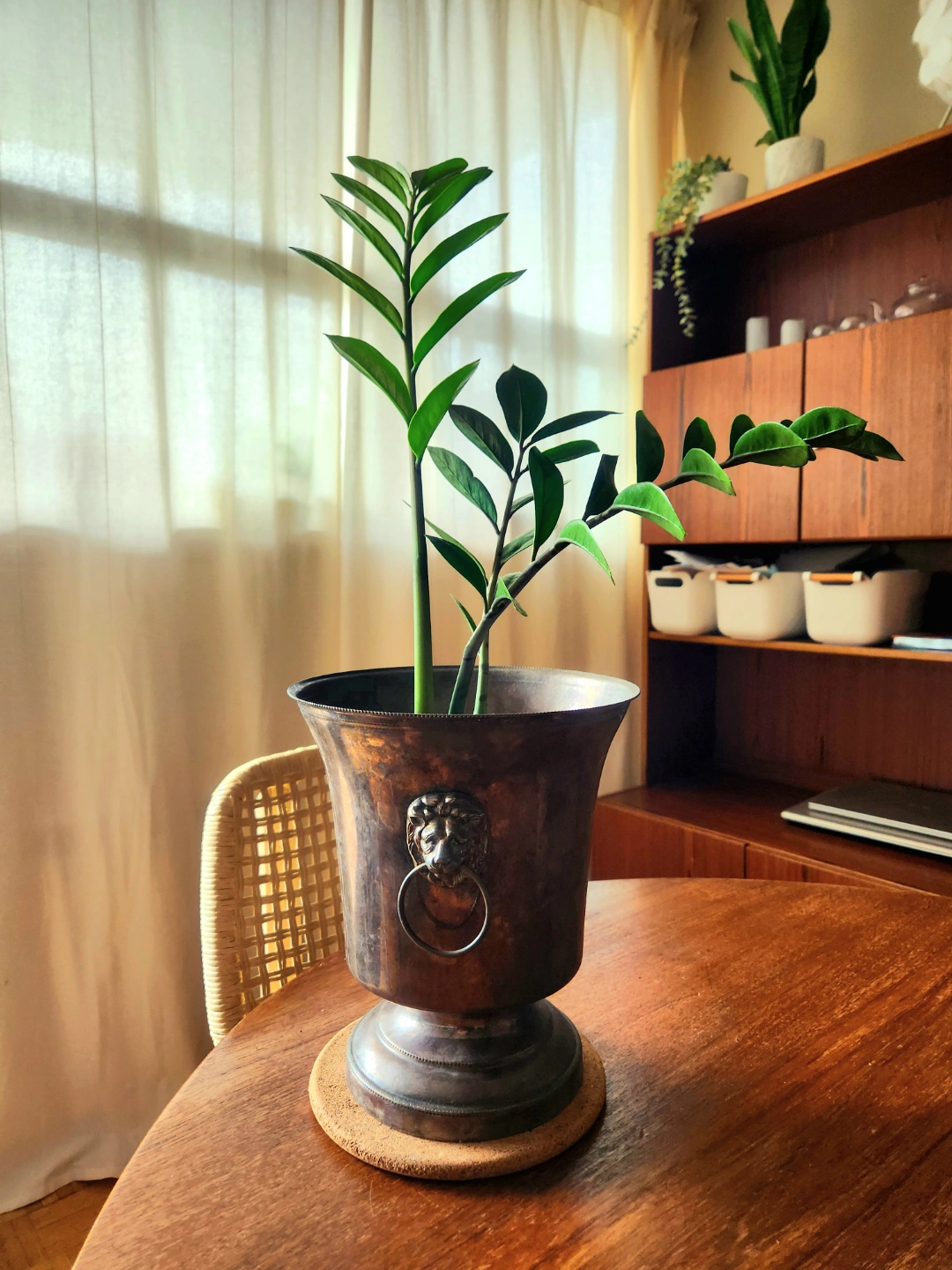 Healthy ZZ plant in a unique vintage metal planter. Lion head detail. Great for adding a touch of elegance to your home.