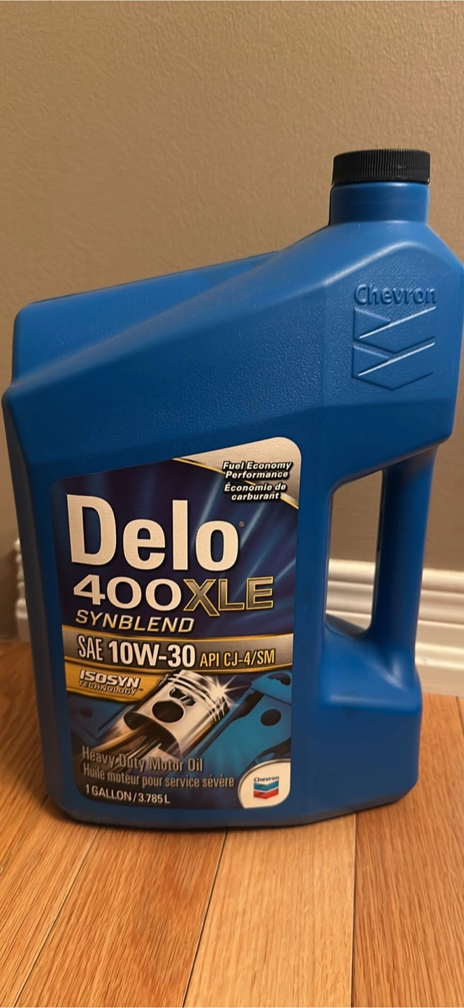 1 gallon of Chevron Delo 400XLE Synblend heavy-duty motor oil. SAE 10W-30. API CJ-4/SM. Fuel economy performance.