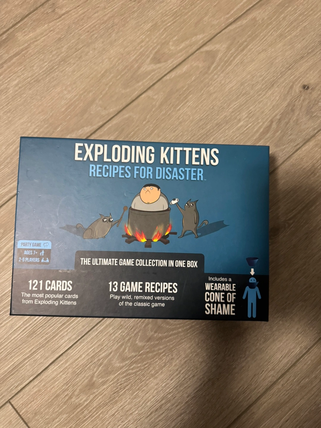 Complete game set. 121 cards. 13 game recipes. Includes wearable cone of shame. Ages 7+. 2-5 players. Pickup in Thorold. *Moving Sale*
