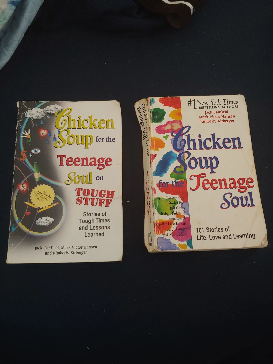 Two Chicken Soup for the Teenage Soul books. One is titled "Chicken Soup for the Teenage Soul on Tough Stuff", the other is "Chicken Soup for the Teenage Soul". Stories of life, love and learning.