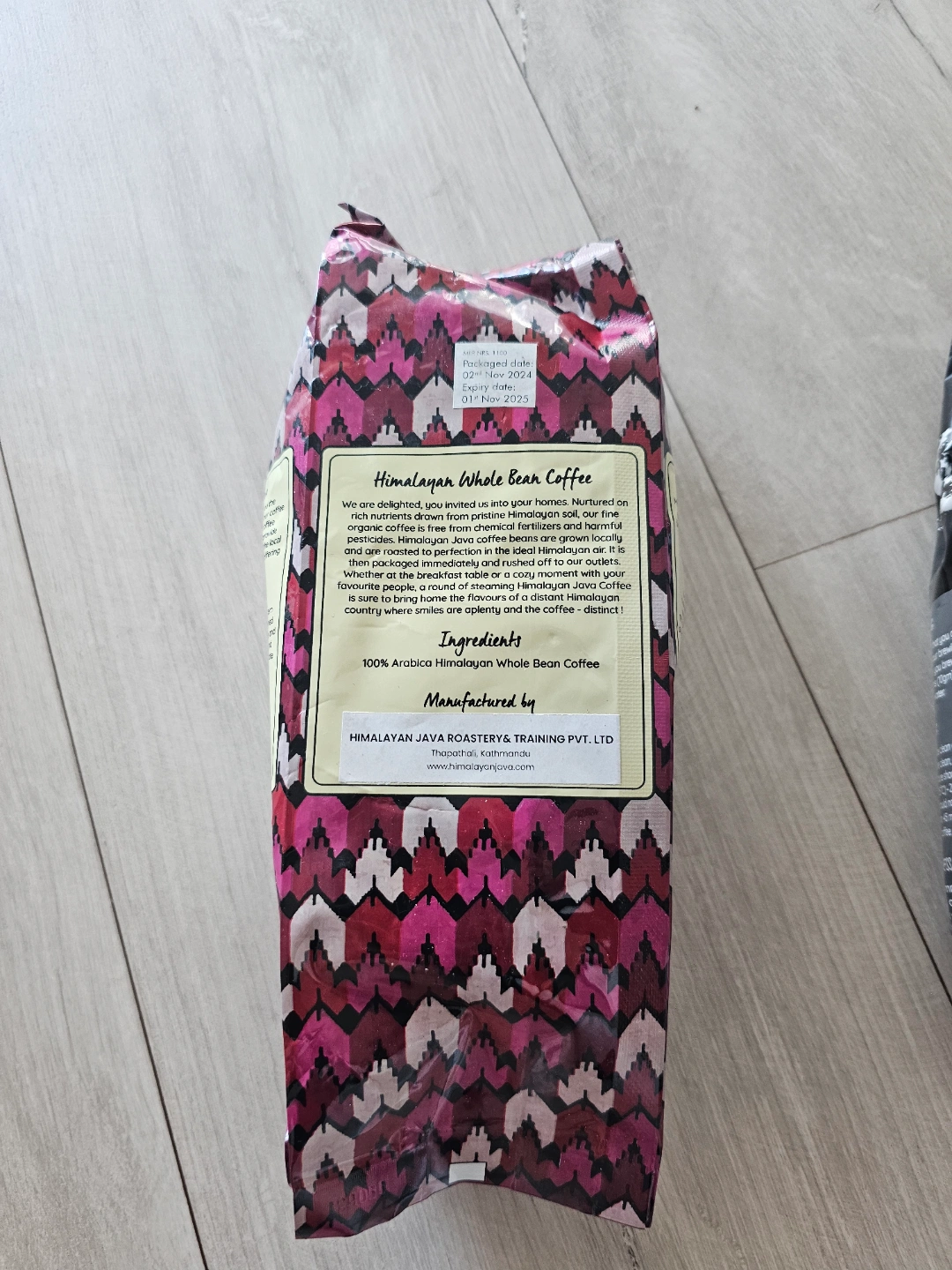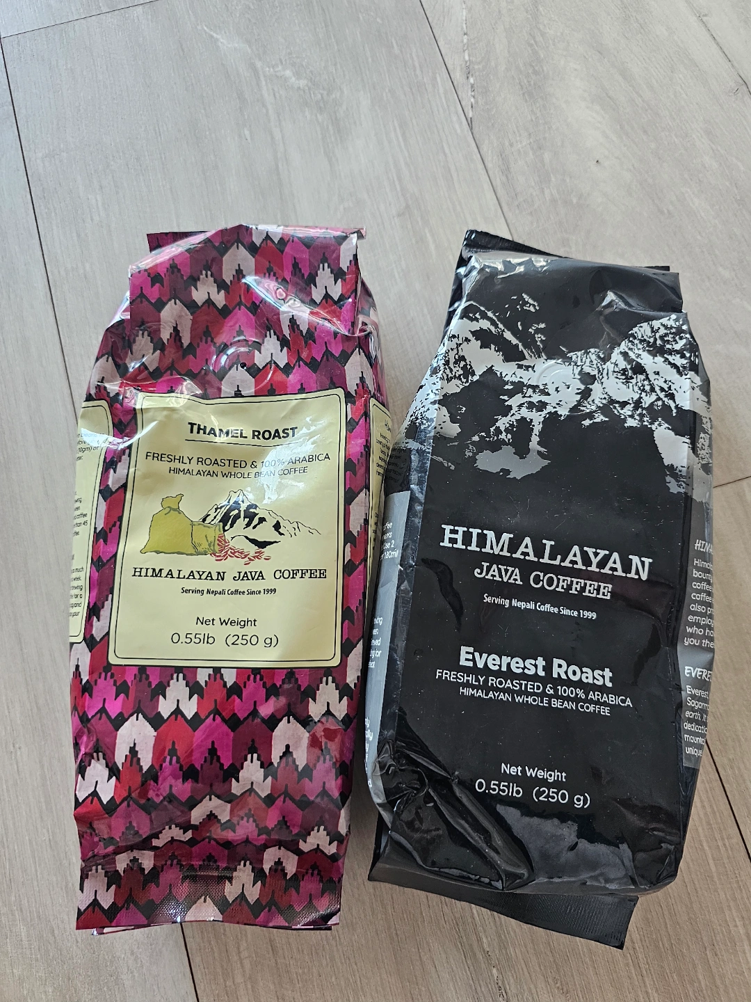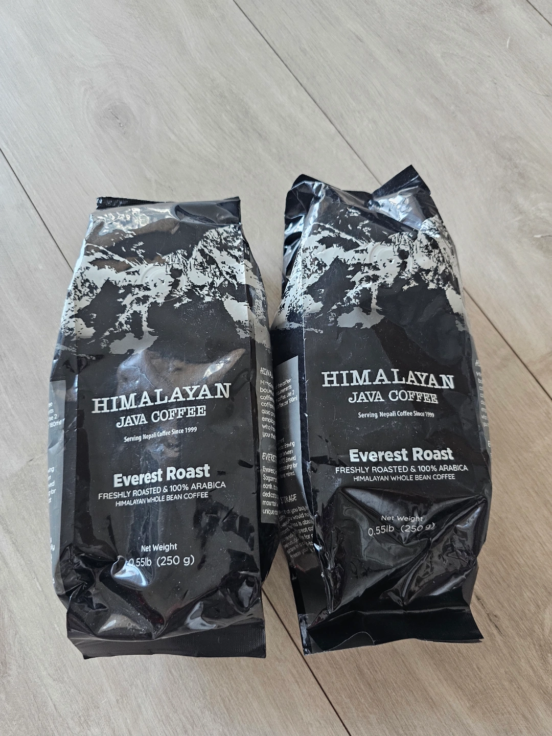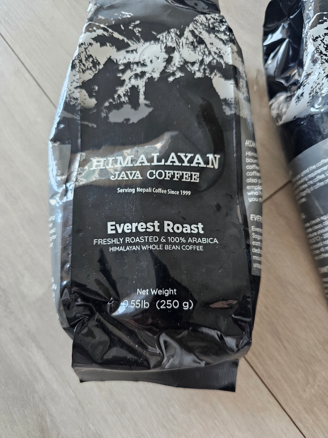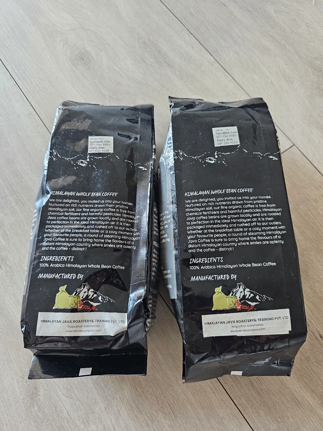 bagof Himalayan Java Coffee. One bag is Everest Roast, the other is Thamel Roast. Each bag weighs 0.55 lb (250 g). Freshly roasted and 100% Arabica Himalayan whole bean coffee. type is whole bean. I bought these whole beans from Nepal🇳🇵 amazing taste 👌 250g each $20 both $40