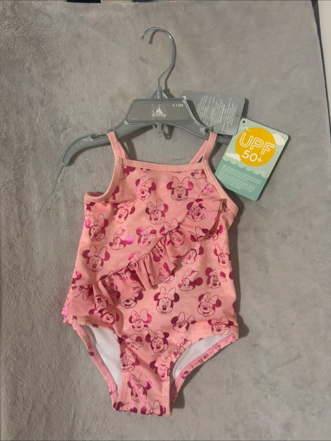 Adorable pink one-piece swimsuit. Features Minnie Mouse print. UPF 50+ sun protection. Size 9-12 months. Great for summer fun.