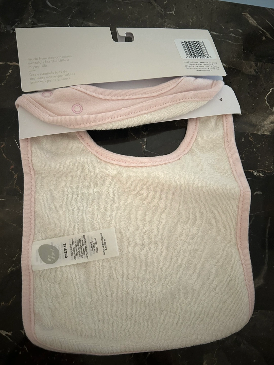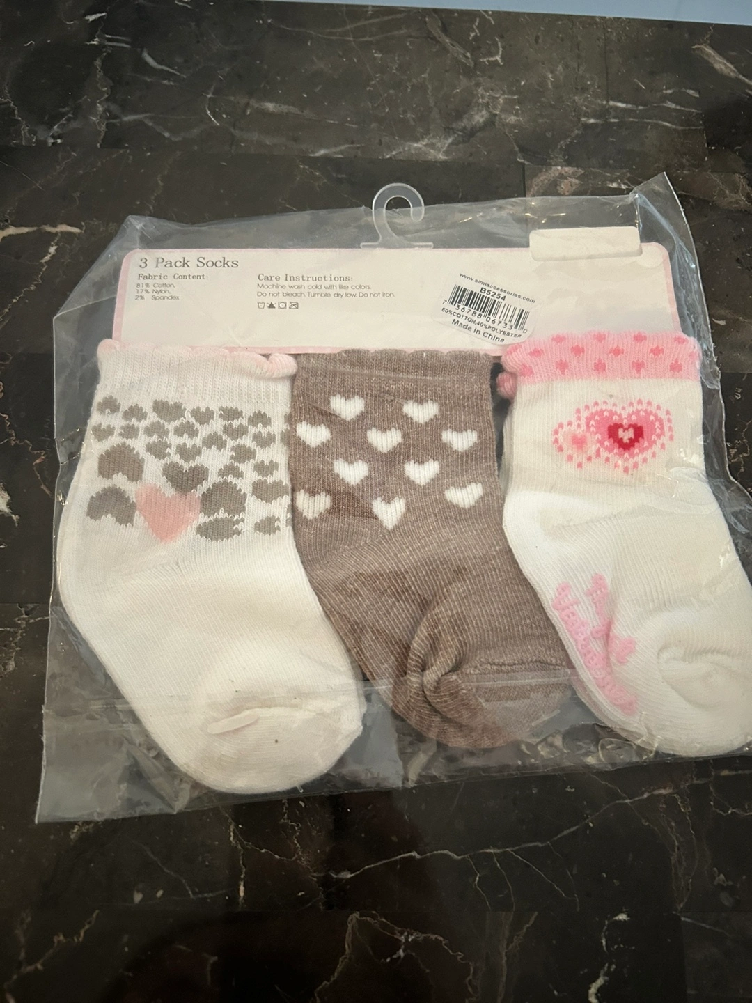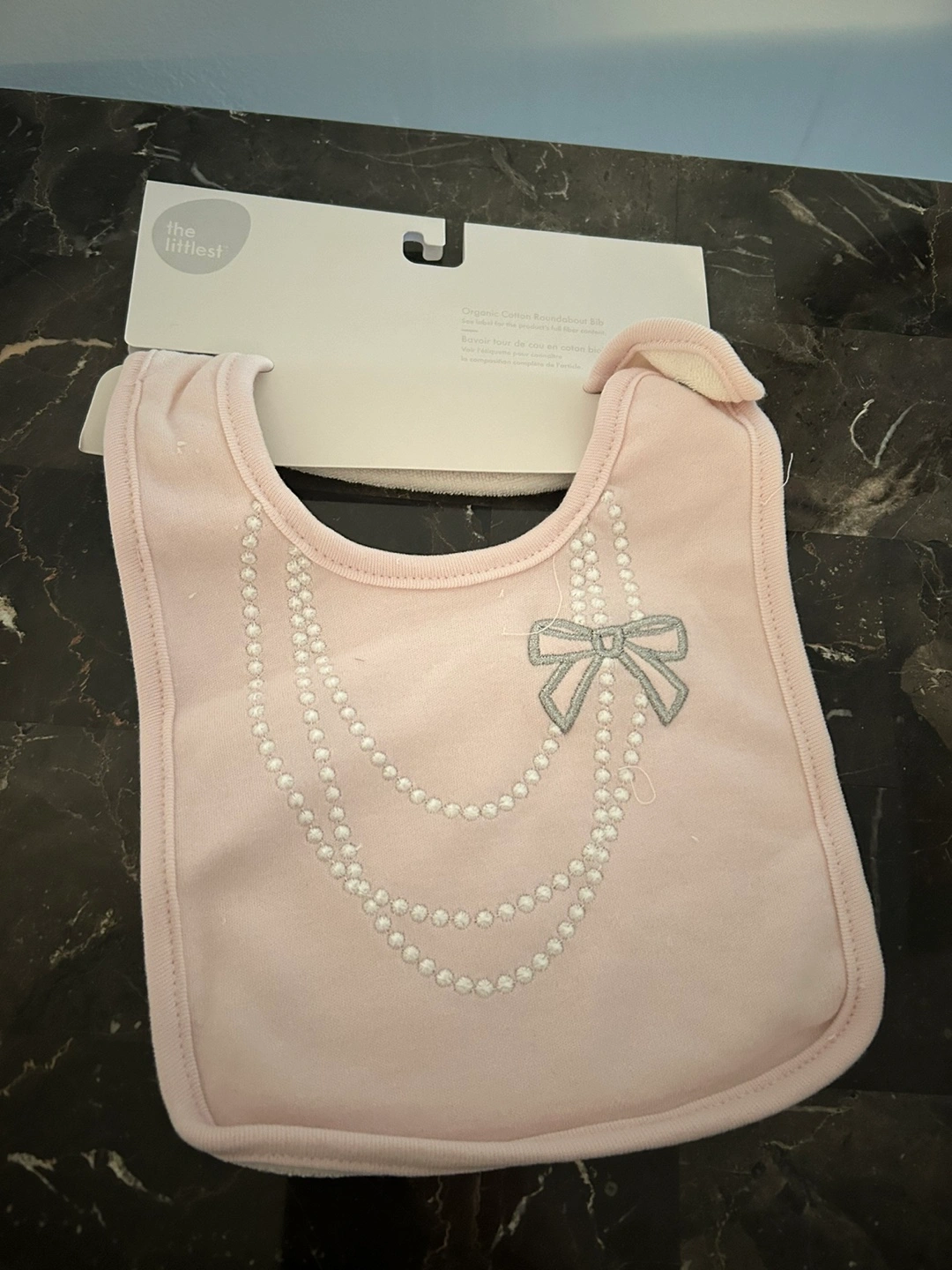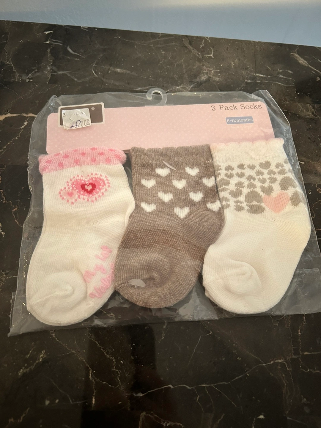 Newborn baby girl items. Includes one pink organic cotton bib with pearl necklace embroidery and three pairs of socks with heart patterns. Sock size: 6-12 months All brand new with tags.