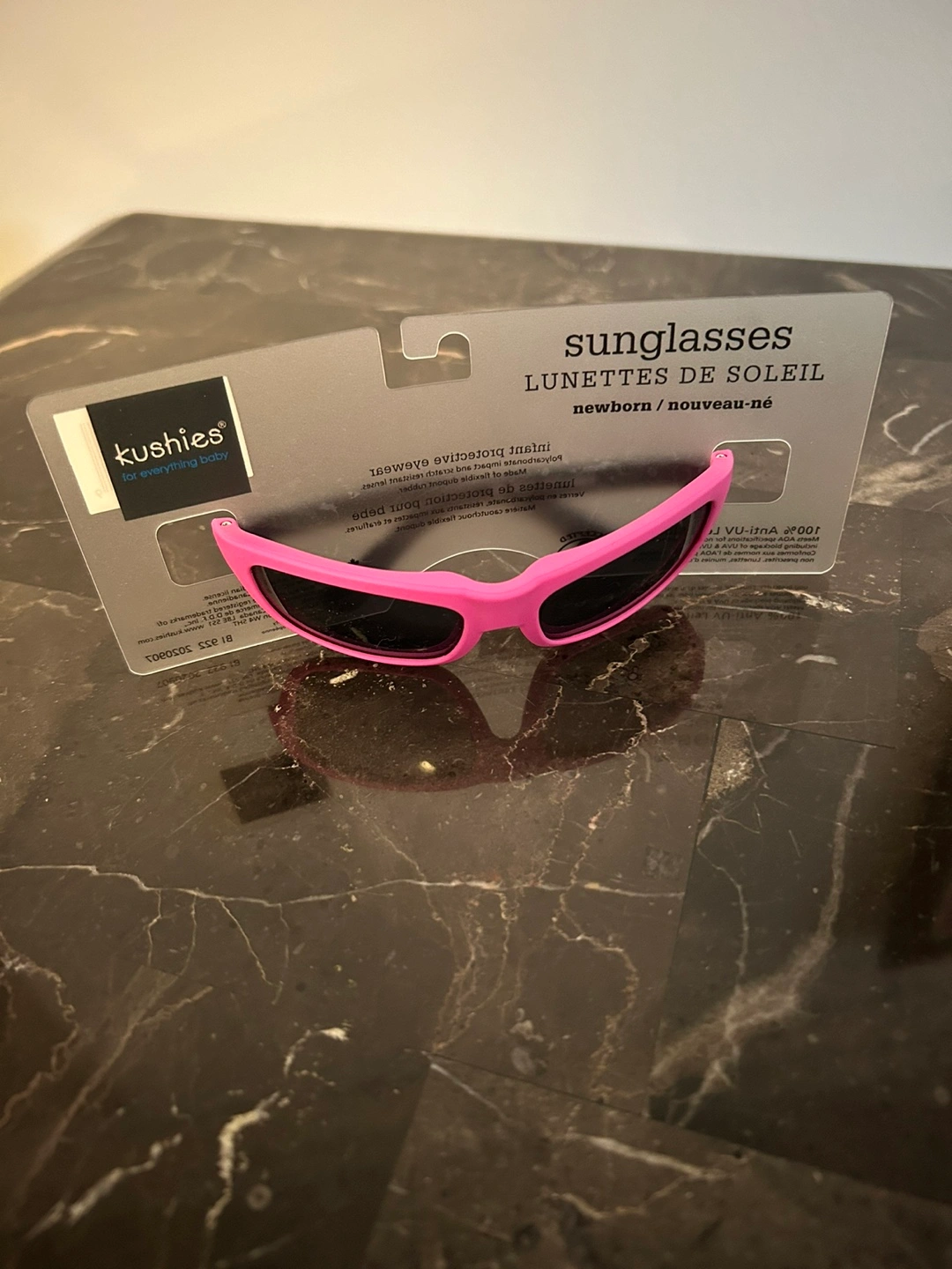 Pink infant sunglasses. 100% Anti-UV lens block. Flexible Dupont rubber. Newborn size.