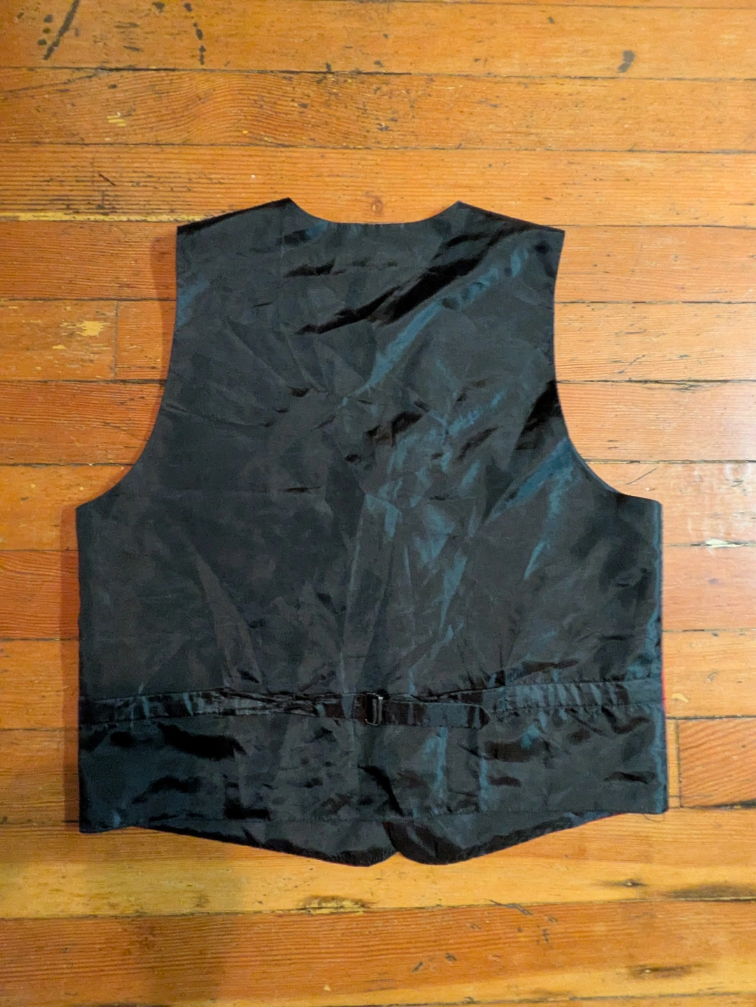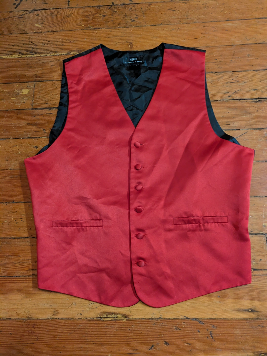 Men's red satin vest by Steven Land Size large. Black lining. Five buttons. Two pockets. Adjustable back. Pick up in the West End of Vancouver