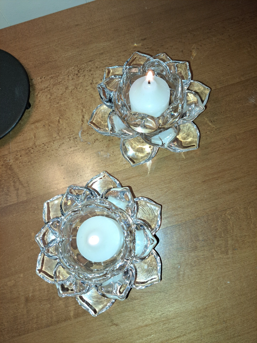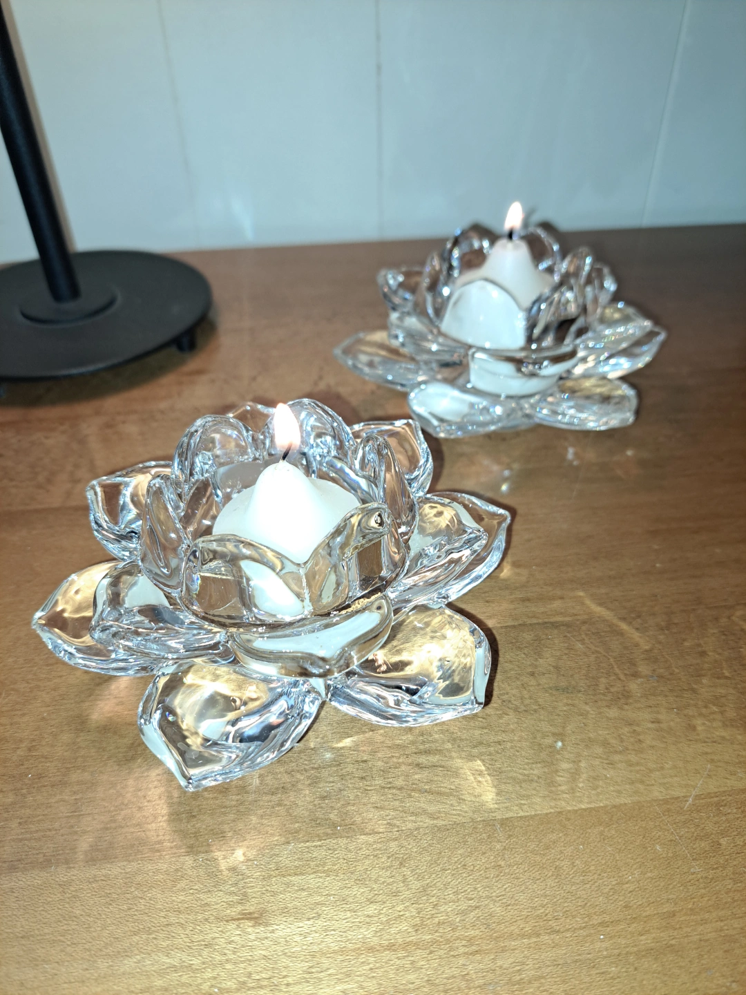 Two lovely Partylite glass candle holders. Shaped like lotuses. Clear glass. Perfect for adding a touch of elegance to your home décor. Holds tealights and votives candles. non smoking home cash only