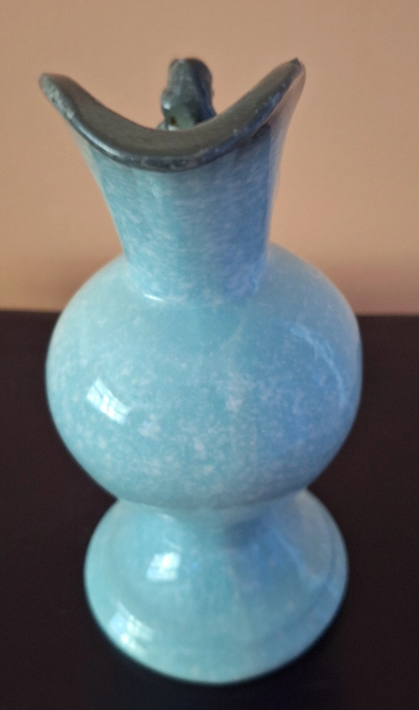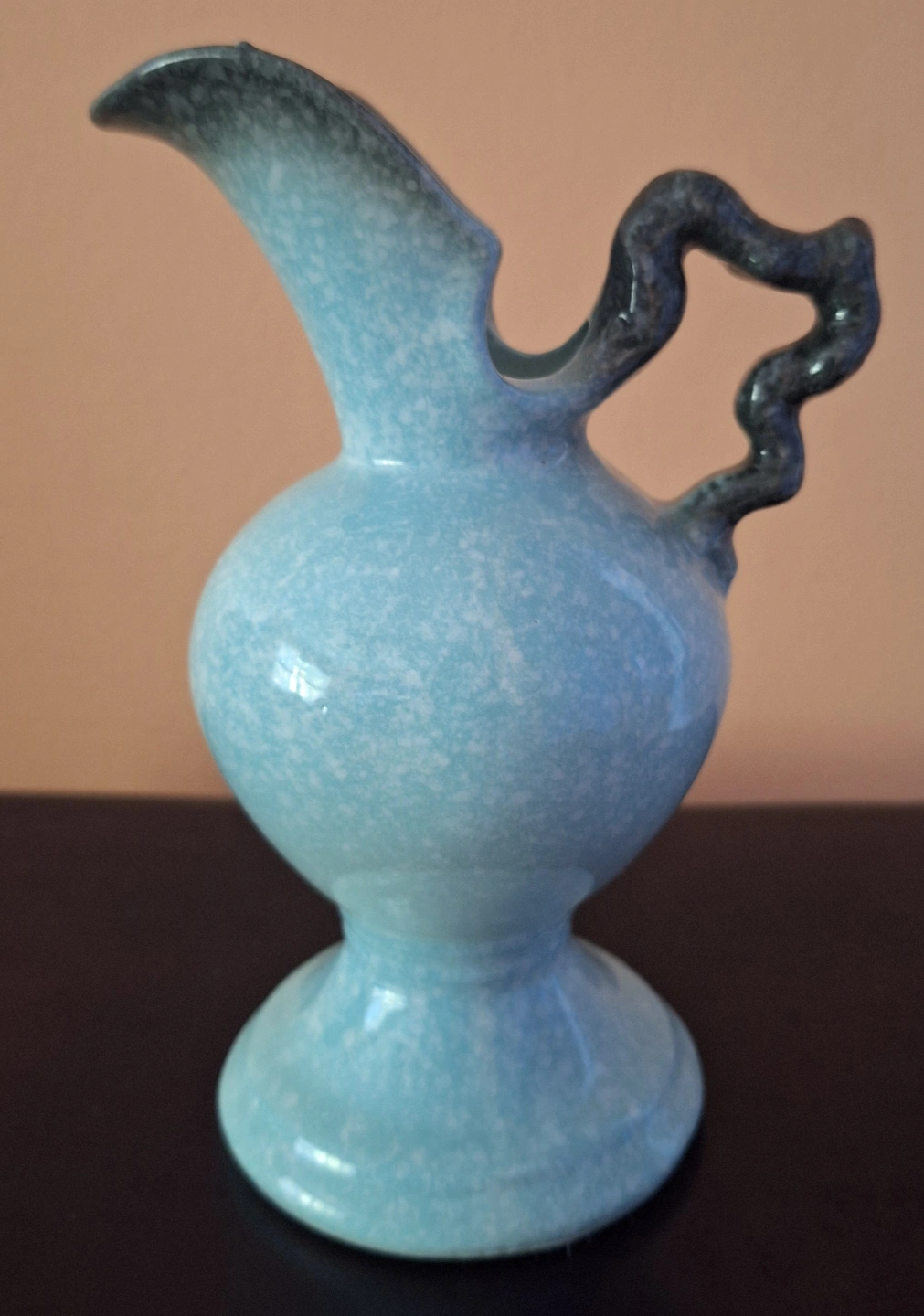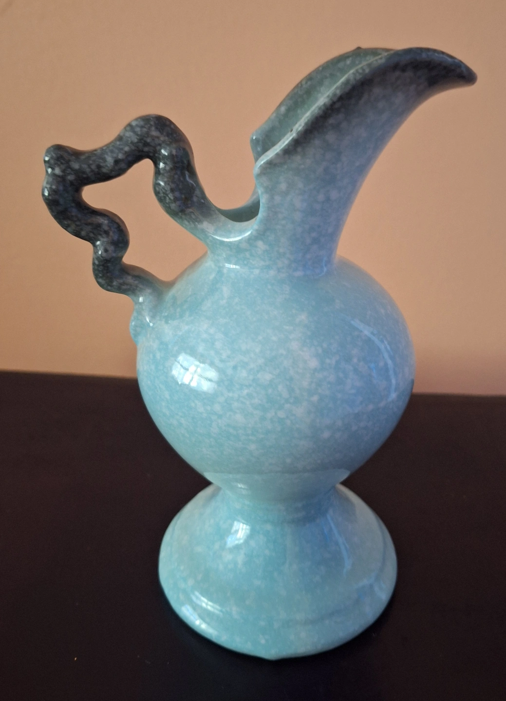 Small ceramic pitcher, vase. Light blue glaze with speckles. From 1950s, made by Hull in USA. Dark grey handle. Unique design.