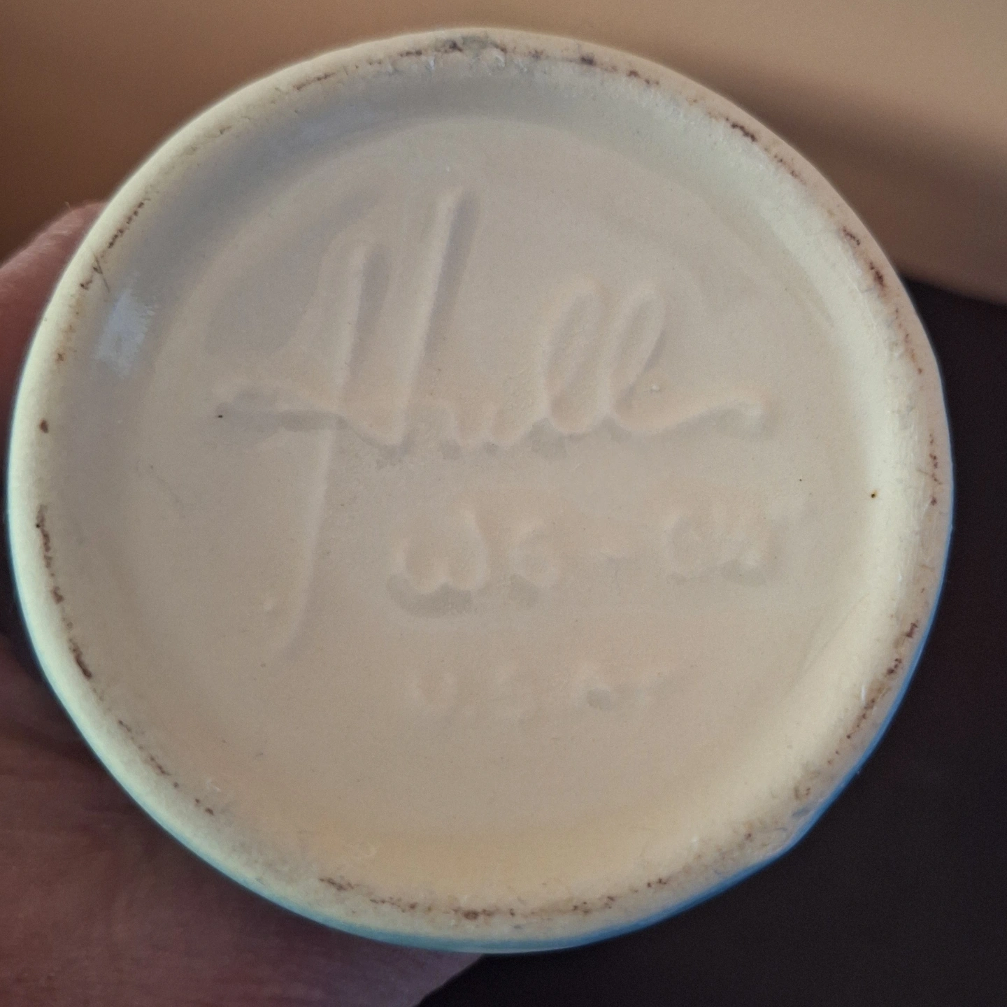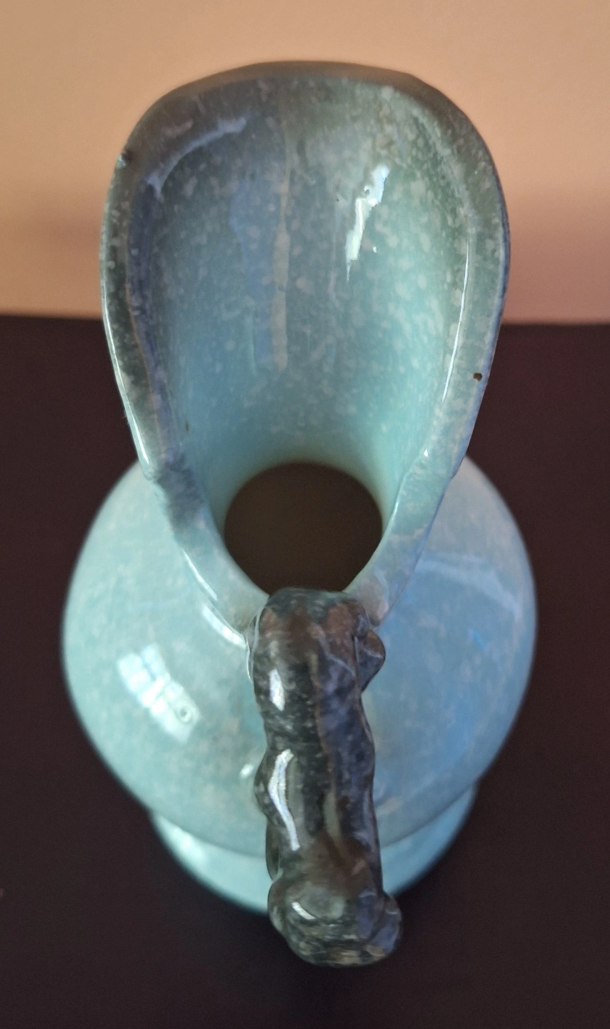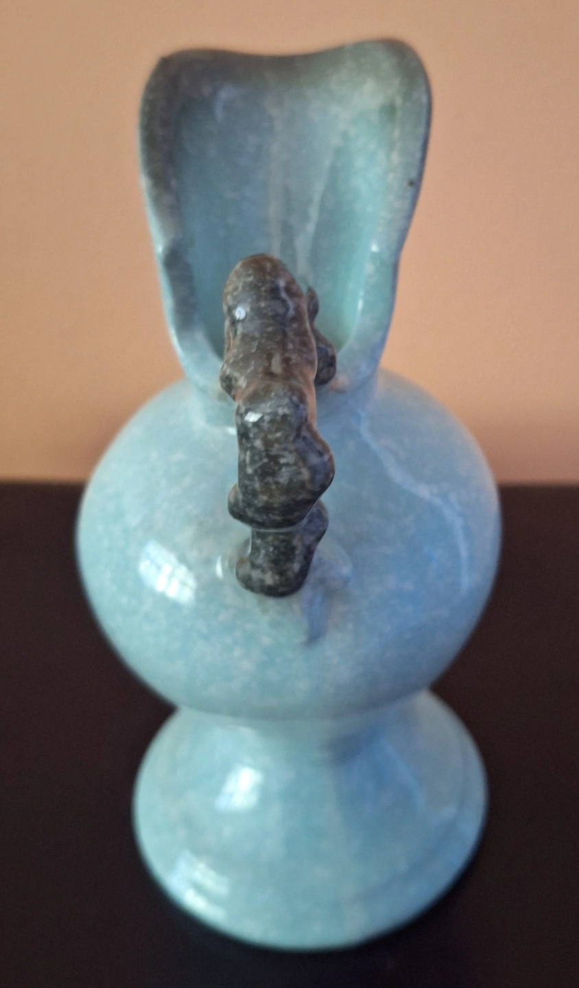 Small ceramic pitcher, vase. Light blue glaze with speckles. From 1950s, made by Hull in USA. Dark grey handle. Unique design.