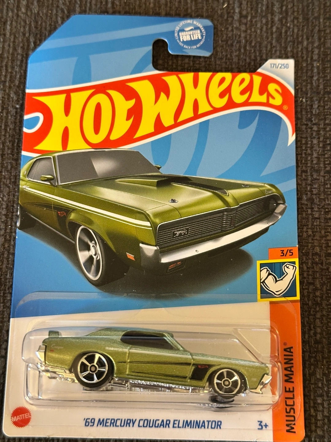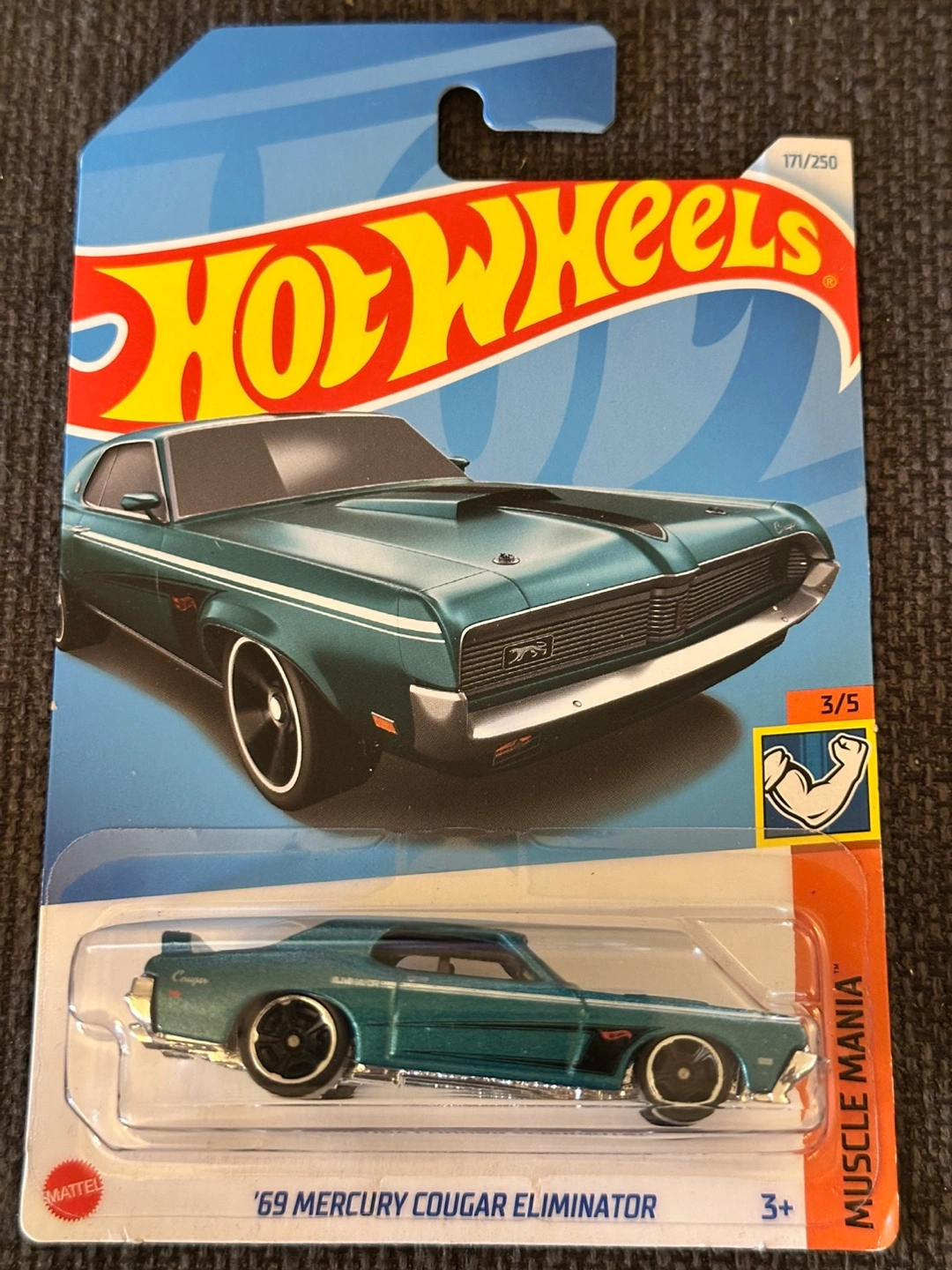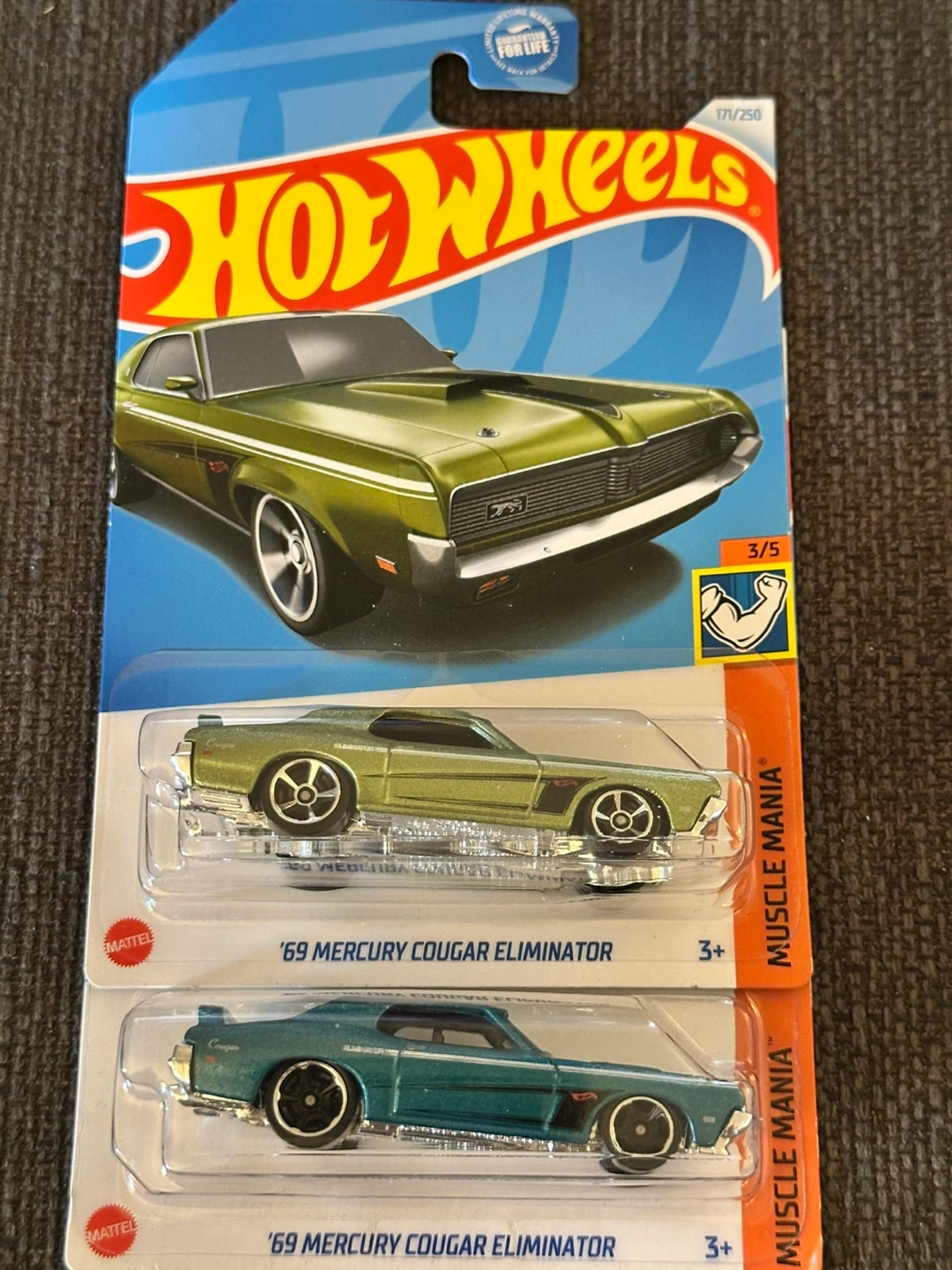 Two Hot Wheels Muscle Mania diecast cars. Green and Teal. Number 171/250. Collectible.