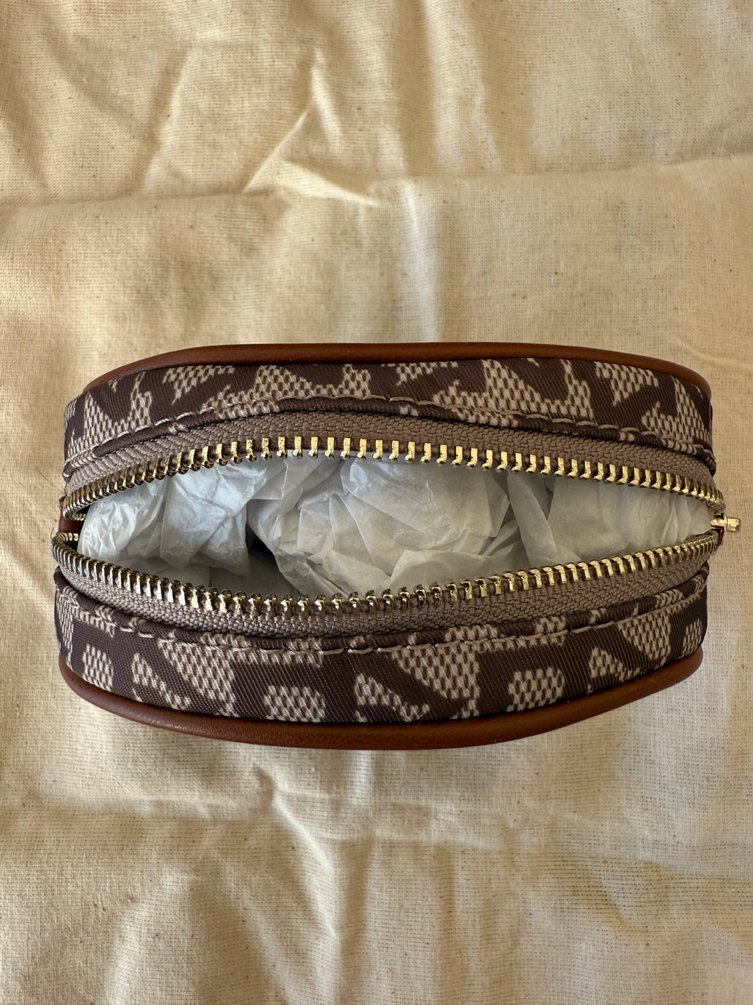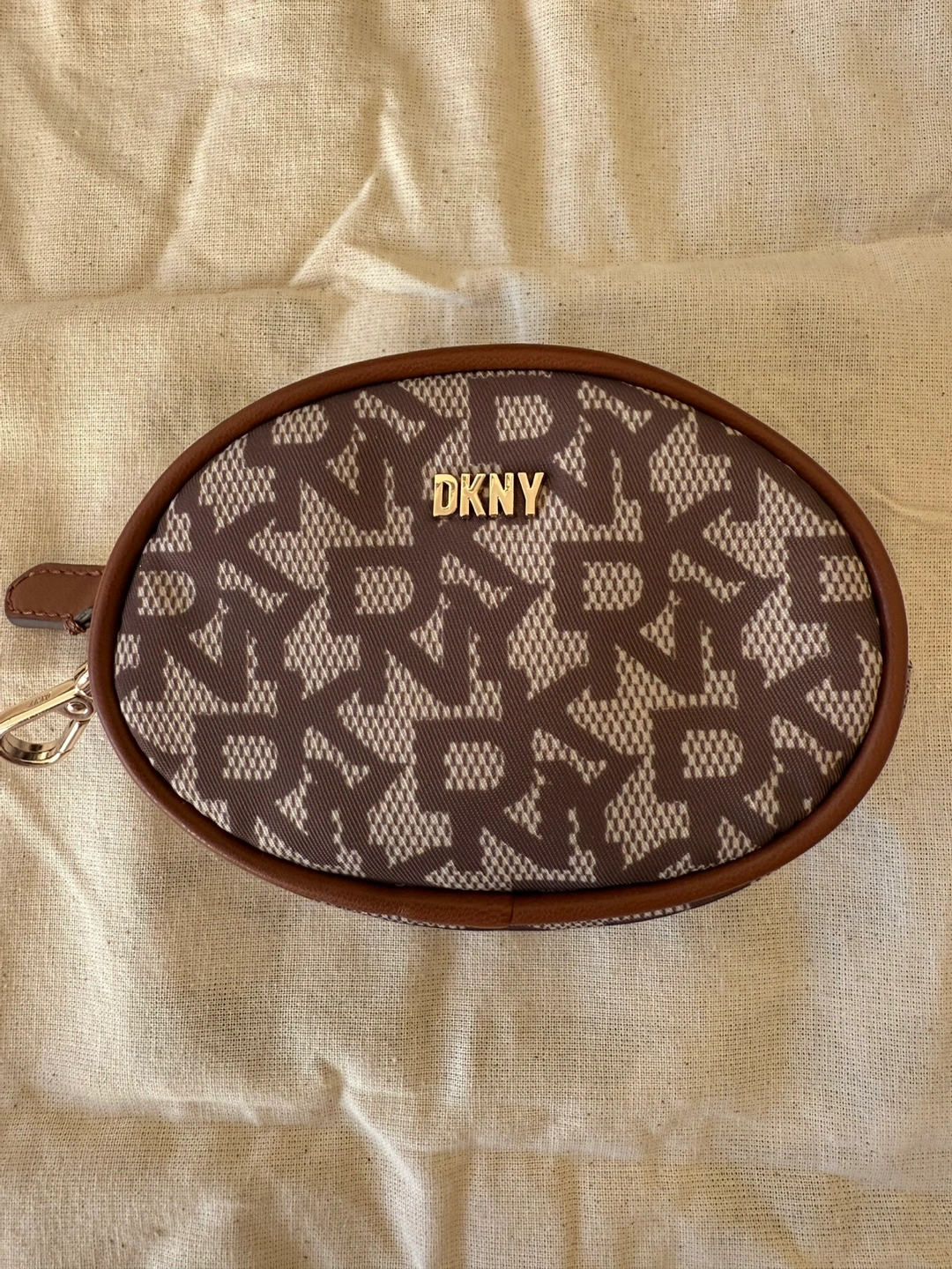 DKNY Cash/Coin Pouch Brand-new! ***This DKNY purse is perfect for keeping your essentials organized in style. ***The compact oval design features the iconic DKNY logo pattern and a secure zip-around closure. ***Brown and beige pattern ***The lining has a brand name in gold lettering all around. ***It also comes with a carabiner (metal loop) on the side: great for holding keys! DIMENSIONS: (in inches approx.) Width: 4" Length: 3" CONDITION: 10/10. New, never used.