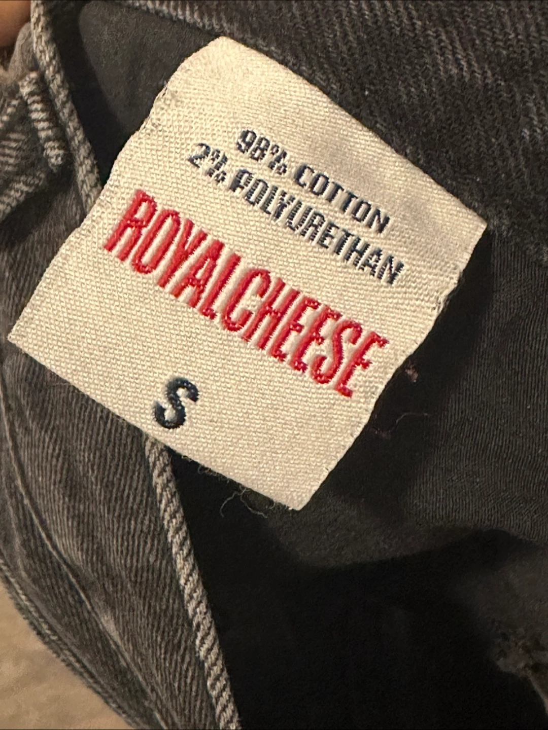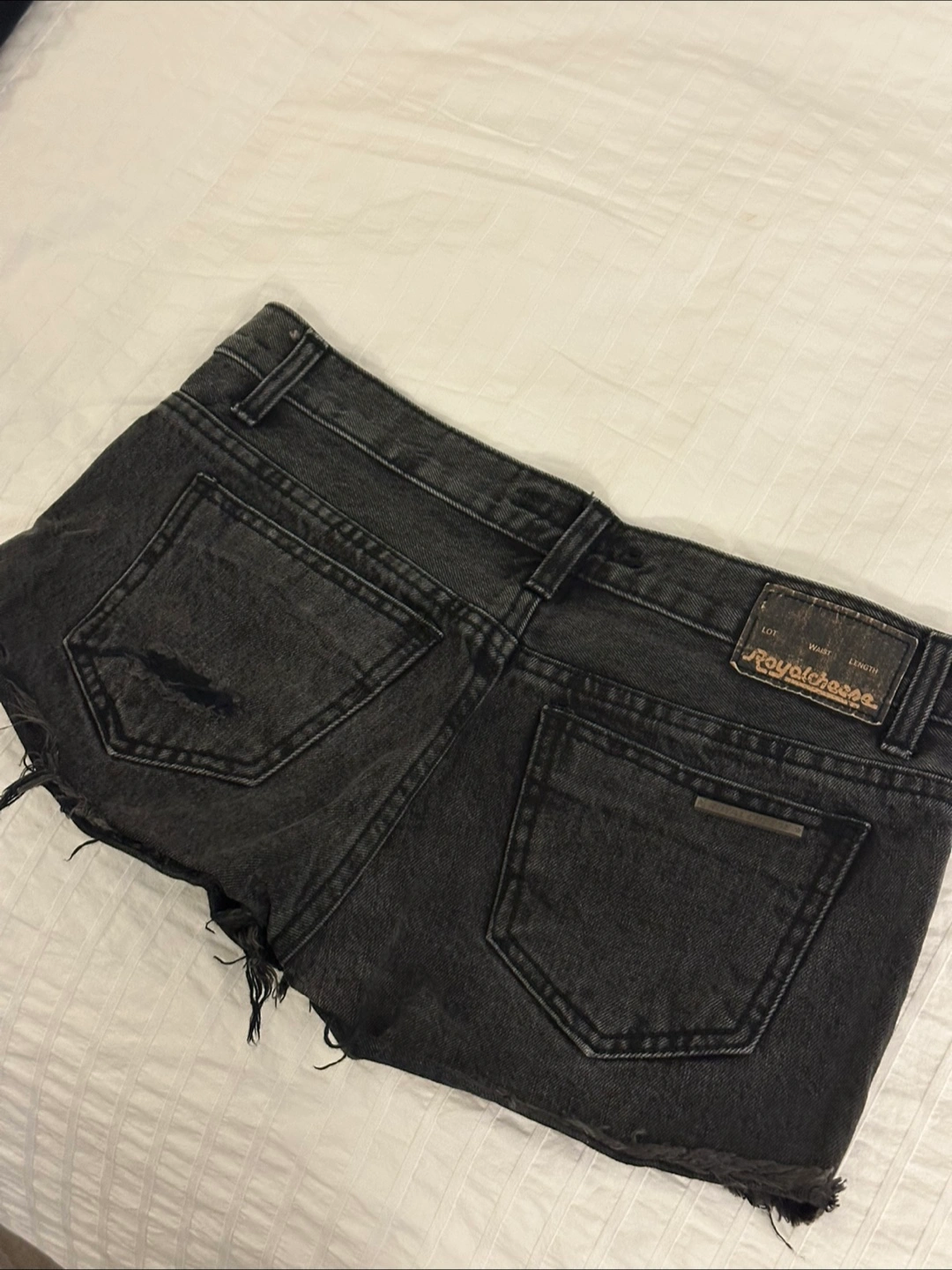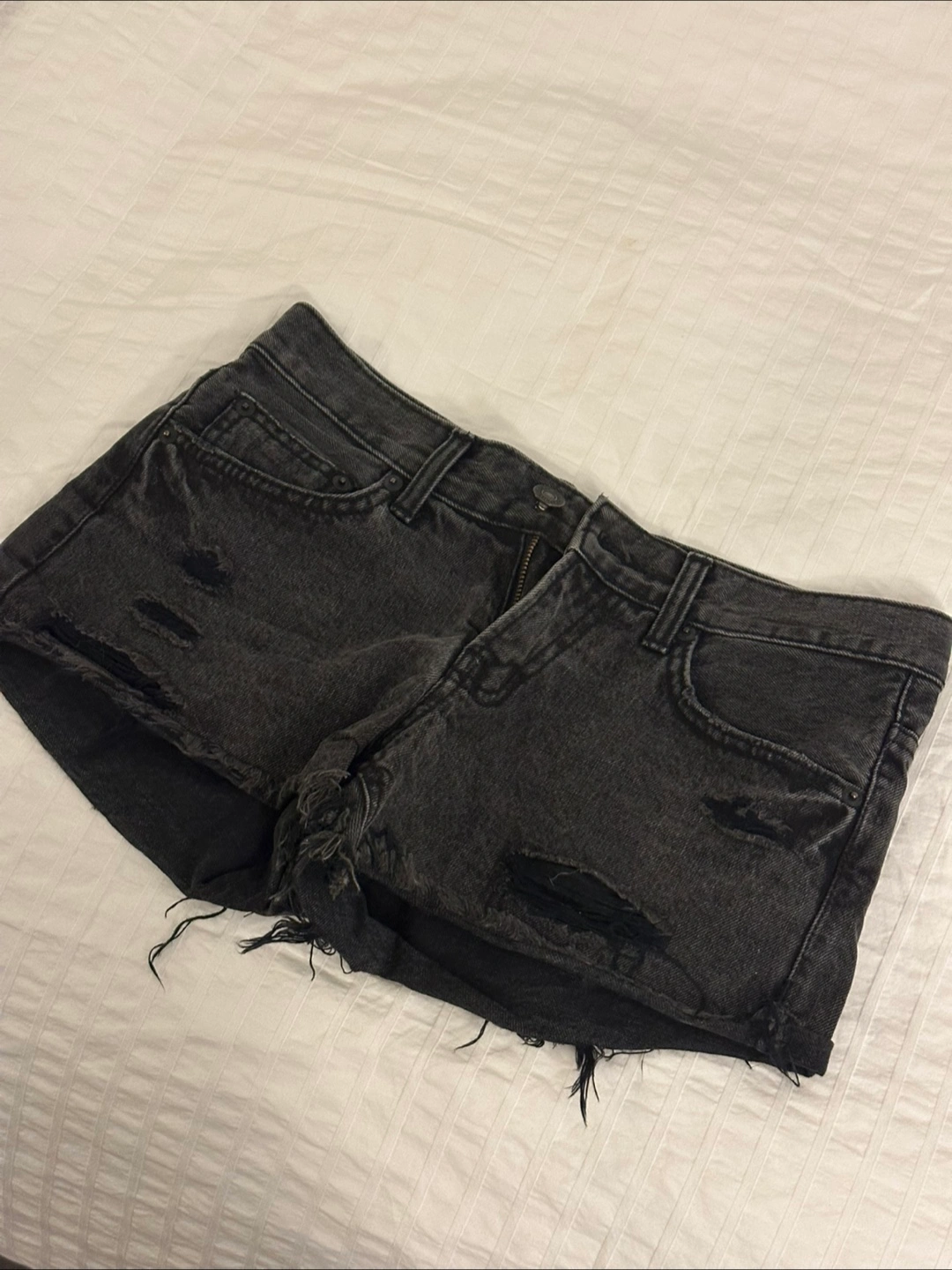 Distressed denim shorts. Size small. 98% cotton, 2% polyurethane. Dark grey wash.