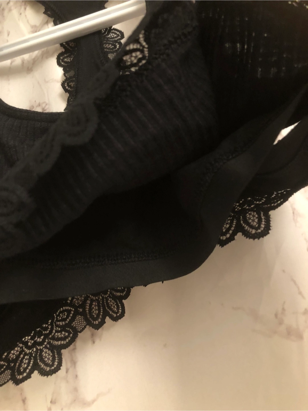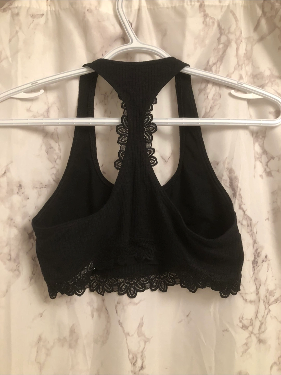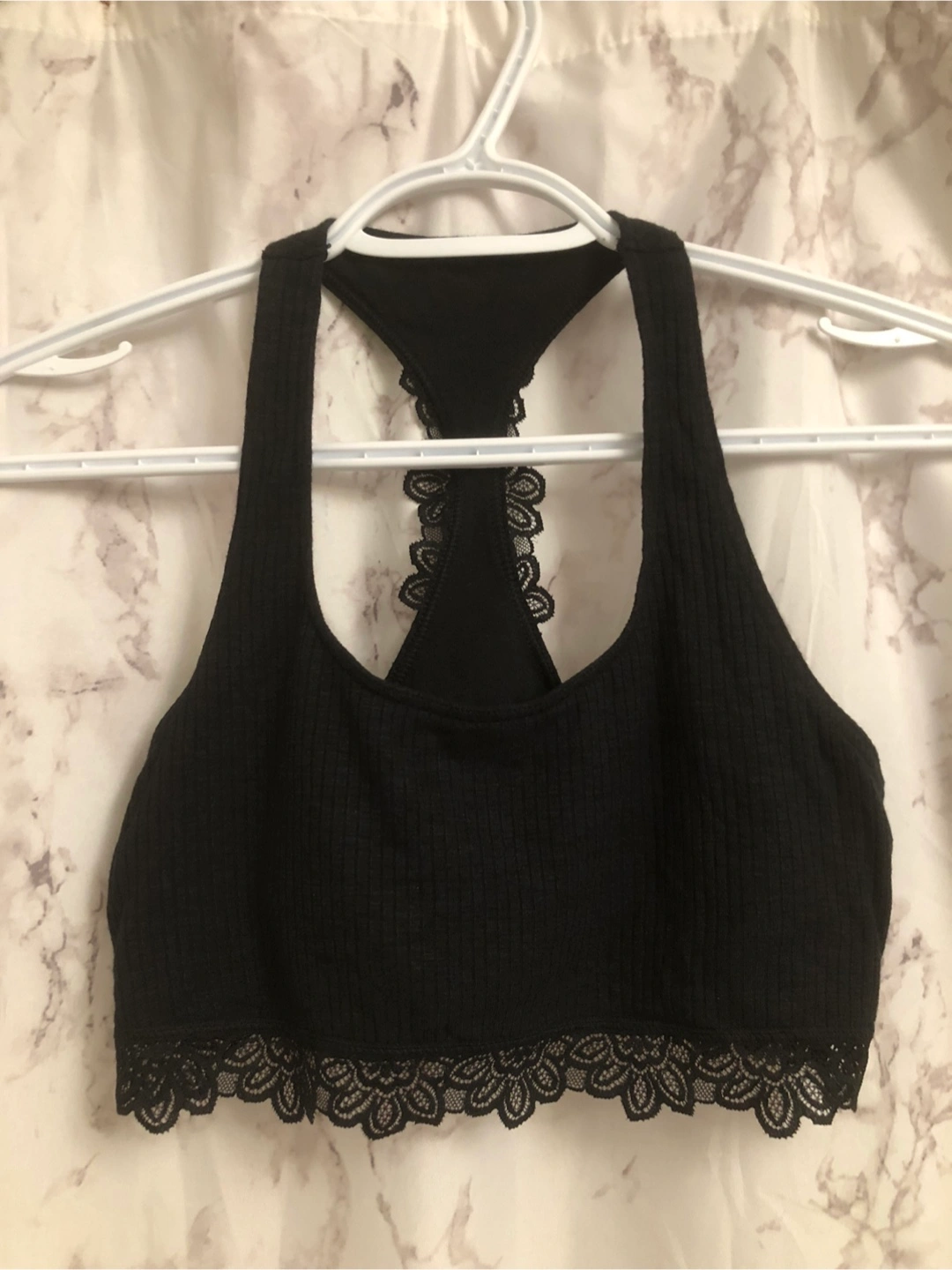 Black ribbed bralette. Racerback style. Lace trim along neckline and bottom hem. Comfortable and stretchy material.