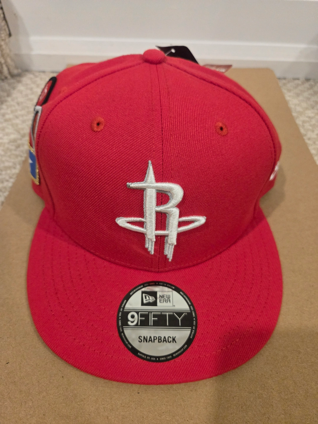 Red Houston Rockets hat. Features various embroidered patches. New Era 9Fifty snapback. Size adjustable. Rare cap. official cap worn by NBA players