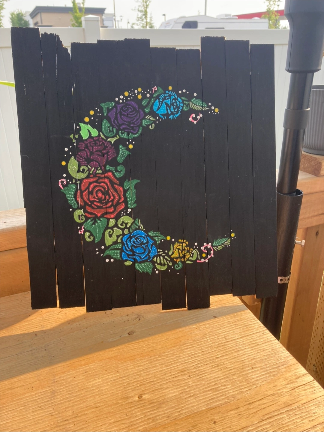 Unique piece. Crescent moon shape. Painted multicoloured roses and leaves. Dark stained wood background. Rustic farmhouse style. Perfect for home decor.